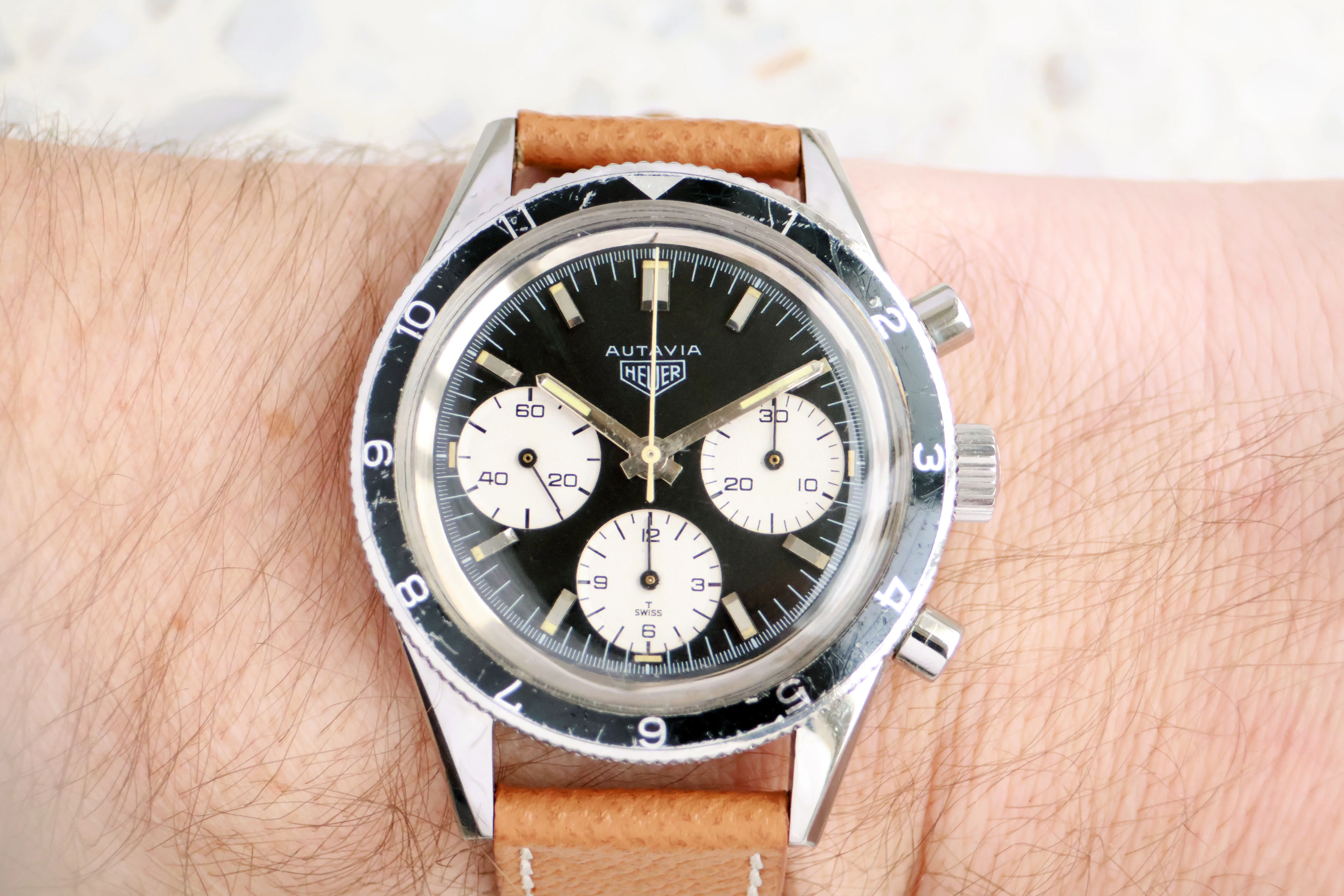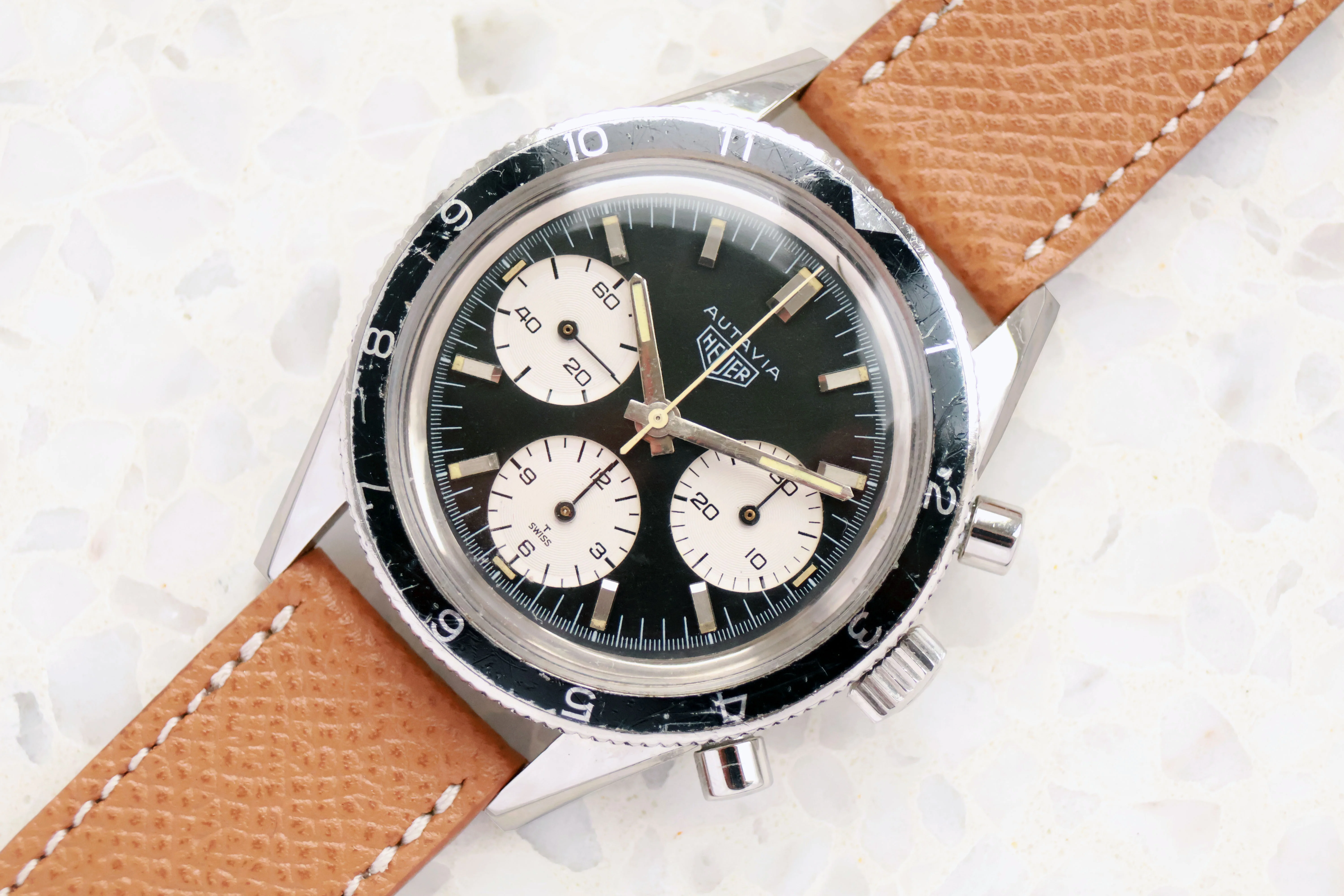 Heuer 2446 rindt in a very nice condition. These watches are not waterproof and were often abused in the 60ies and 70ies. That's why most of the time you will find dials in a very bad condition and cases which are overpolished. Both case and dial are in a very good condition on this example.