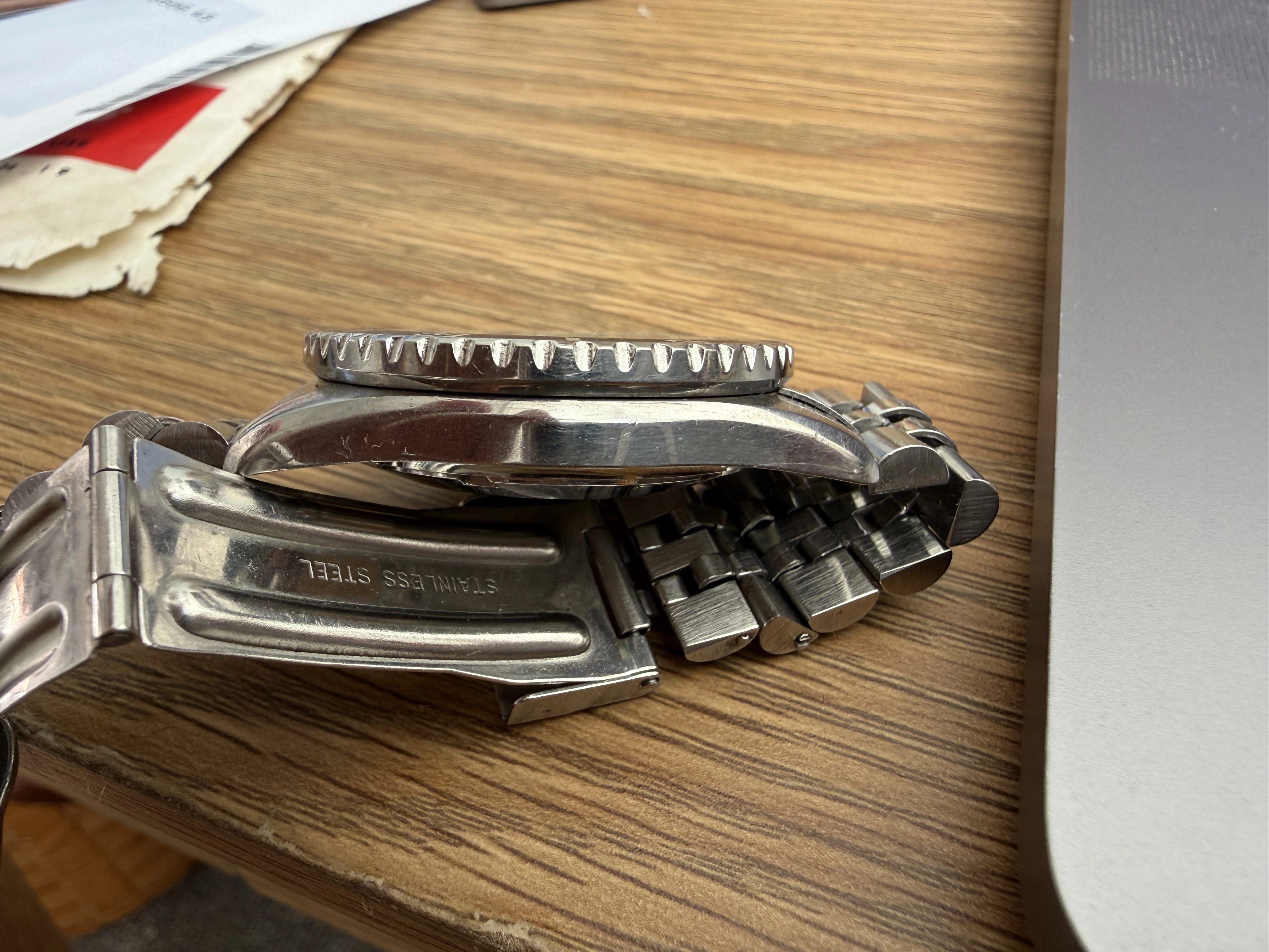 The watch has acquired a very interesting and, to my eyes, pleasant dark hue to the lume from slight water ingress at some point in the past. There is a small crack in the second hand lume but all other lume is present and intact but has turned to a grey green colour. The darkened lume also no longer reacts to light, except for the bezel lume pip which is still bright and unaffected.