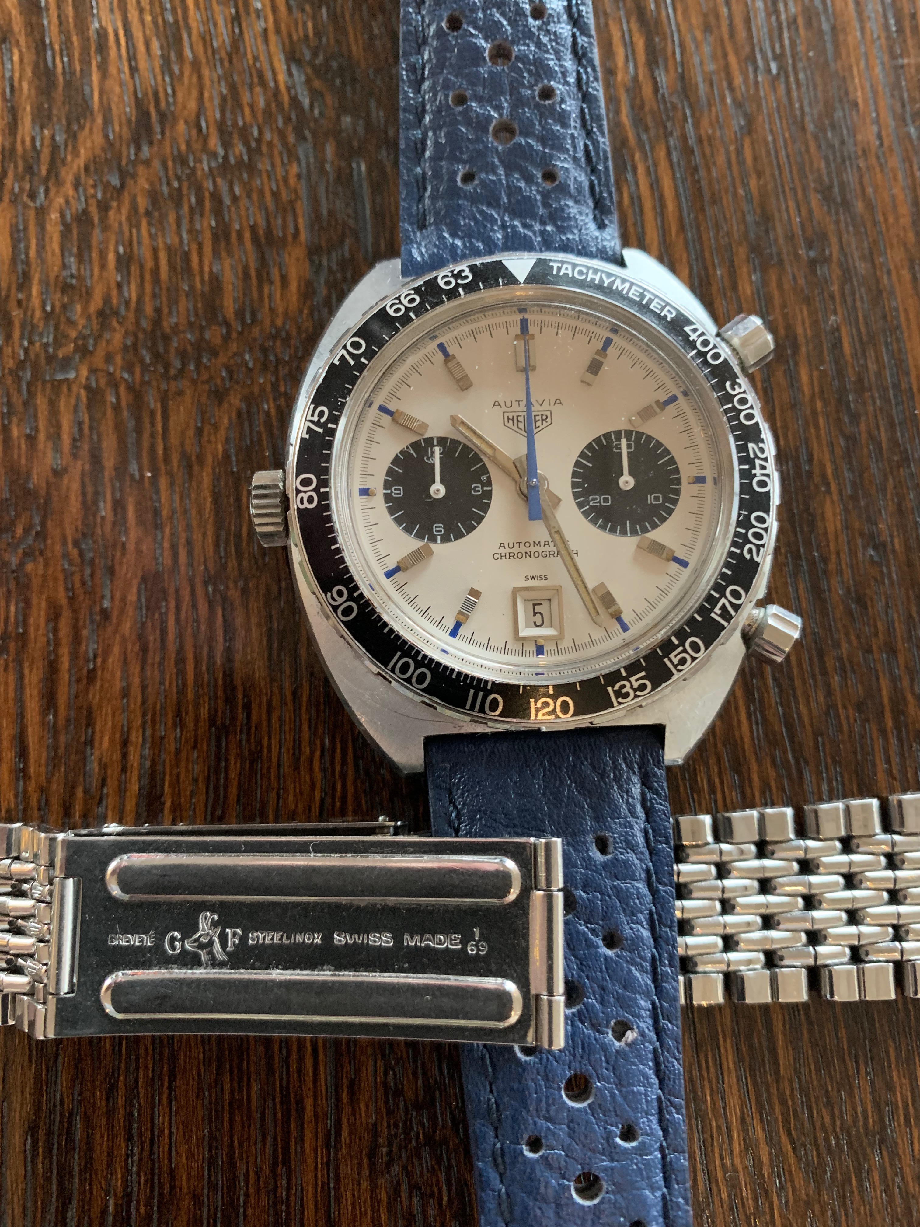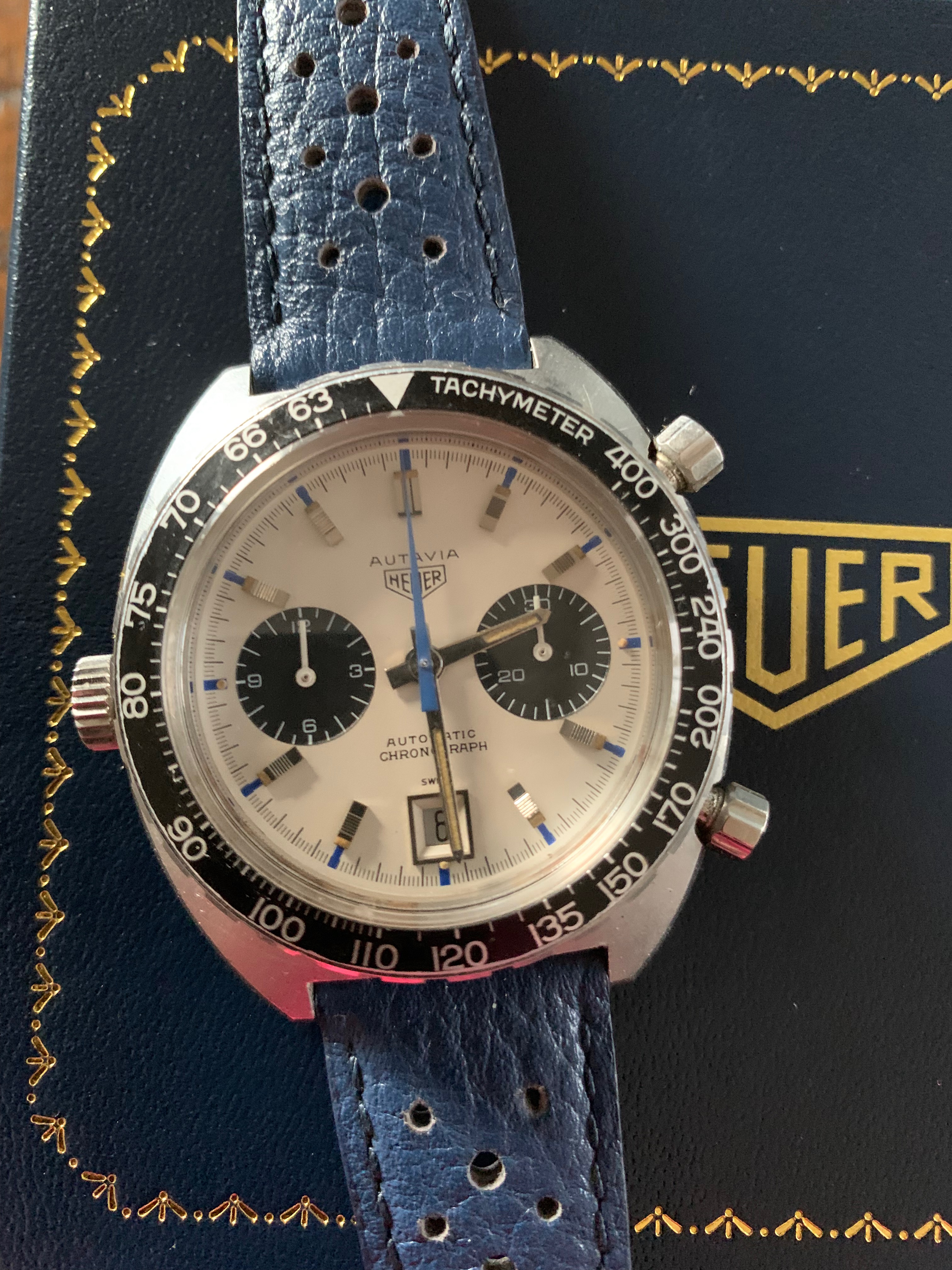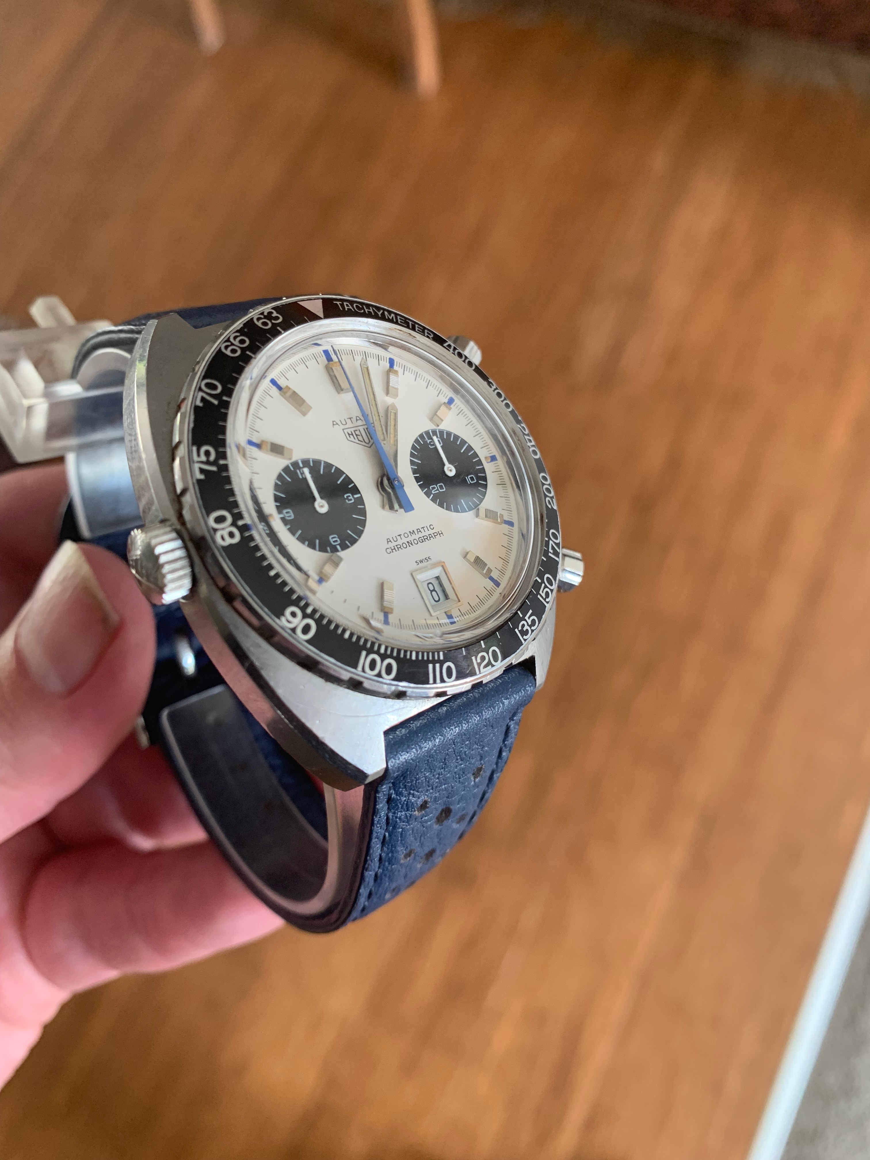 Most show the watch on a period leather rally strap with reissue Heuer buckle (which of course comes as part of the offering). I swapped out the GF bracelet (which have no reason to believe isn't original to the watch) very soon after receipt for safe keeping, but I also personally prefer the feel of leather (plus the blue strap really sets off the dial accents...). Pics showing head on the bracelet have the hour sub-dial not reset to zero - this was subsequently sorted with replacement of the hangman screw noted above. The movement shots were taken during the service in late 2020.