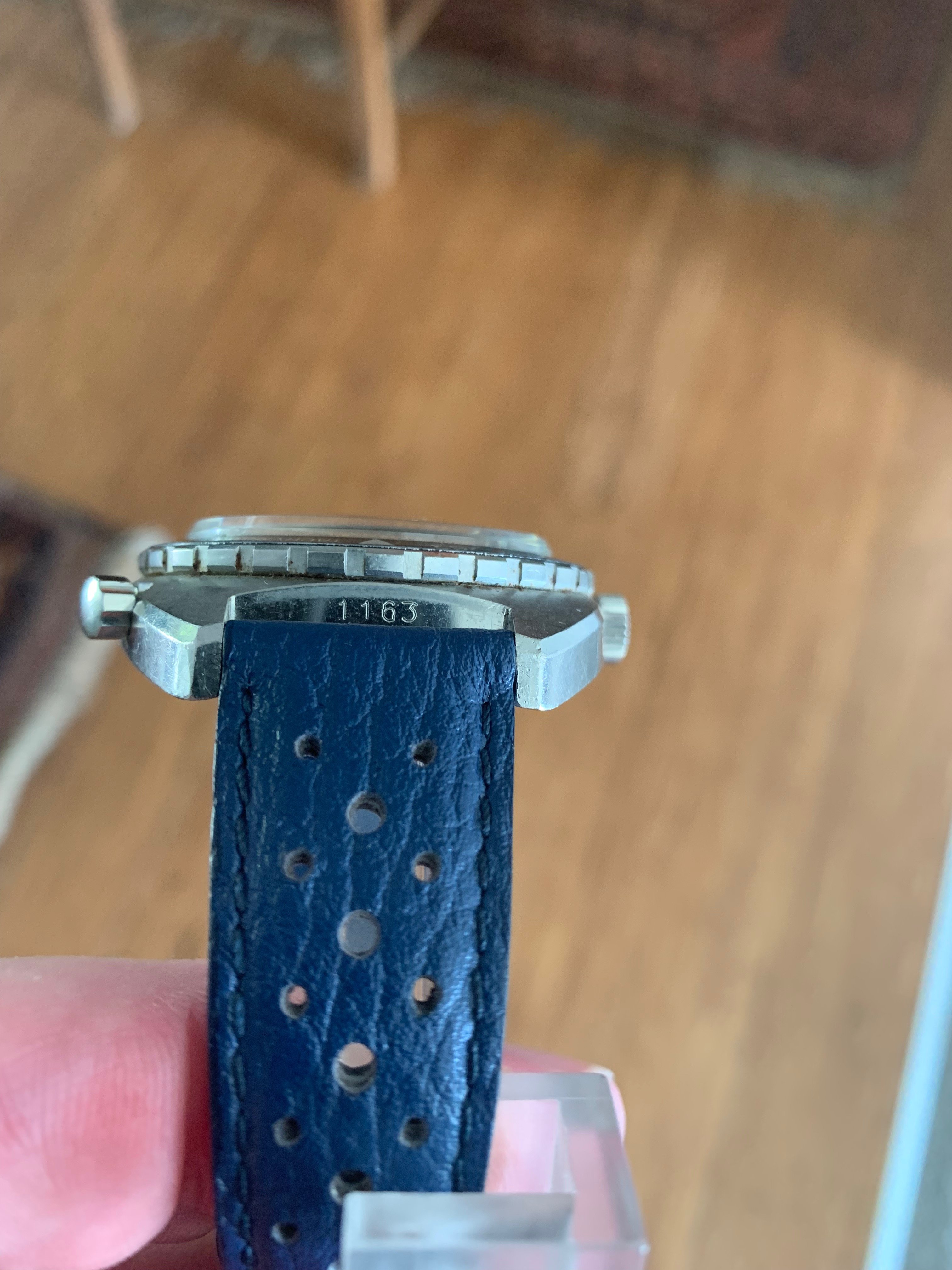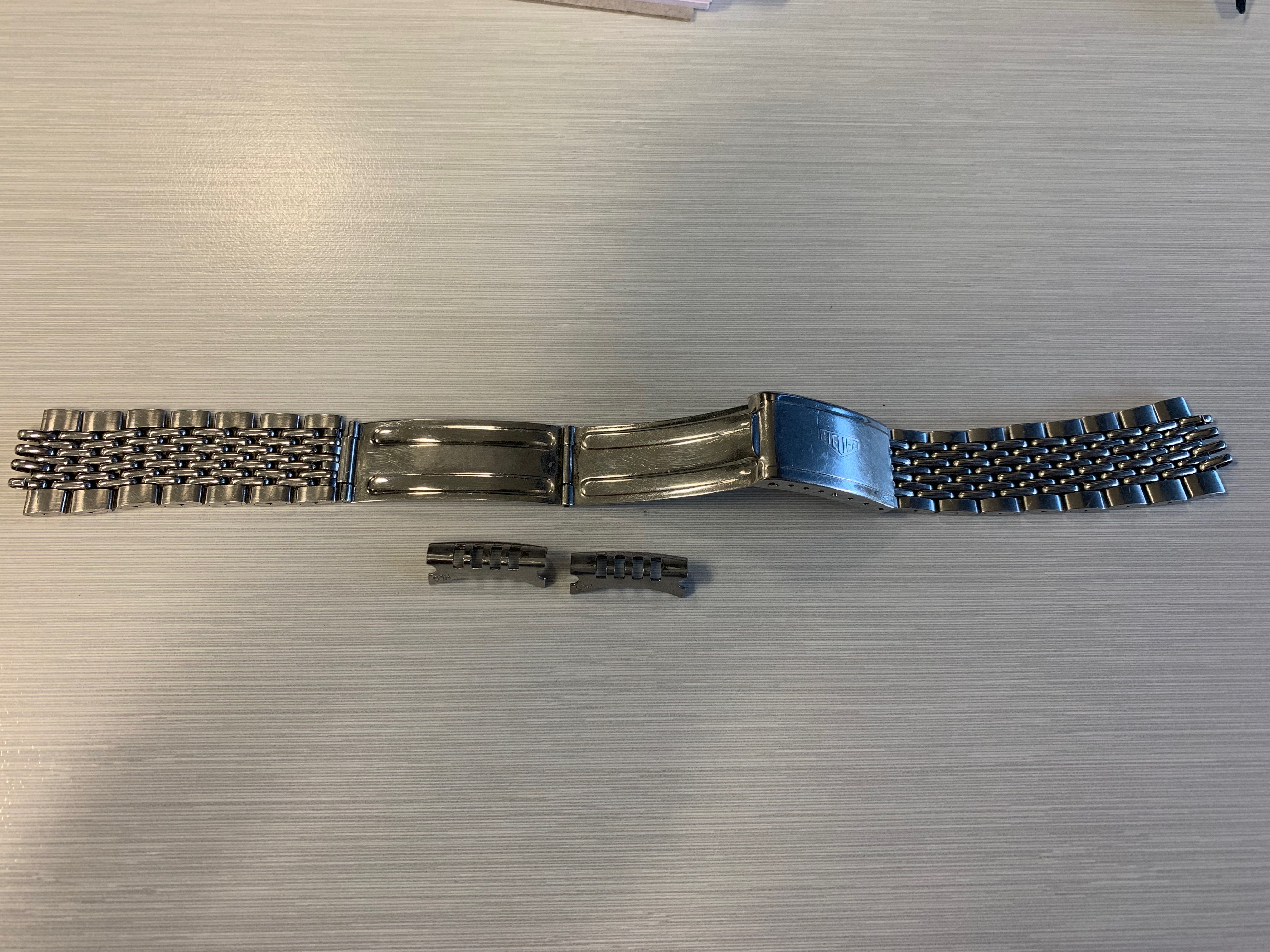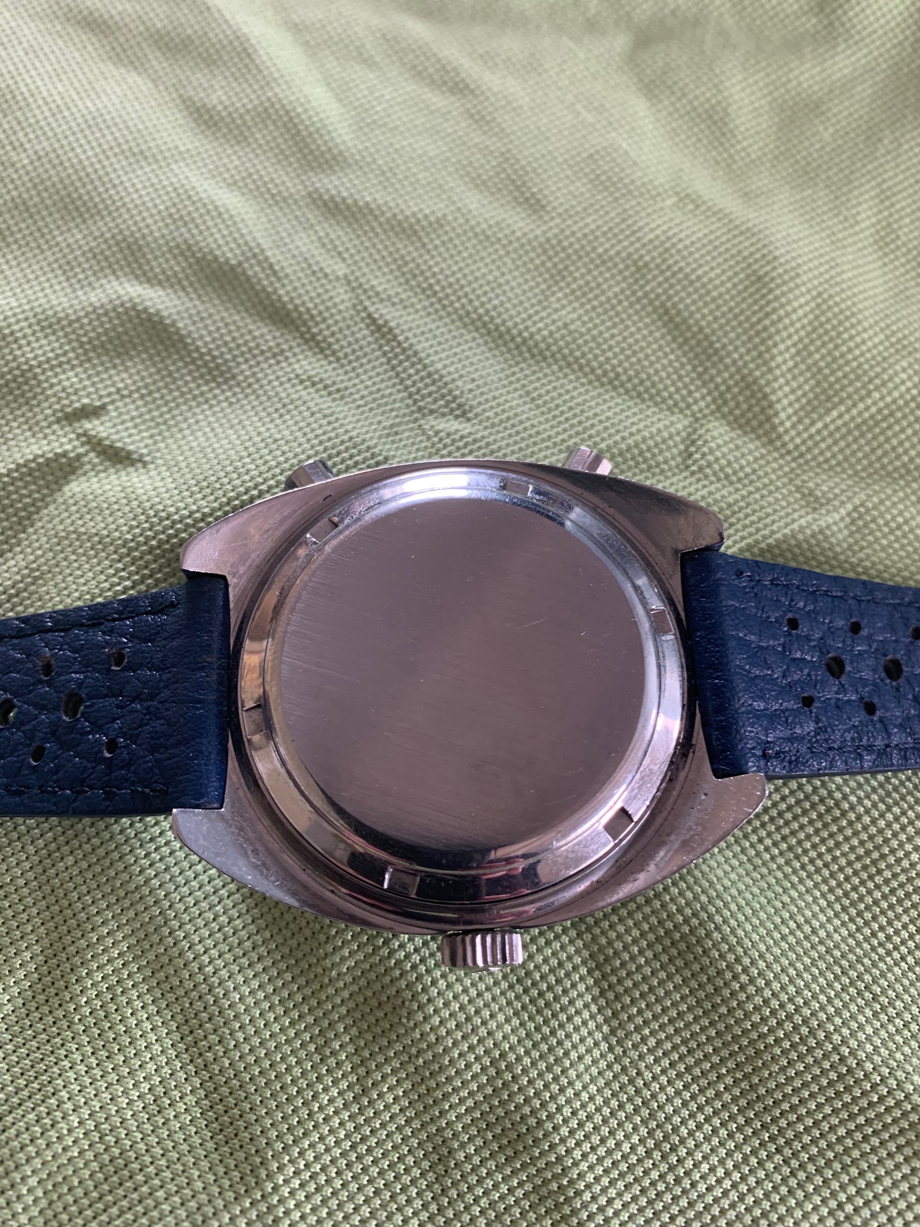 Most show the watch on a period leather rally strap with reissue Heuer buckle (which of course comes as part of the offering). I swapped out the GF bracelet (which have no reason to believe isn't original to the watch) very soon after receipt for safe keeping, but I also personally prefer the feel of leather (plus the blue strap really sets off the dial accents...). Pics showing head on the bracelet have the hour sub-dial not reset to zero - this was subsequently sorted with replacement of the hangman screw noted above. The movement shots were taken during the service in late 2020.