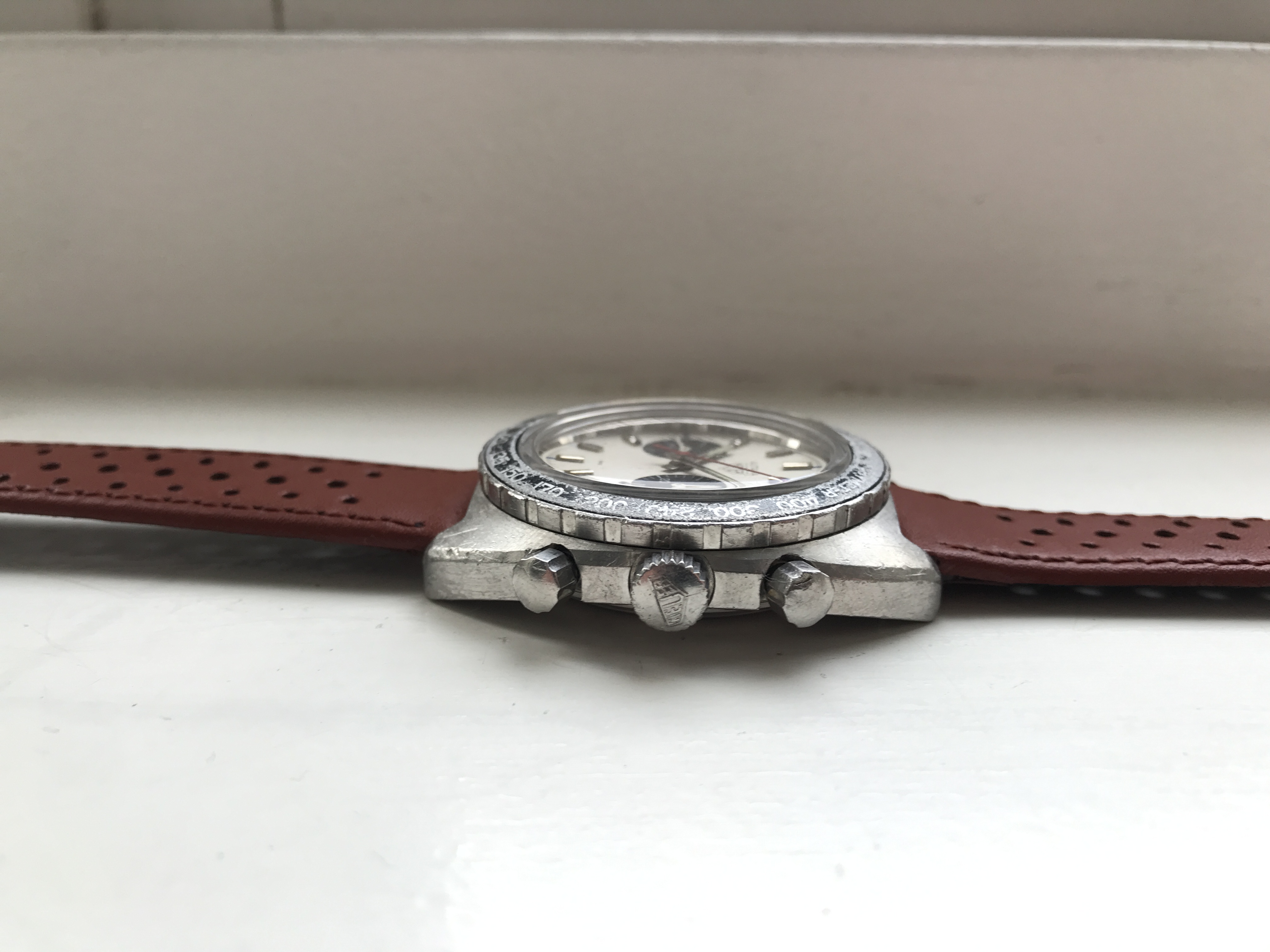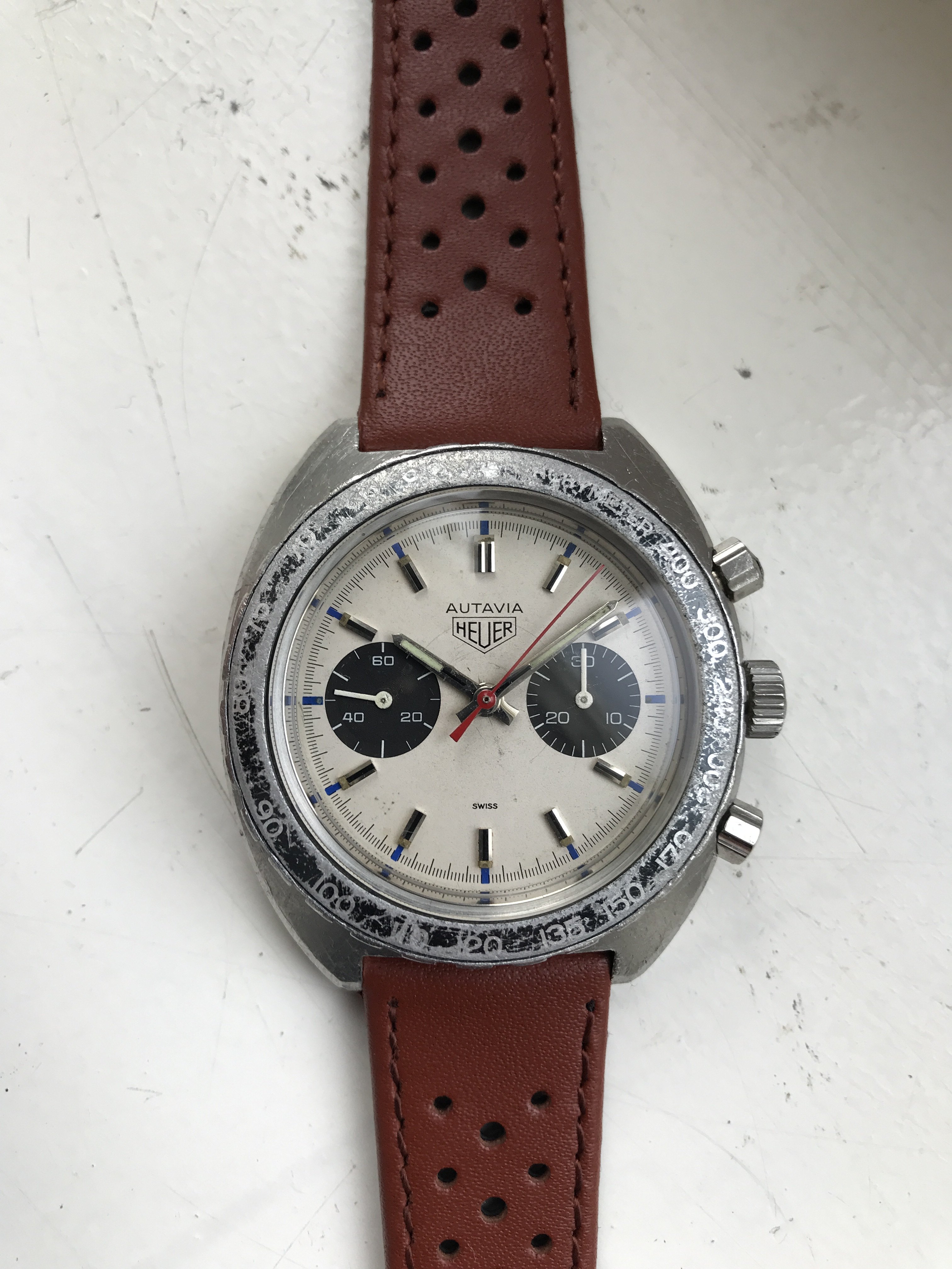 ··not the sharpest pencil in the ΩF drawerFor sale a Heuer Autavia 73363. A rare model in itself, but especially with this dial. Case: 42mm. Movement: Valjoux 7733 (hand wind). Service Q4 2022. Of course everything works as it should. Watch has clearly been used. Dial shows - not extremely visible but they are there - some drag marks. Strap is new. No further accessories.