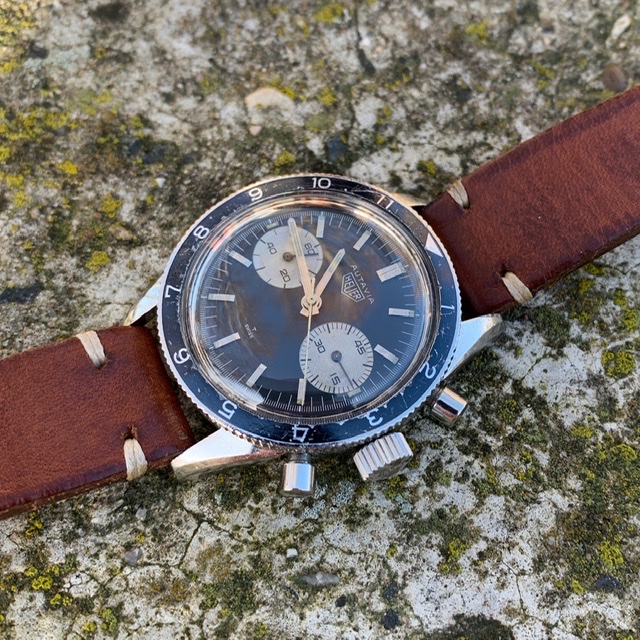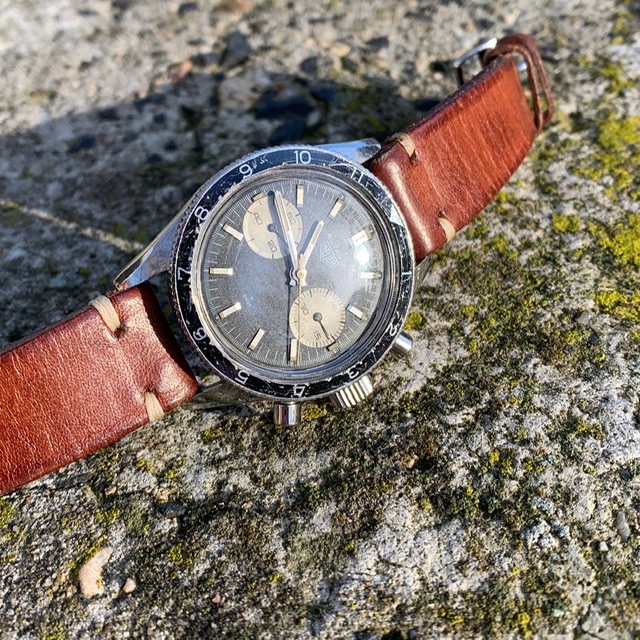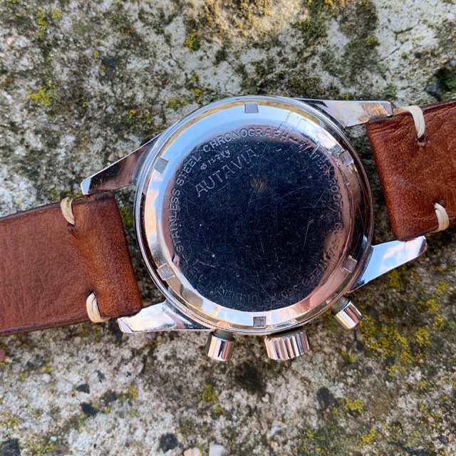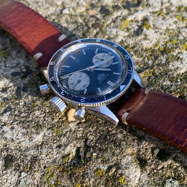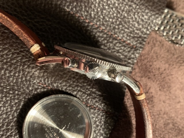This one here is very well preserved and just looks cool. It’s all original as far as I can tell. Lume in hands and on the dial haven’t been touched and just show the right amount of patina. The watch is correctly signed on the crown, dial, case back and on the movement. The serial number is in the correct range of course (84xxx). I wore it on a regular basis and it runs great, as well as the chrono, that operates as it should.