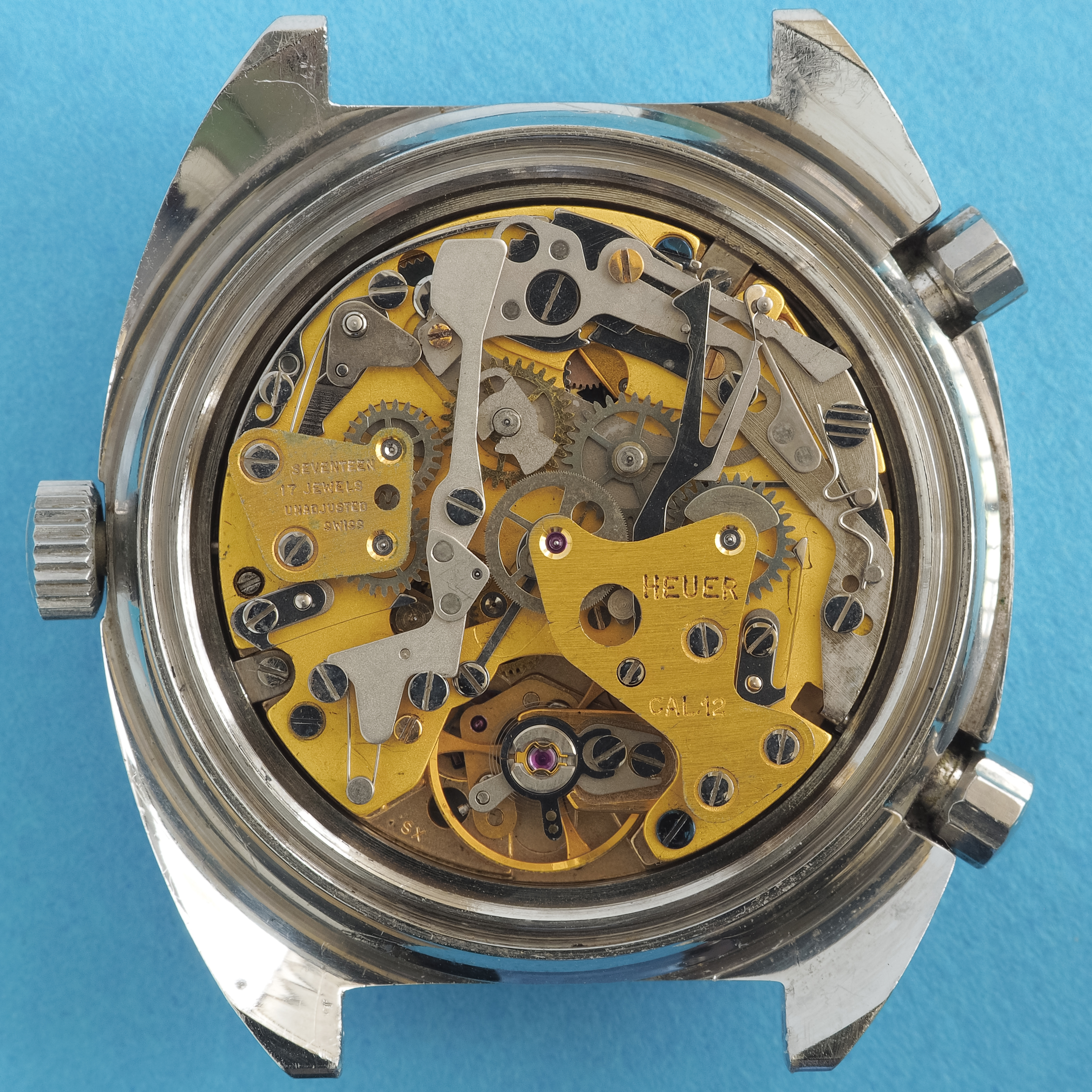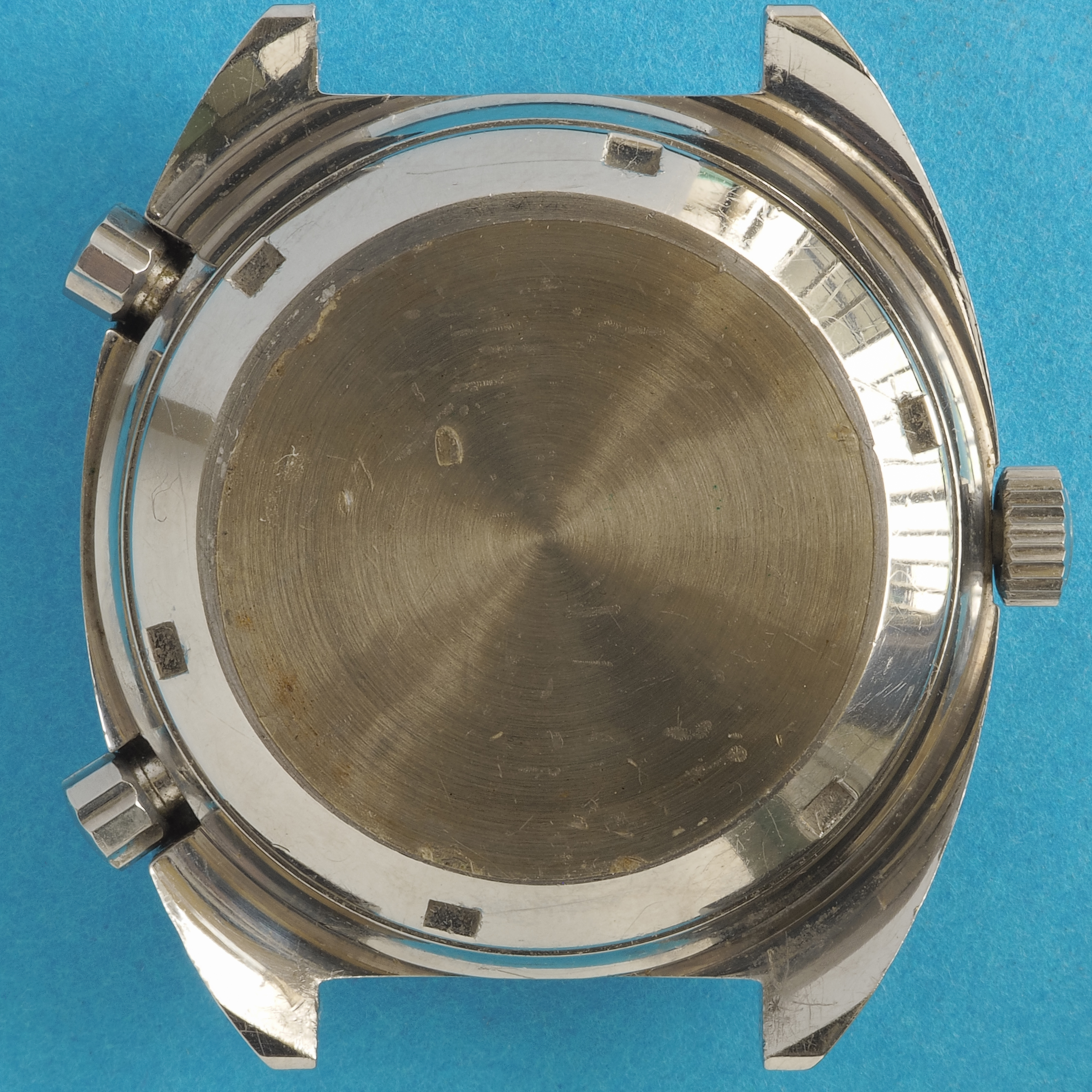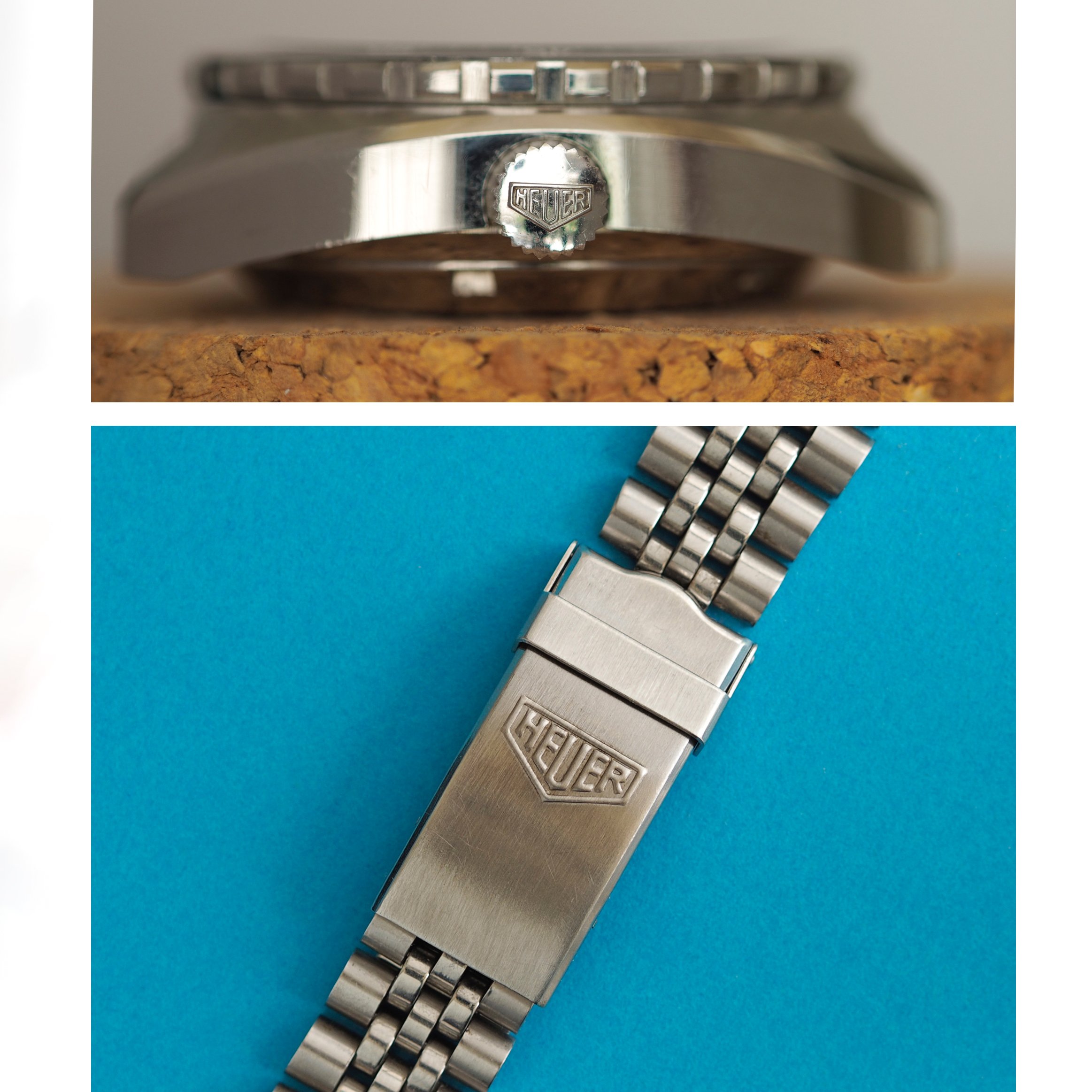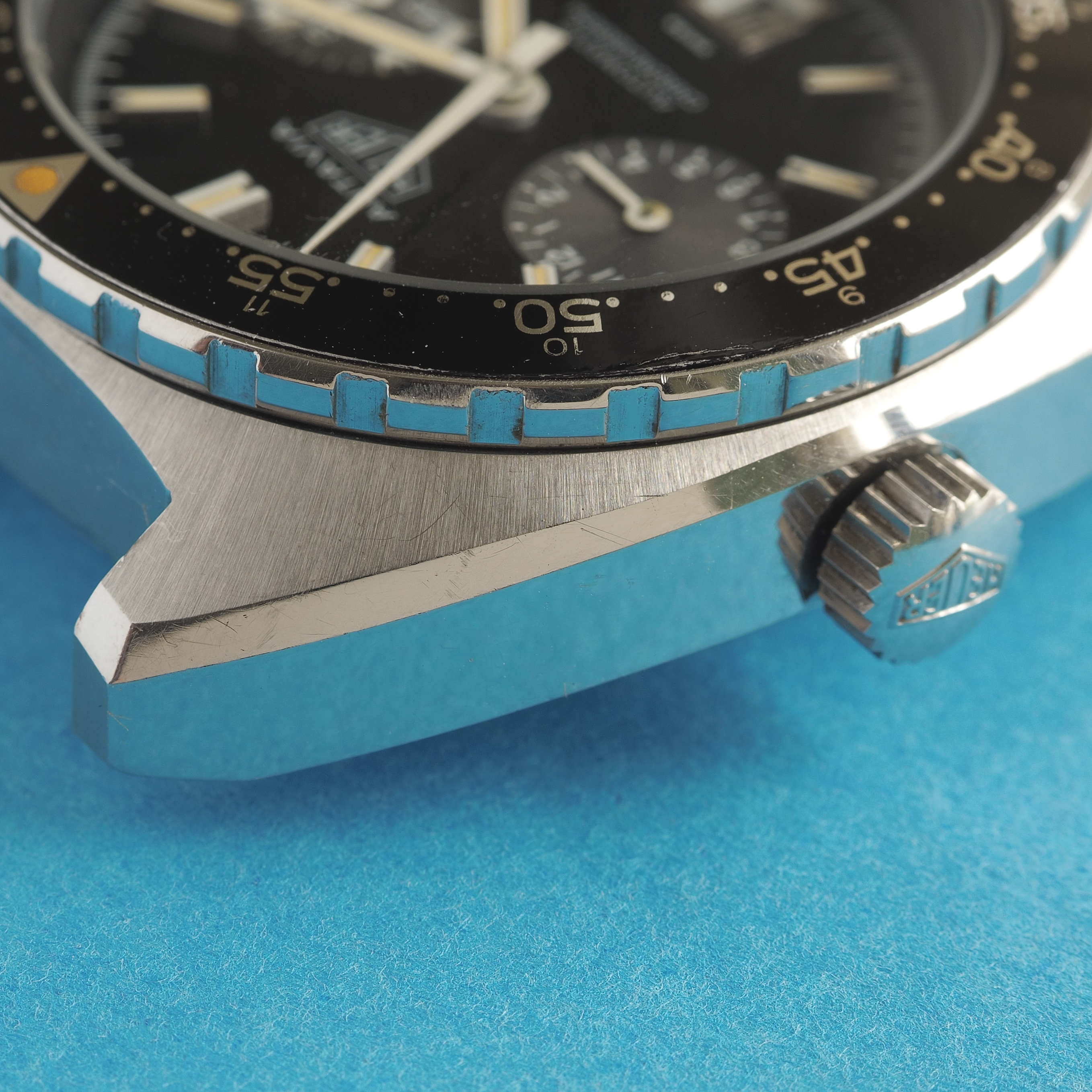 Case / Crown / Pushers: Beefy tonneau-shaped case measures 42mm in diameter and is 15mm thick. Lug width is 20mm. Extremely well preserved case lines and deep factory brushed finish. The case has never been polished. Original Heuer crown and pushers.