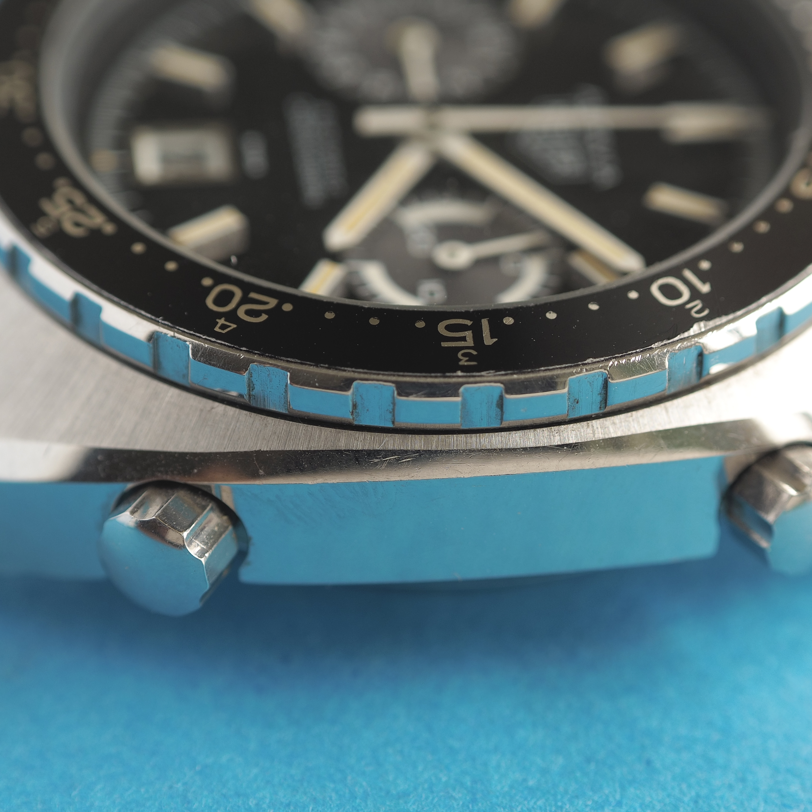 Dial: Excellent glossy black dial free of any blemishes. Gray subdials. Original tritium lume on hands and hour markers. Lume loss on several hour markers. Lume cracking on hands. Visible loose lume debris inside the dial.