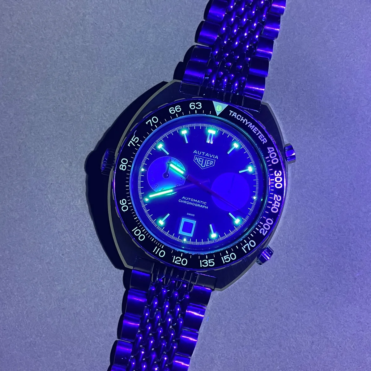 Condition and Notes: This is an extremely well preserved, third generation, Heuer ‘Viceroy design” Autavia 11630. I believe the case is unpolished. Dial is nearly flawless. The original lume on vintage Autavias should react uniformly when exposed to UV light and retain the glow for several seconds afterward. Vintage Autavias with inconsistent lume are a red flag, based on my experience.