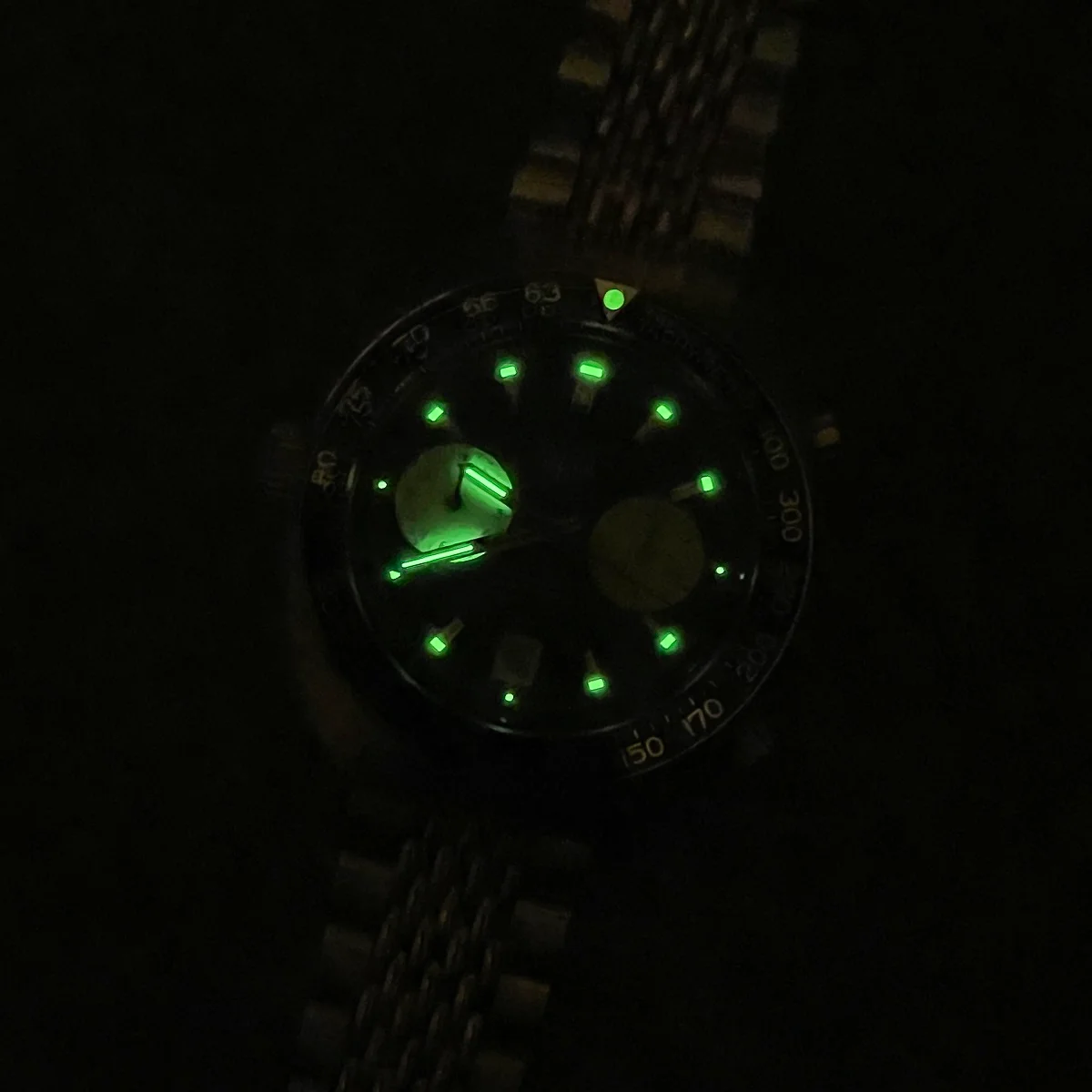 Dial: Very crisp matte black dial. White registers. Tritium lume on handset and hour markers is uniform in color and reacts brightly under UV light. Chrono and register hands are fully operational and re-set perfectly. Black tension ring between case and crystal. Silver date wheel.