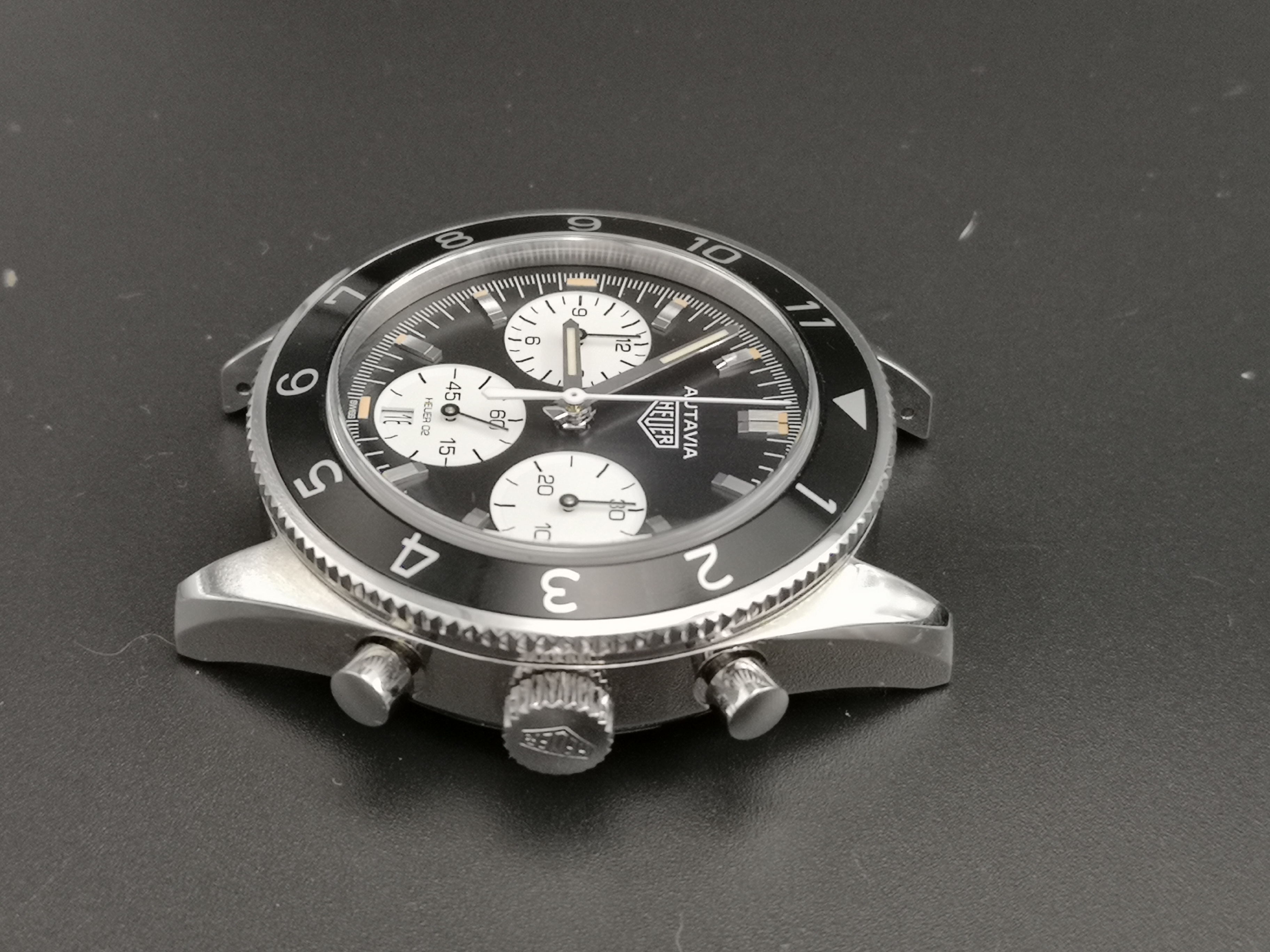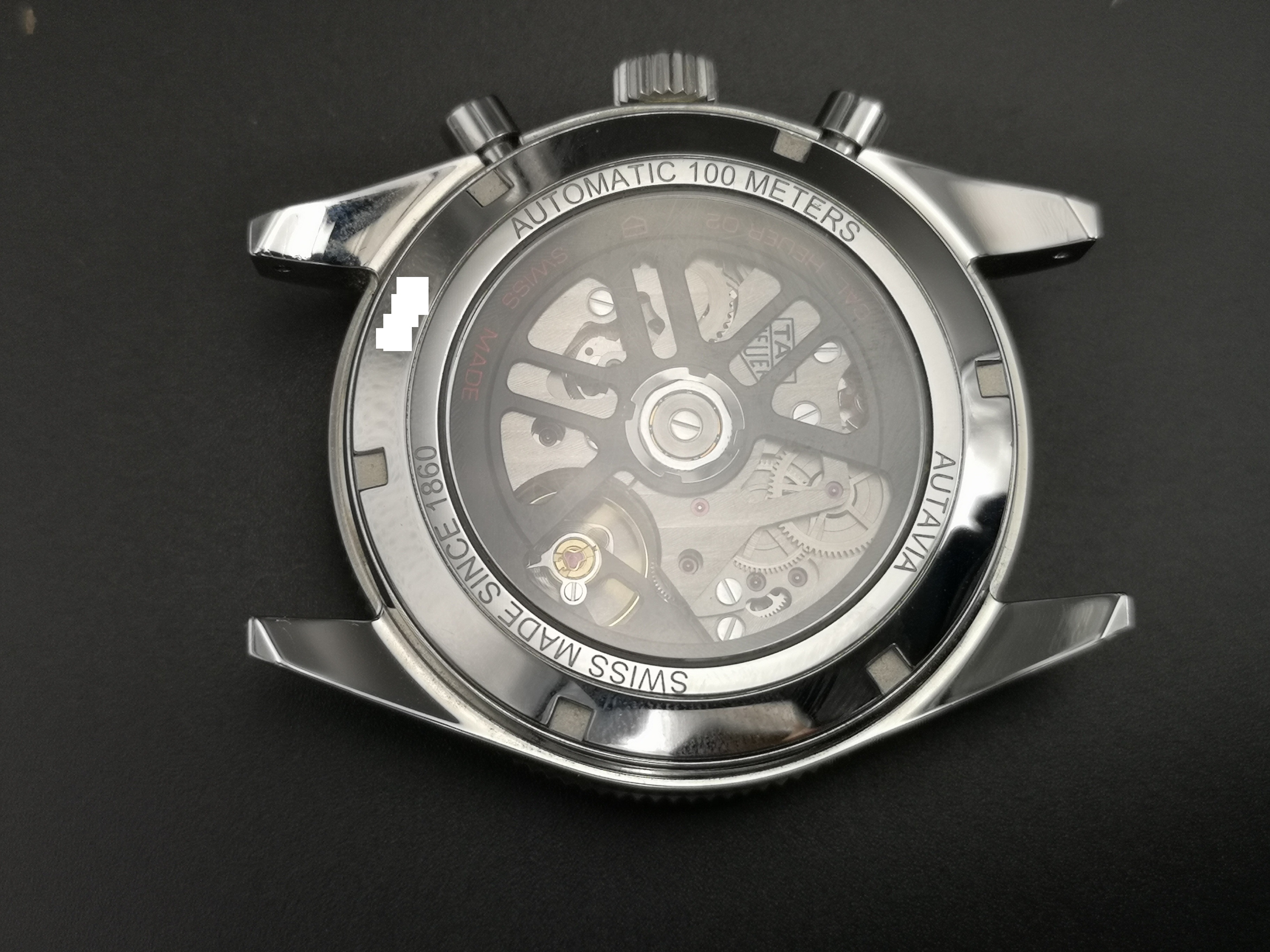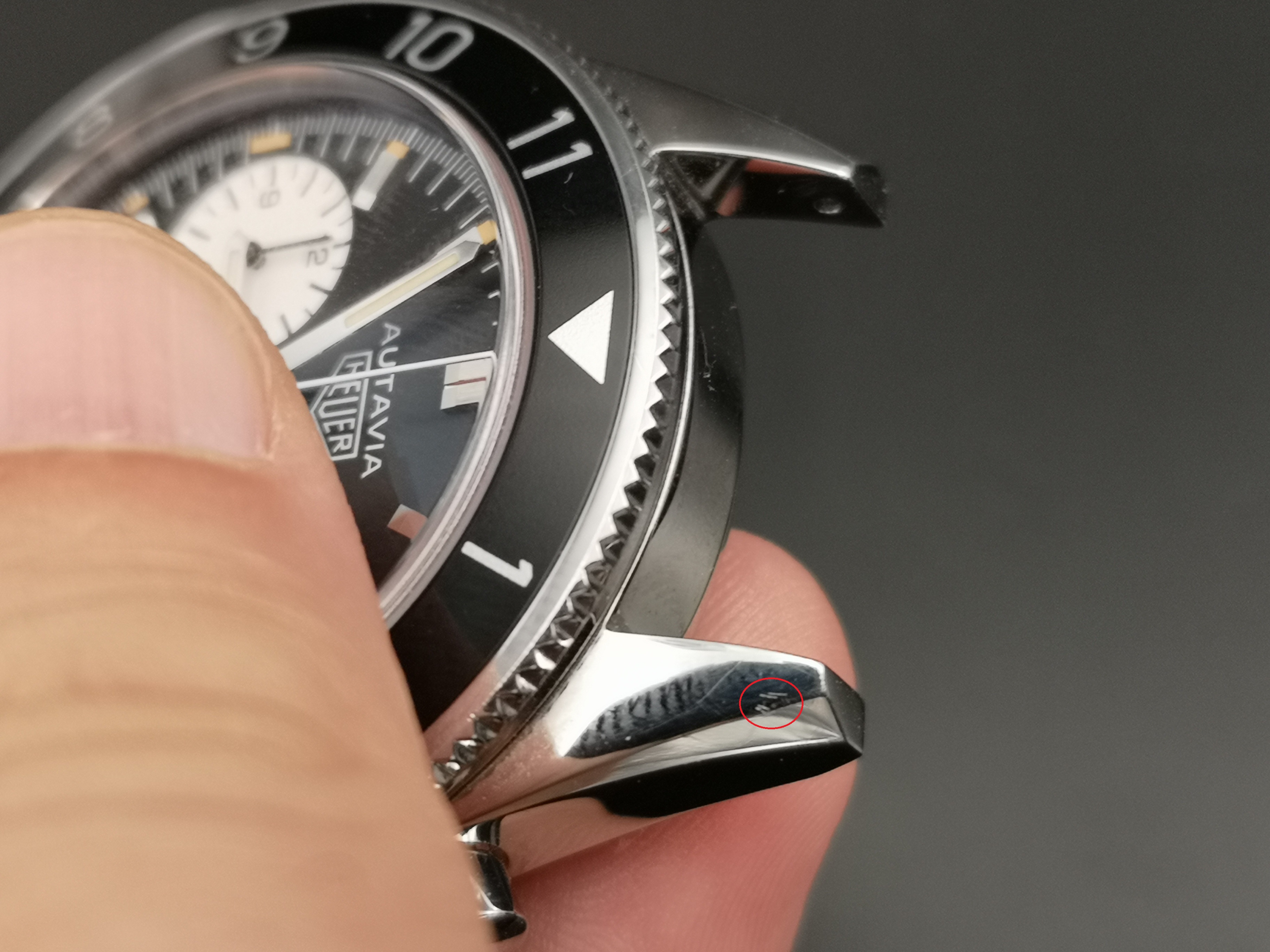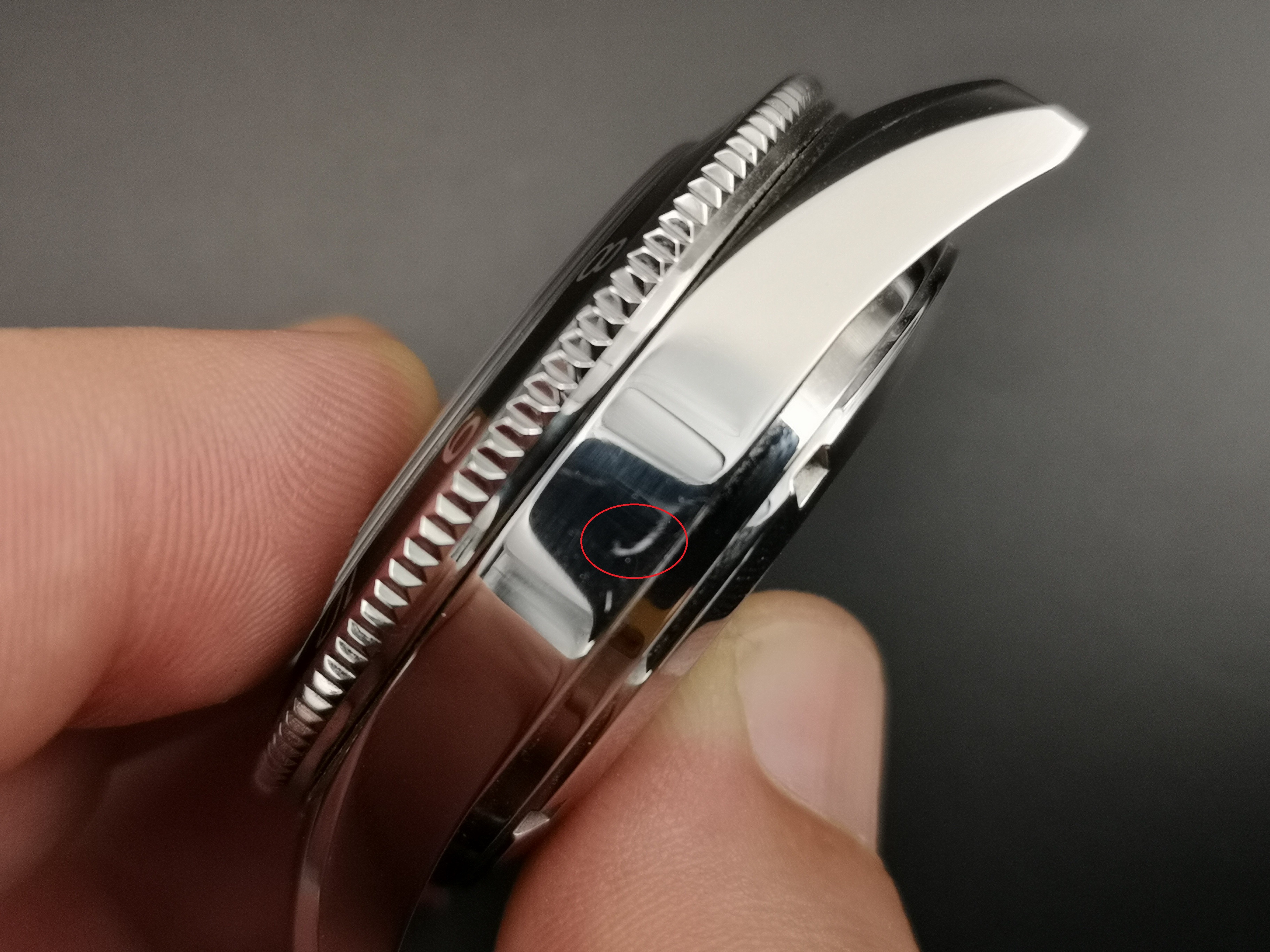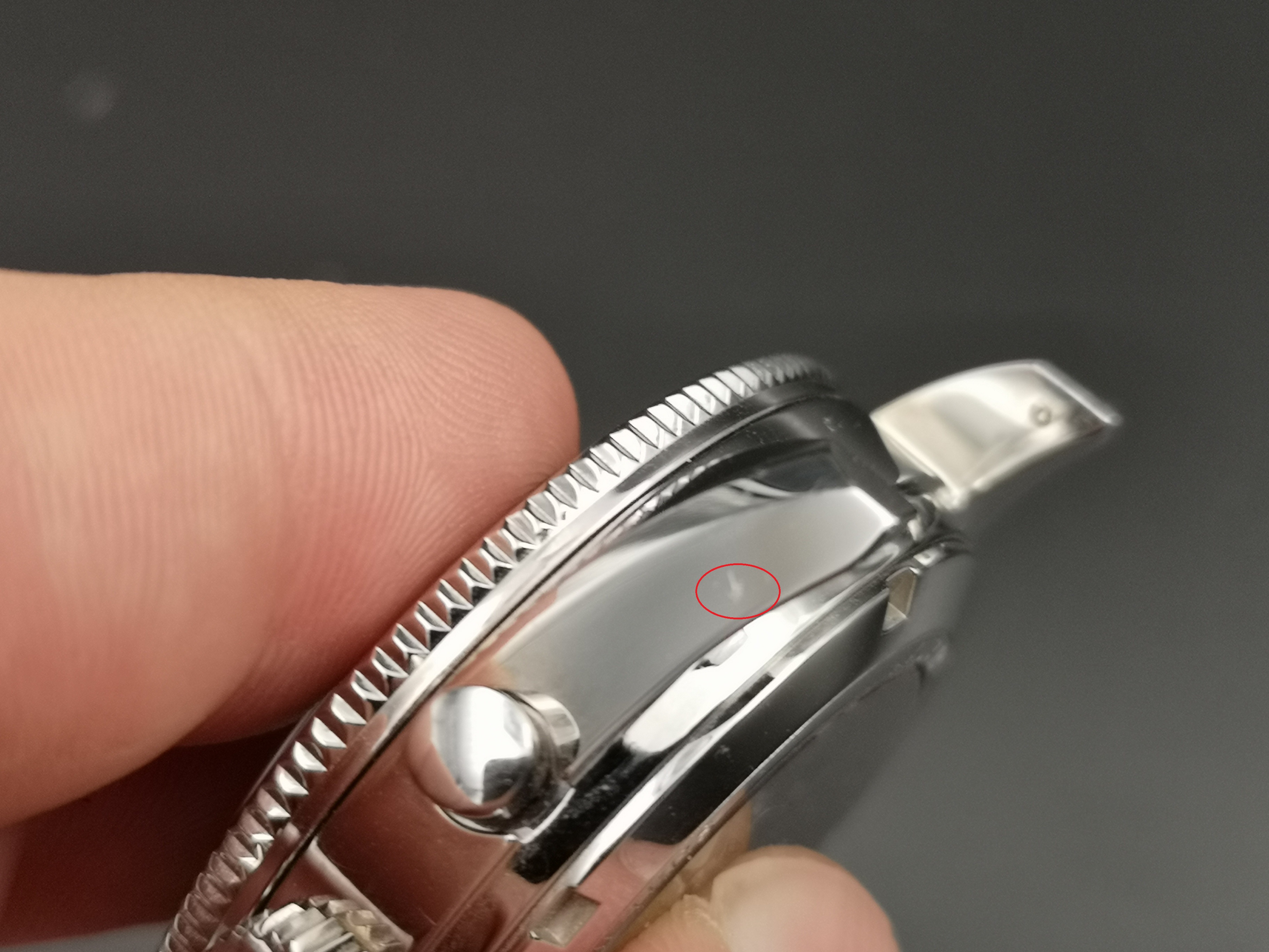 Watch is in great condition but it does have a couple of minor marks on the case. The case is highly polished, so these marks are easy to do. They are not very noticeable though and are hard to photograph (I've circled these in red in the photographs). I have managed to capture them but it's made them look a lot worse than they really are. They are just surface marks and will buff or polish out very easily.