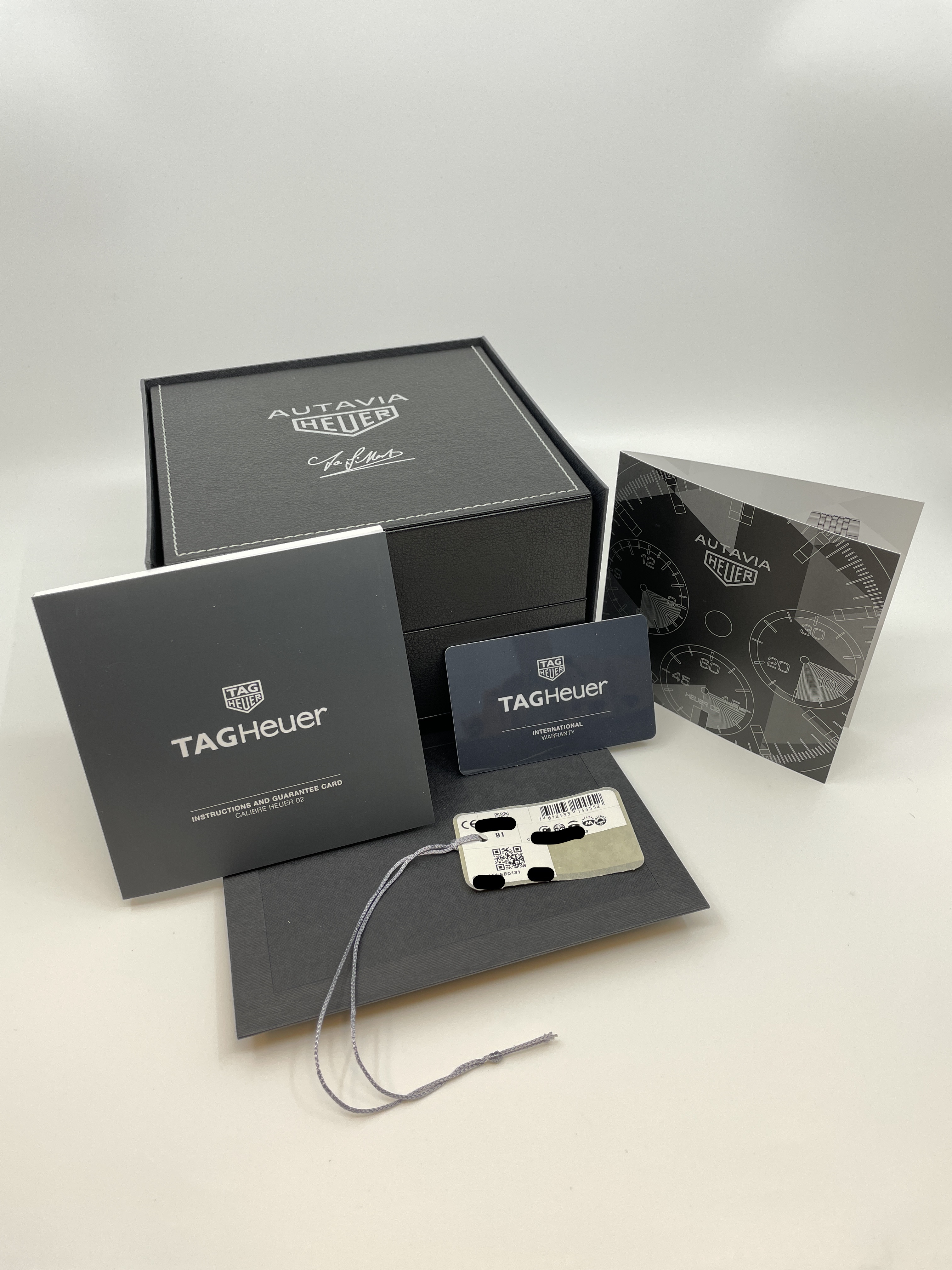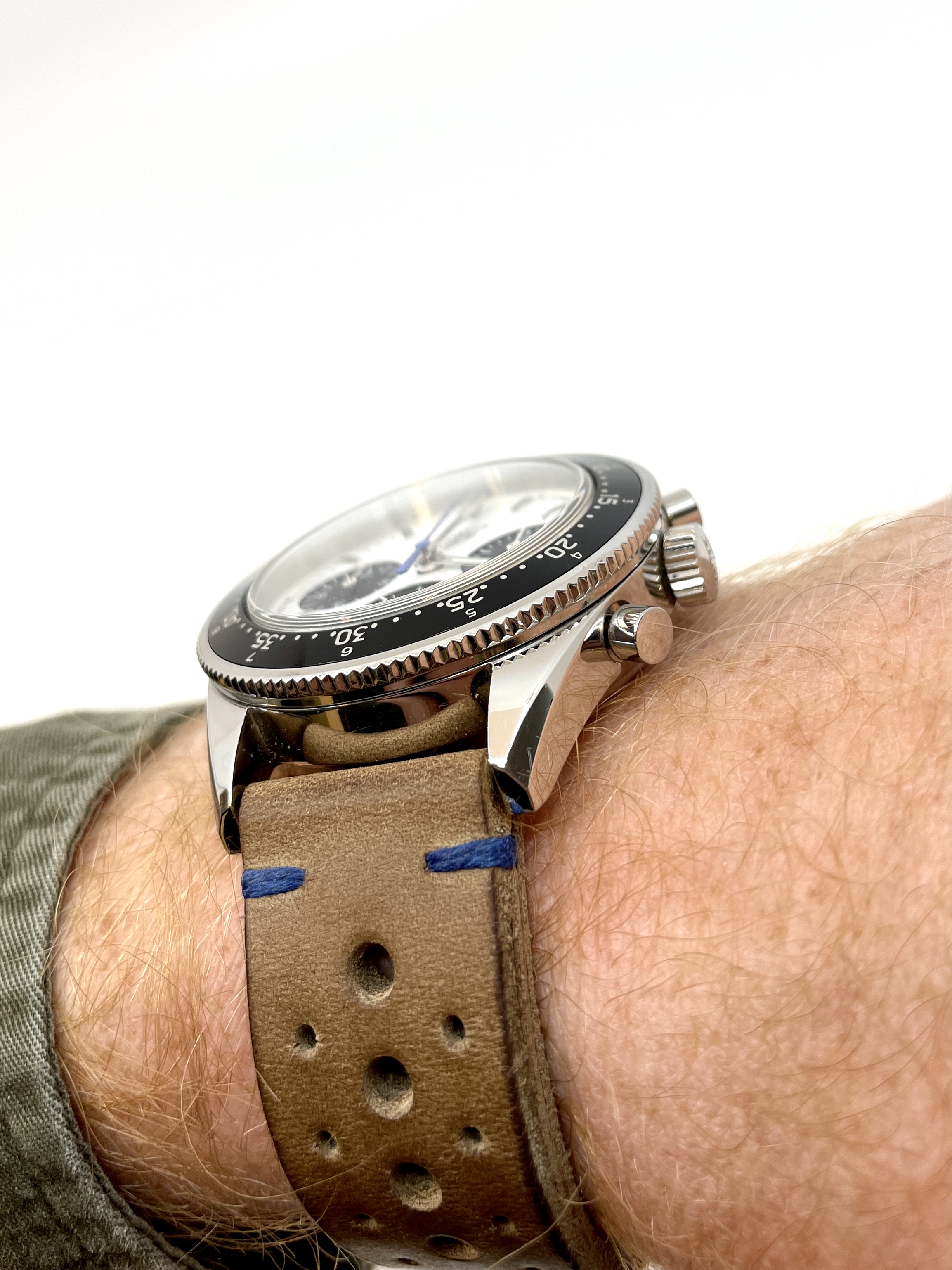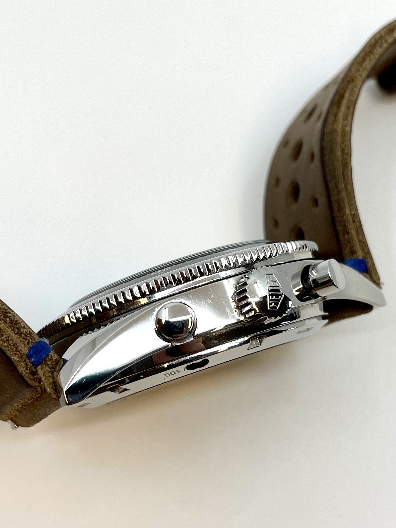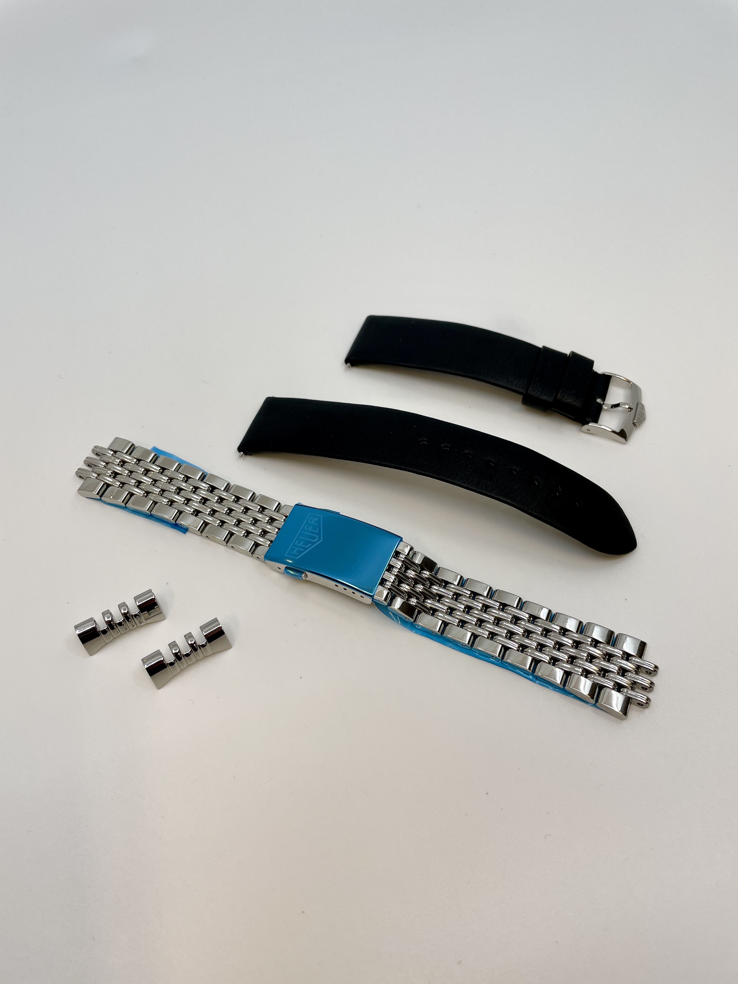 The bracelet is brand new and hasn’t been sized or fitted. The Heuer branded strap with Heuer B buckle is also brand new. I immediately fitted the watch with the bespoke racing strap with matching blue stitching by Stewart Morley, as pictured. This strap also has a Heuer B buckle and is sold with the watch.