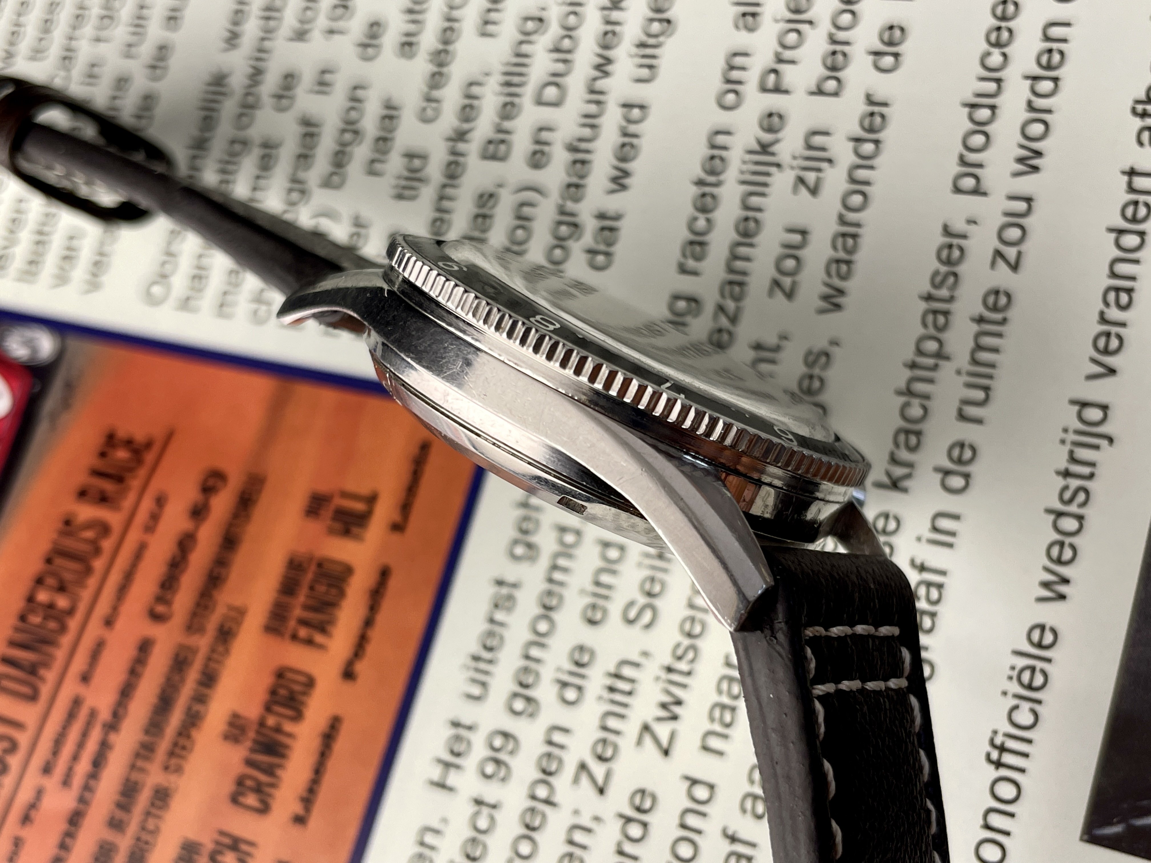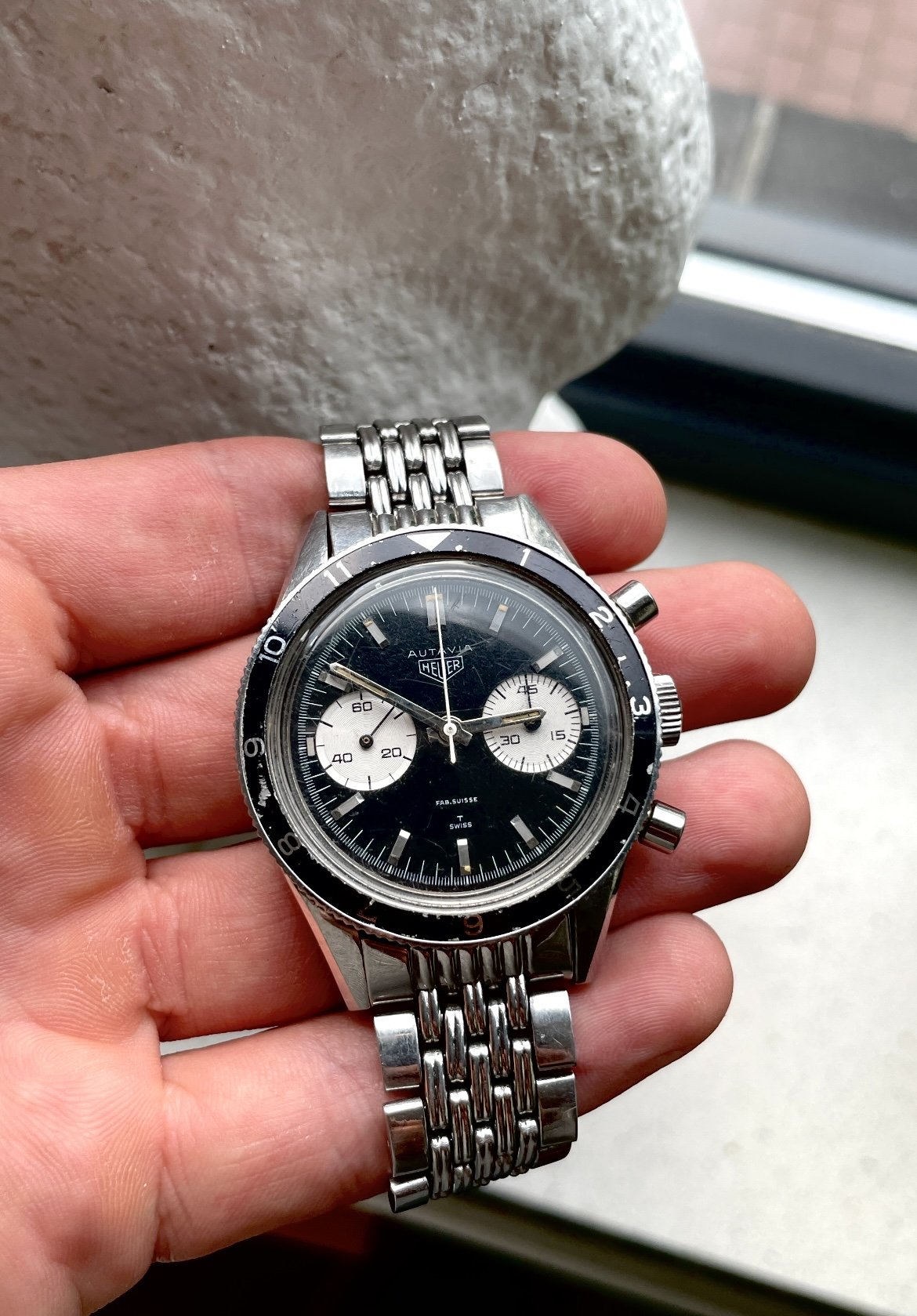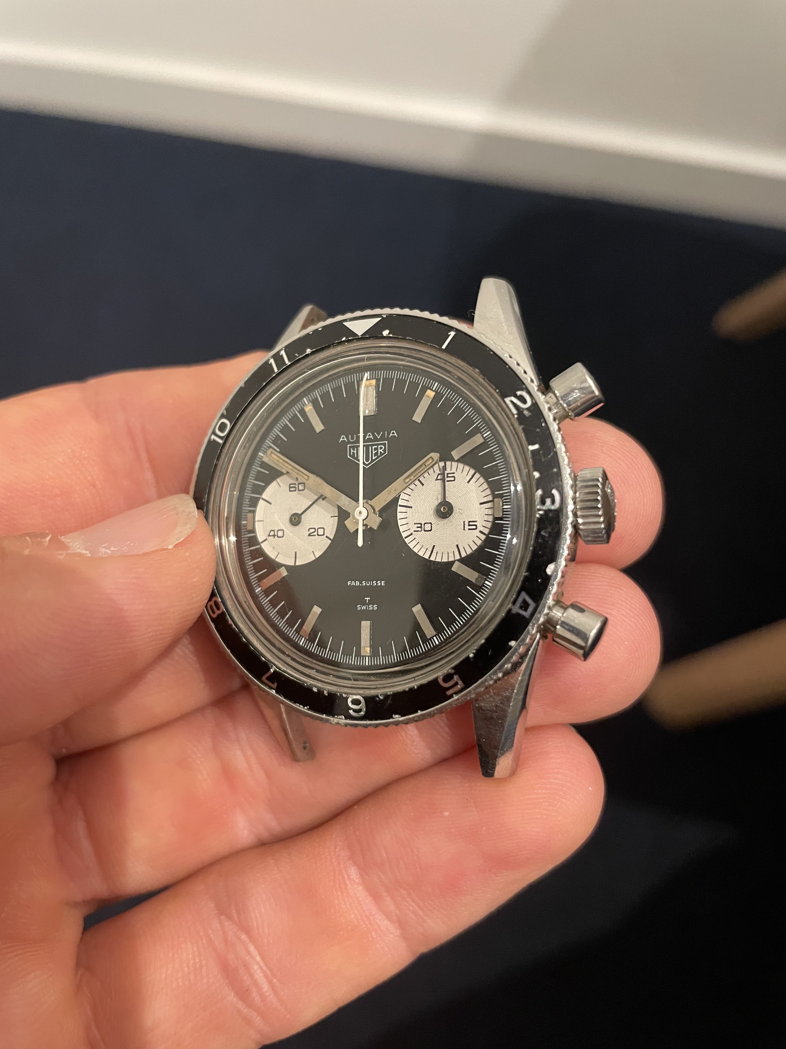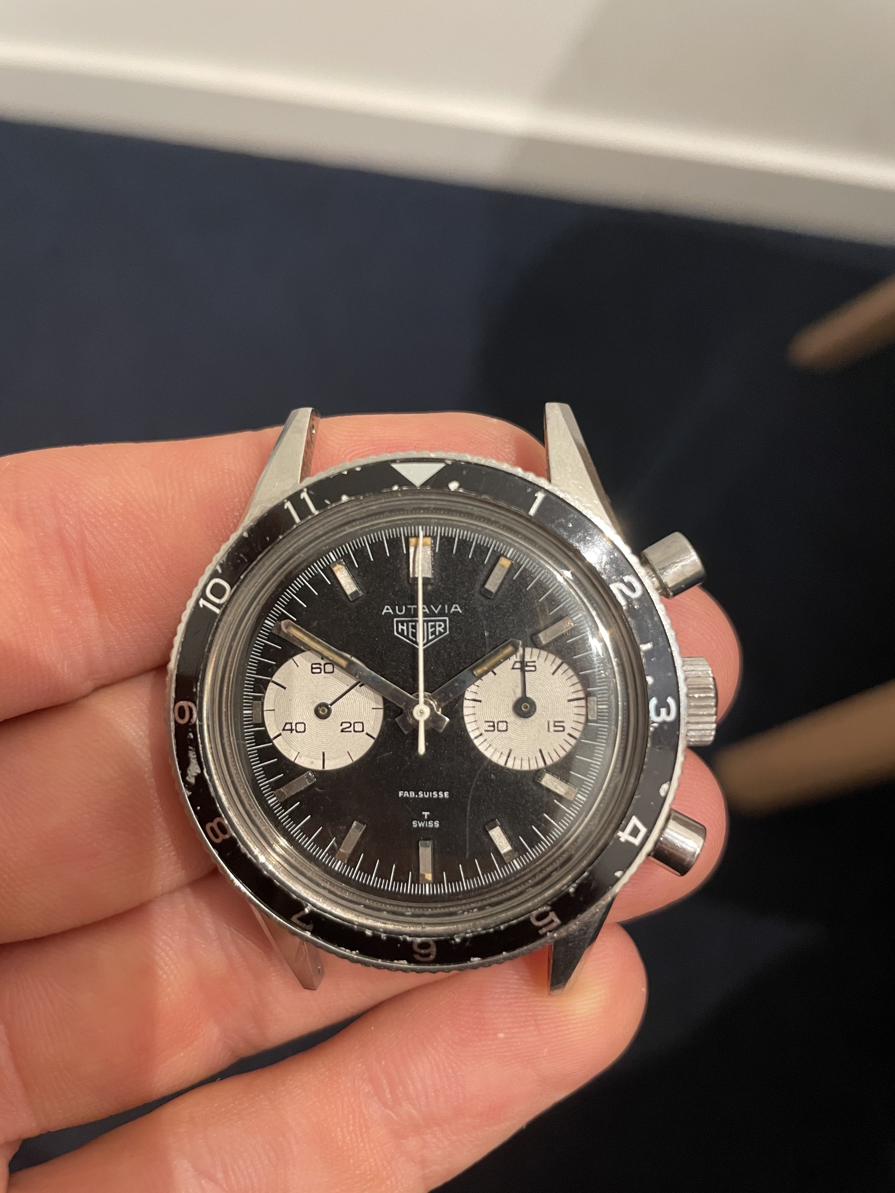 The panda dial is in good overall condition, and all original. The lume plots have mostly disappeared over time. It has a sought after ‘Fab Suisse’ dial.