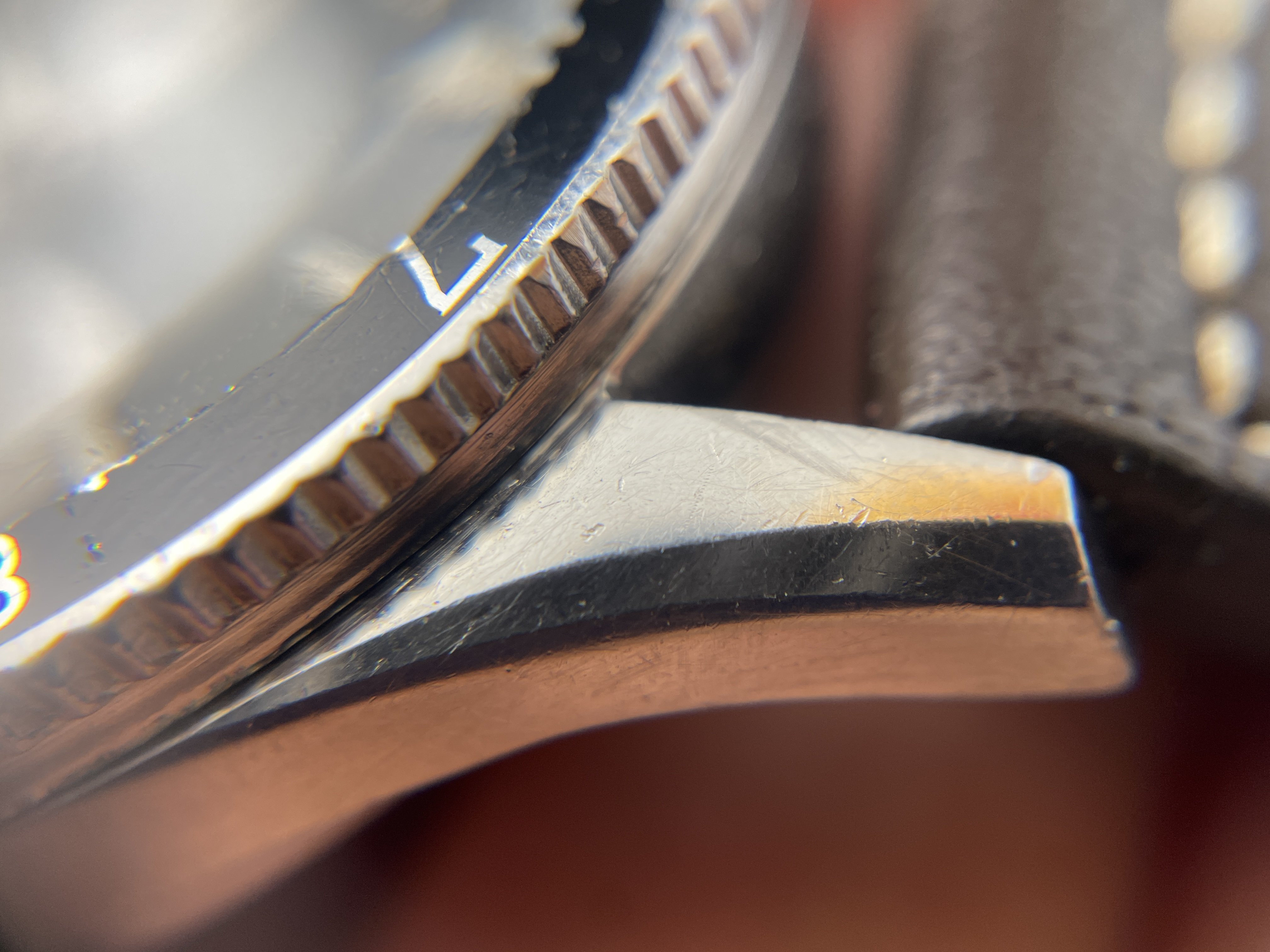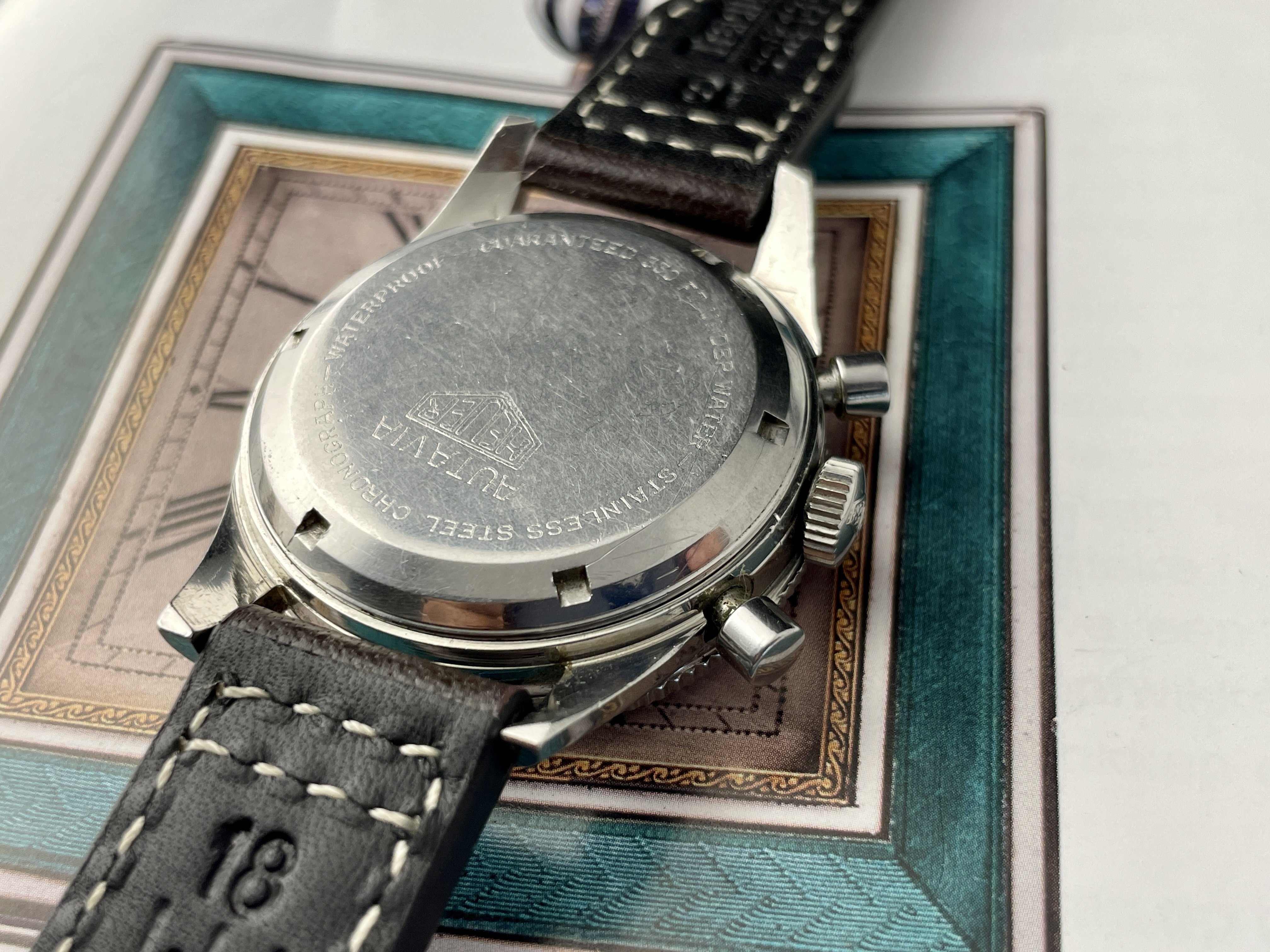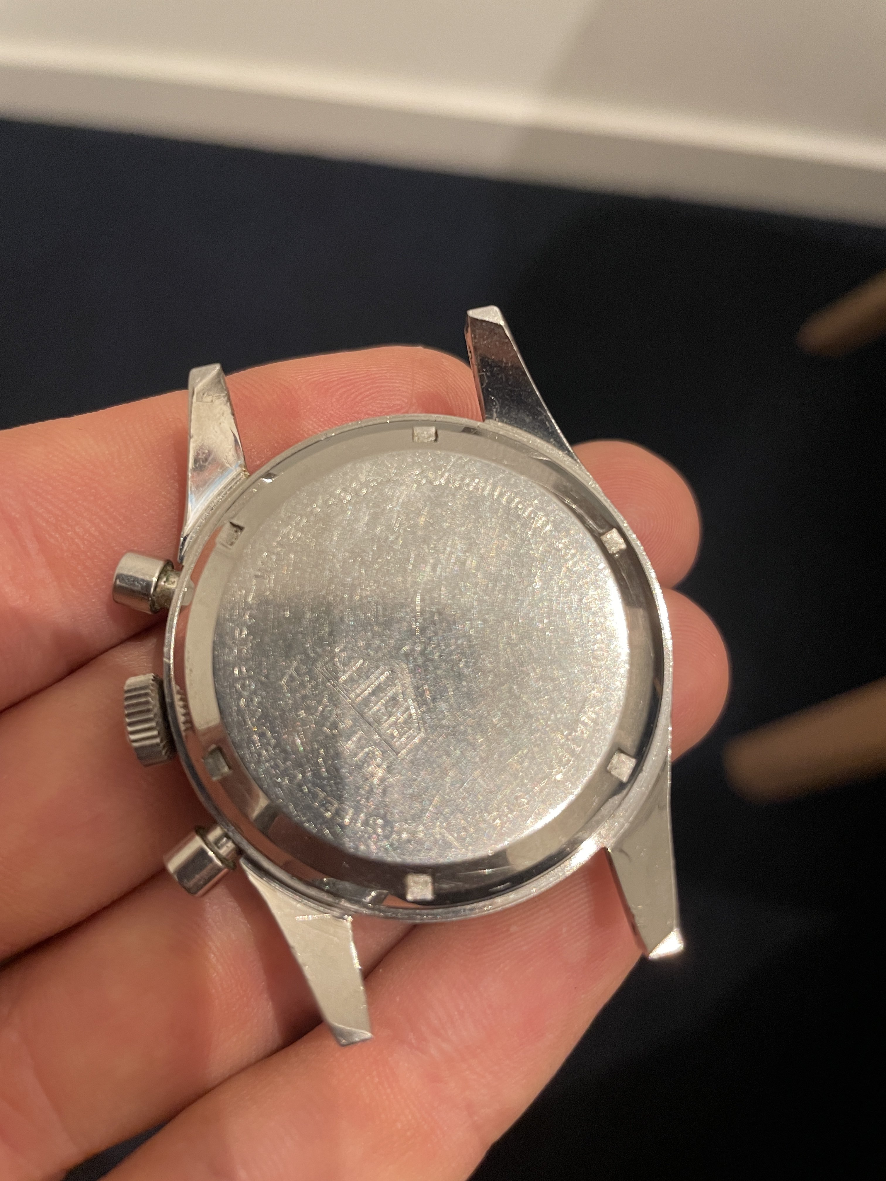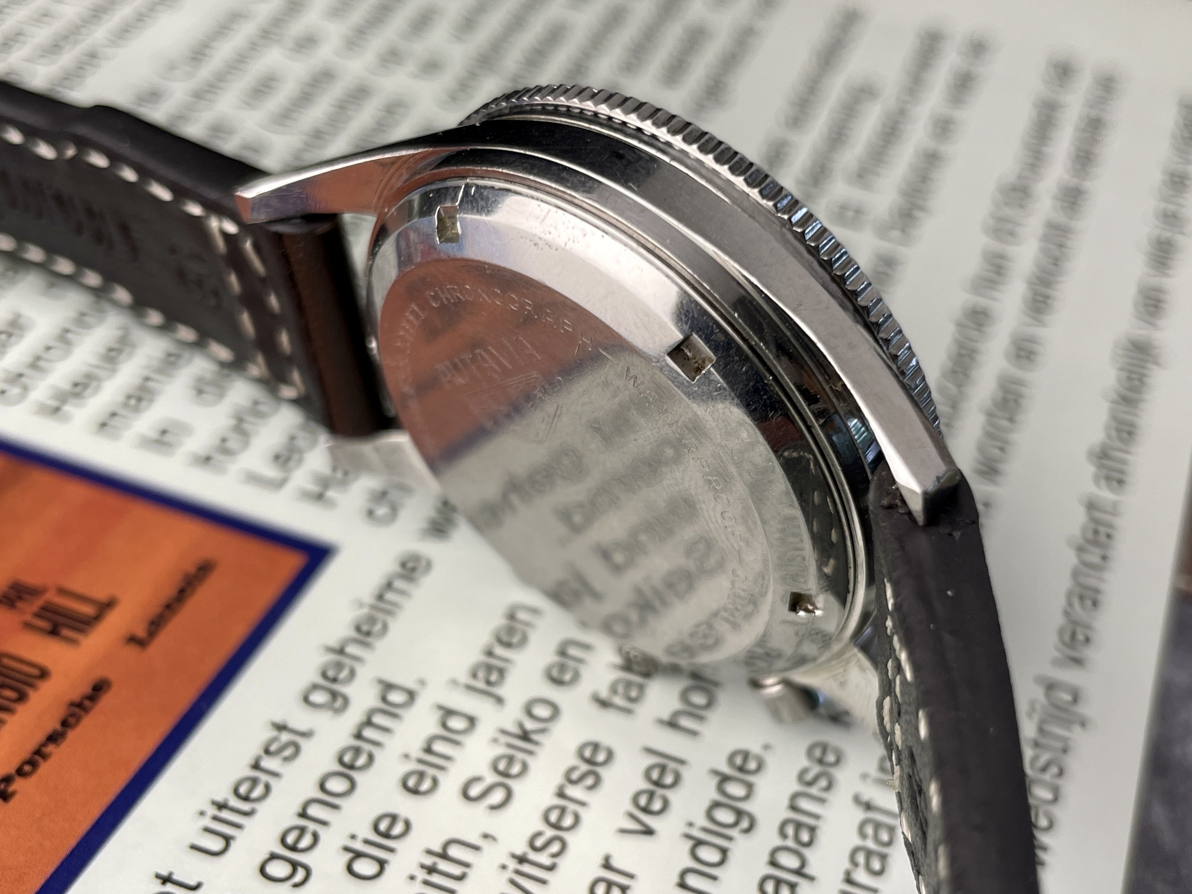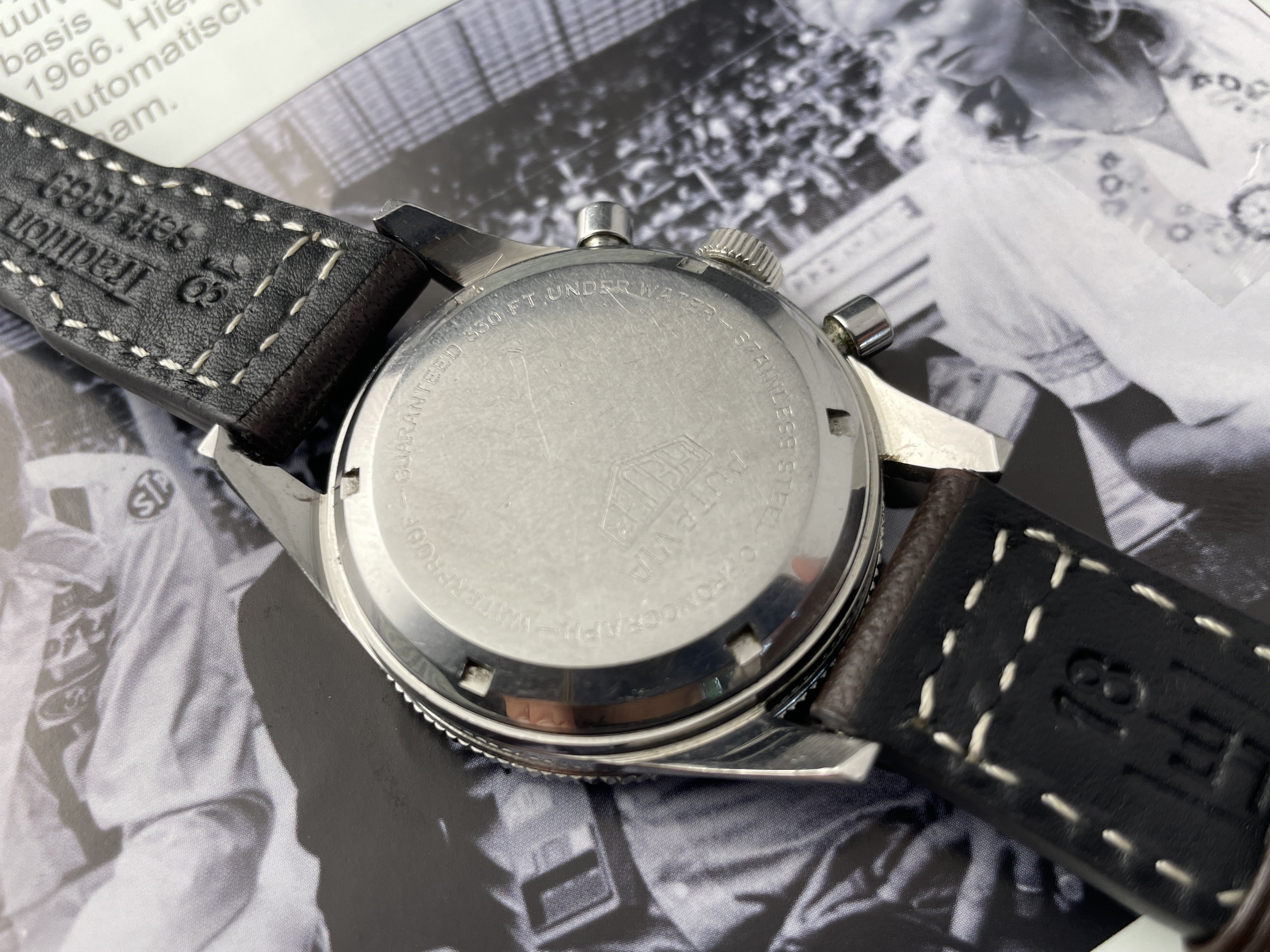 The panda dial is in good overall condition, and all original. The lume plots have mostly disappeared over time. It has a sought after ‘Fab Suisse’ dial.
