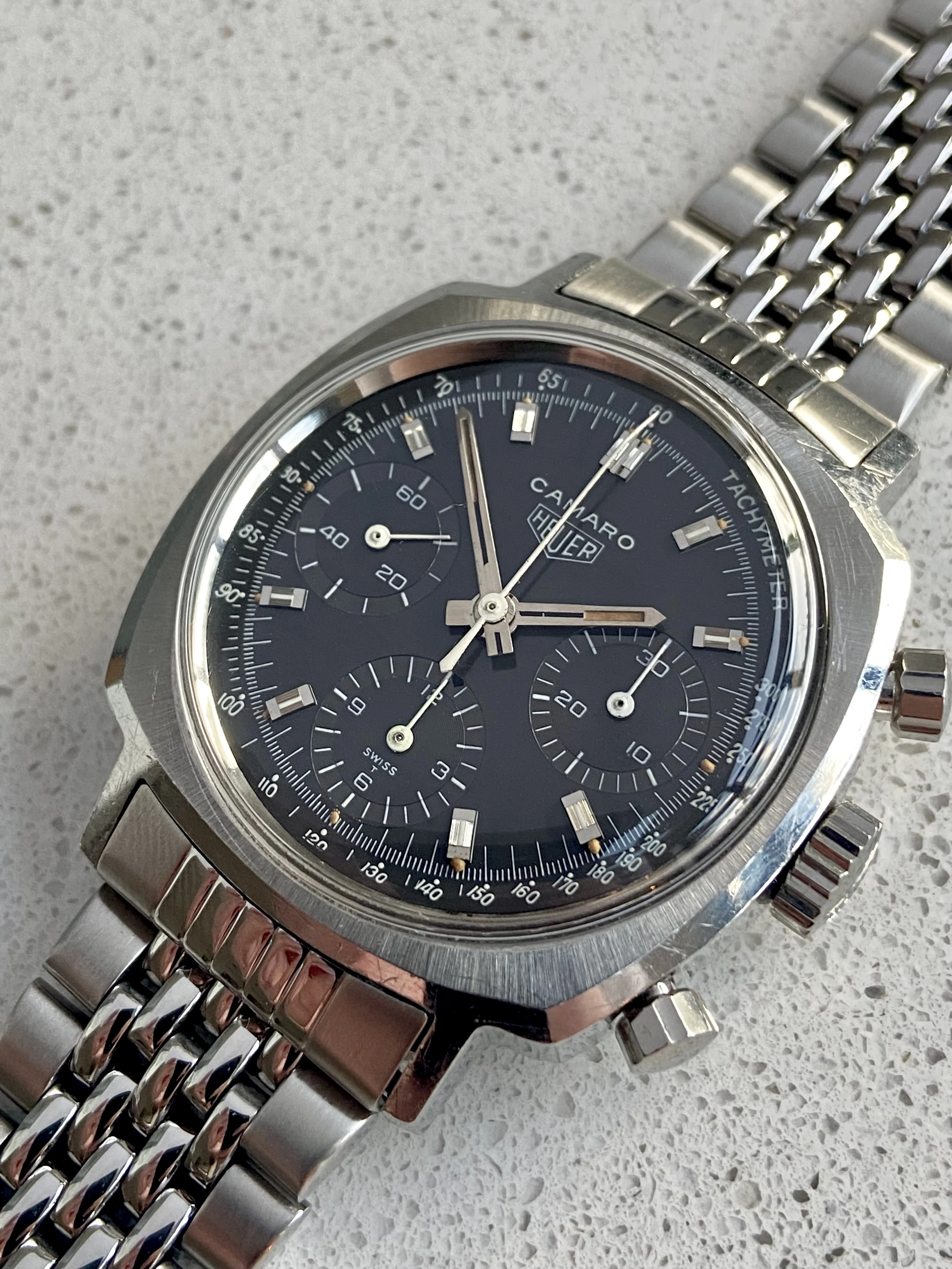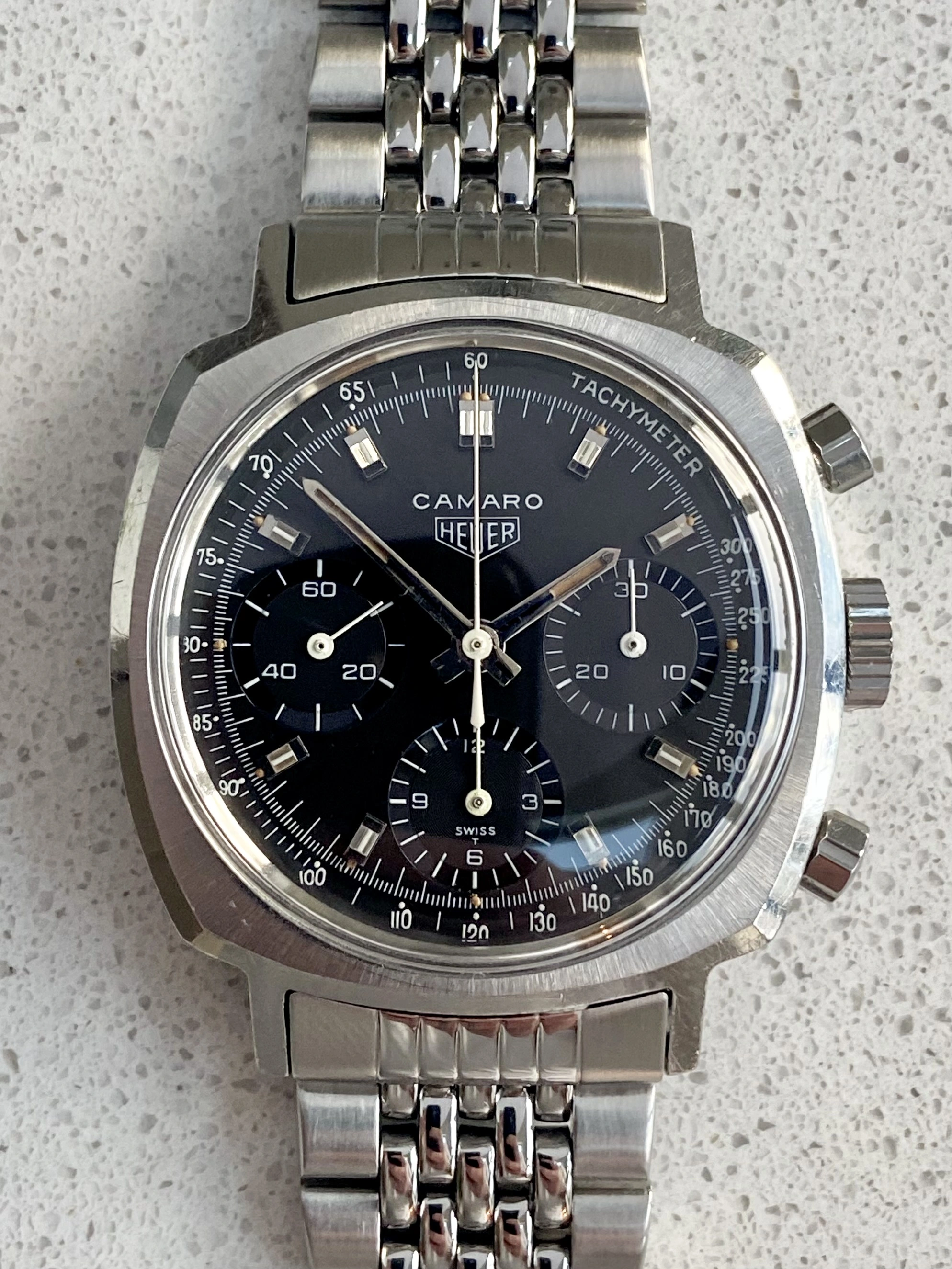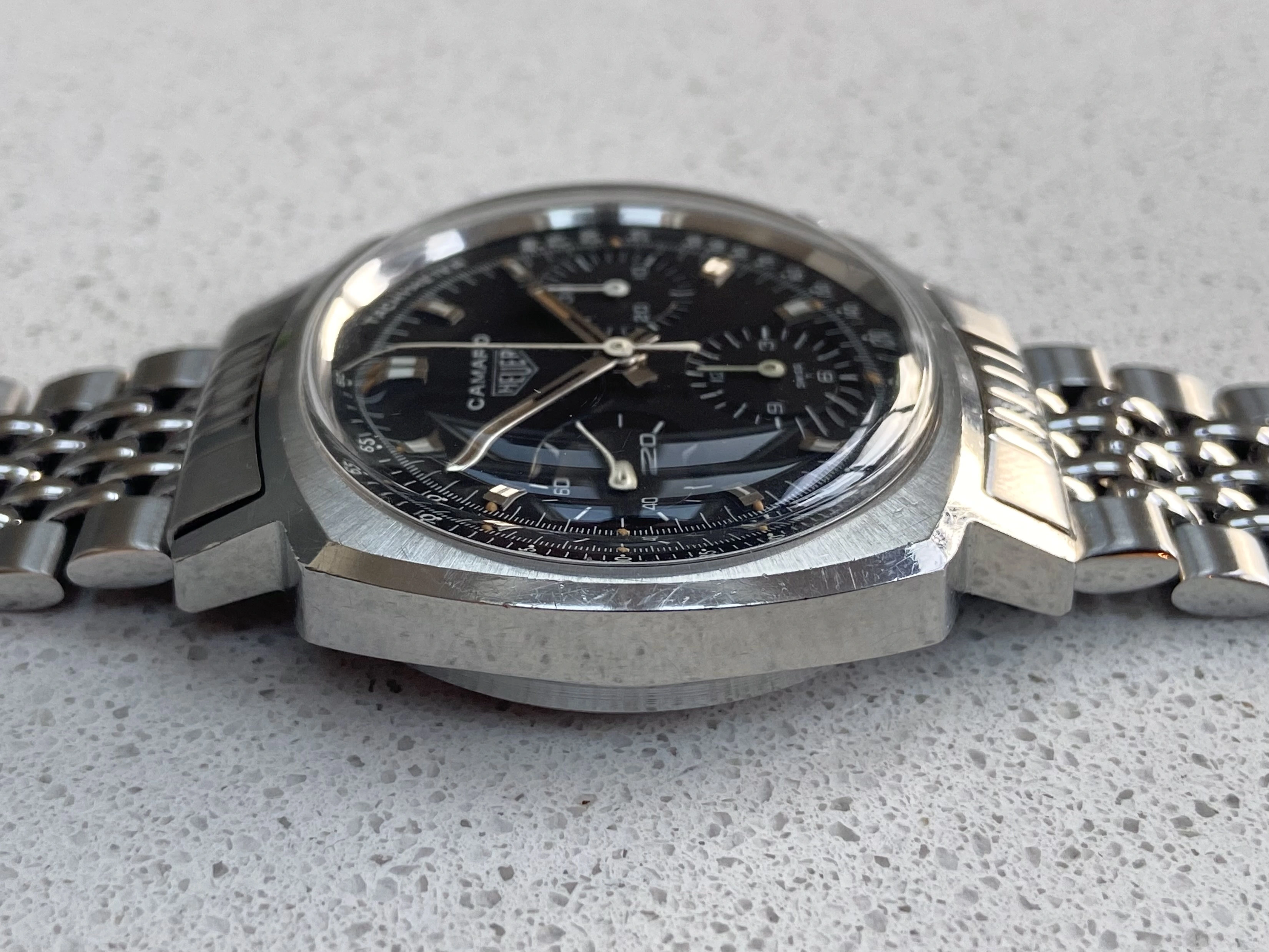 This is a beautiful example of the classic valjoux 72 powered Camaro. I would say it’s genuinely one of the best, if not the best on the market right now. It is all original, with a clean sharp case and beautiful, slightly tropical noir/black dial.