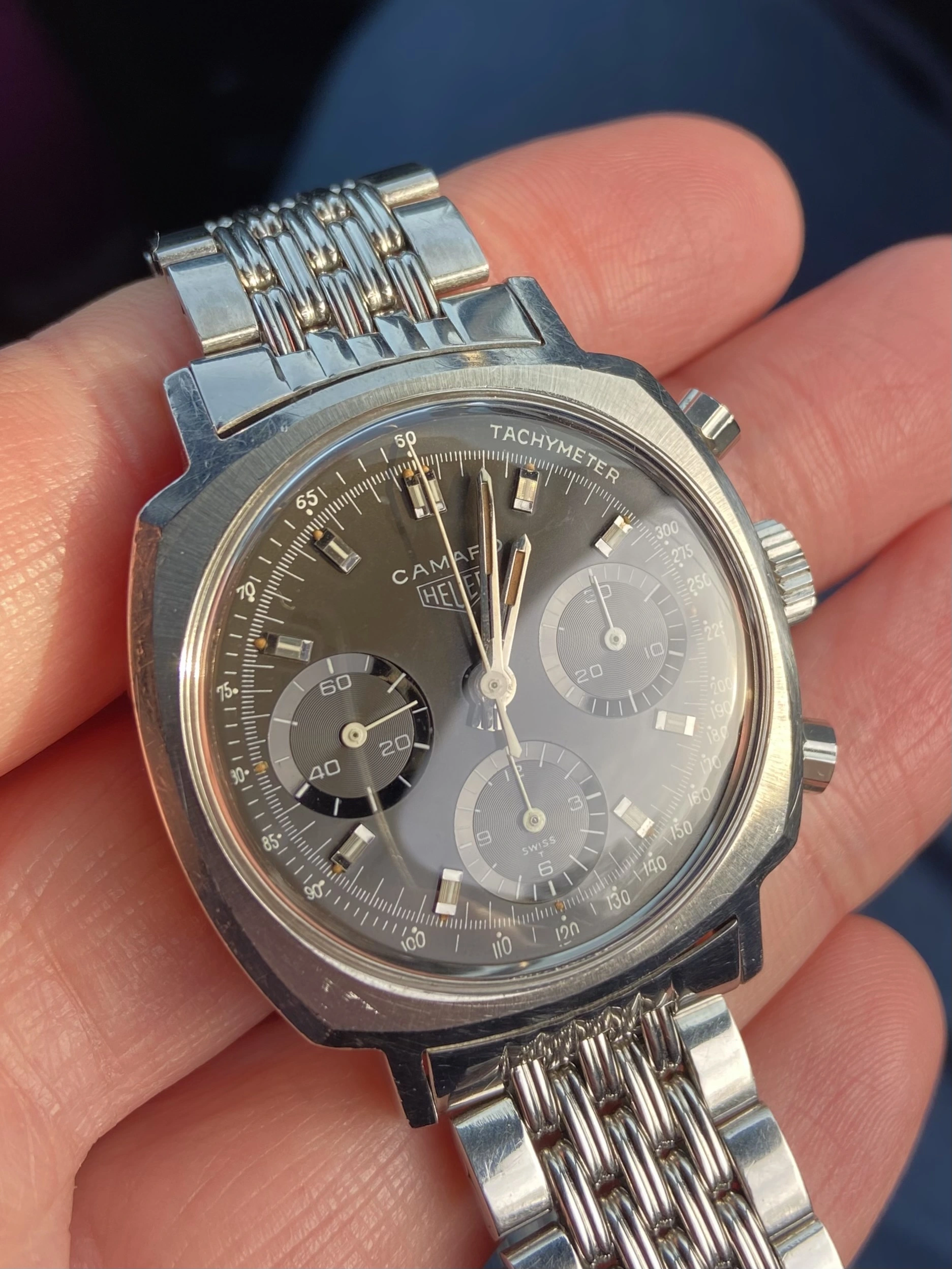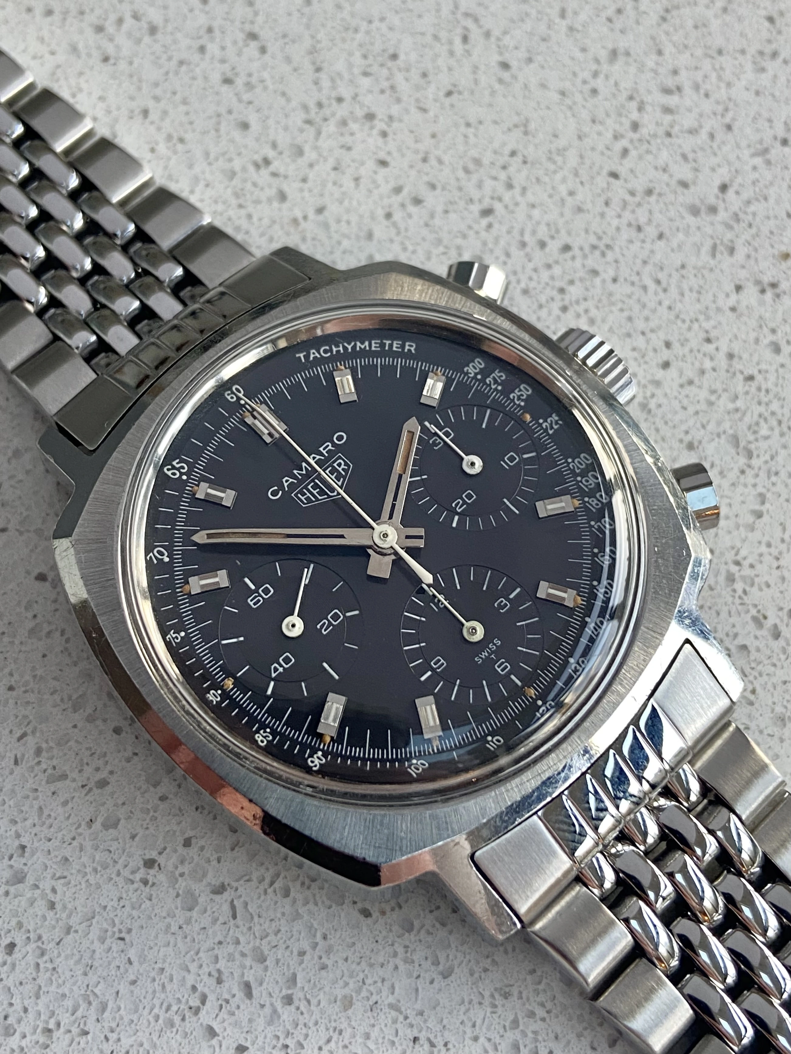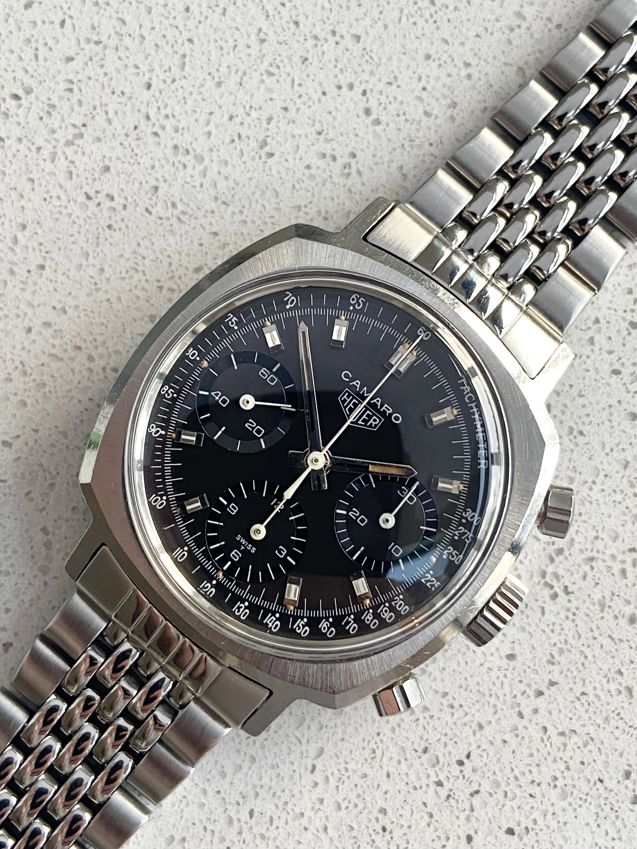 This is a beautiful example of the classic valjoux 72 powered Camaro. I would say it’s genuinely one of the best, if not the best on the market right now. It is all original, with a clean sharp case and beautiful, slightly tropical noir/black dial.