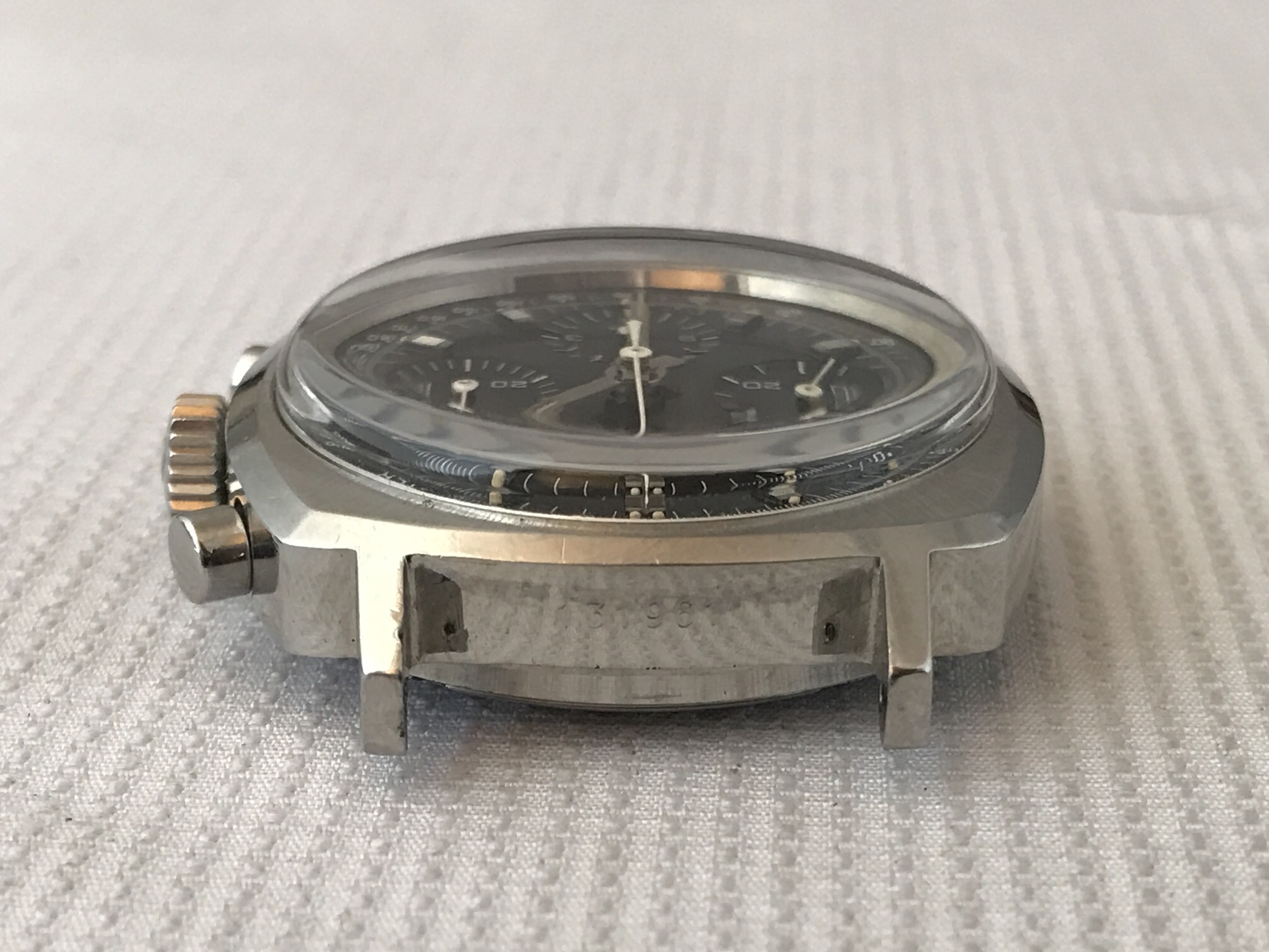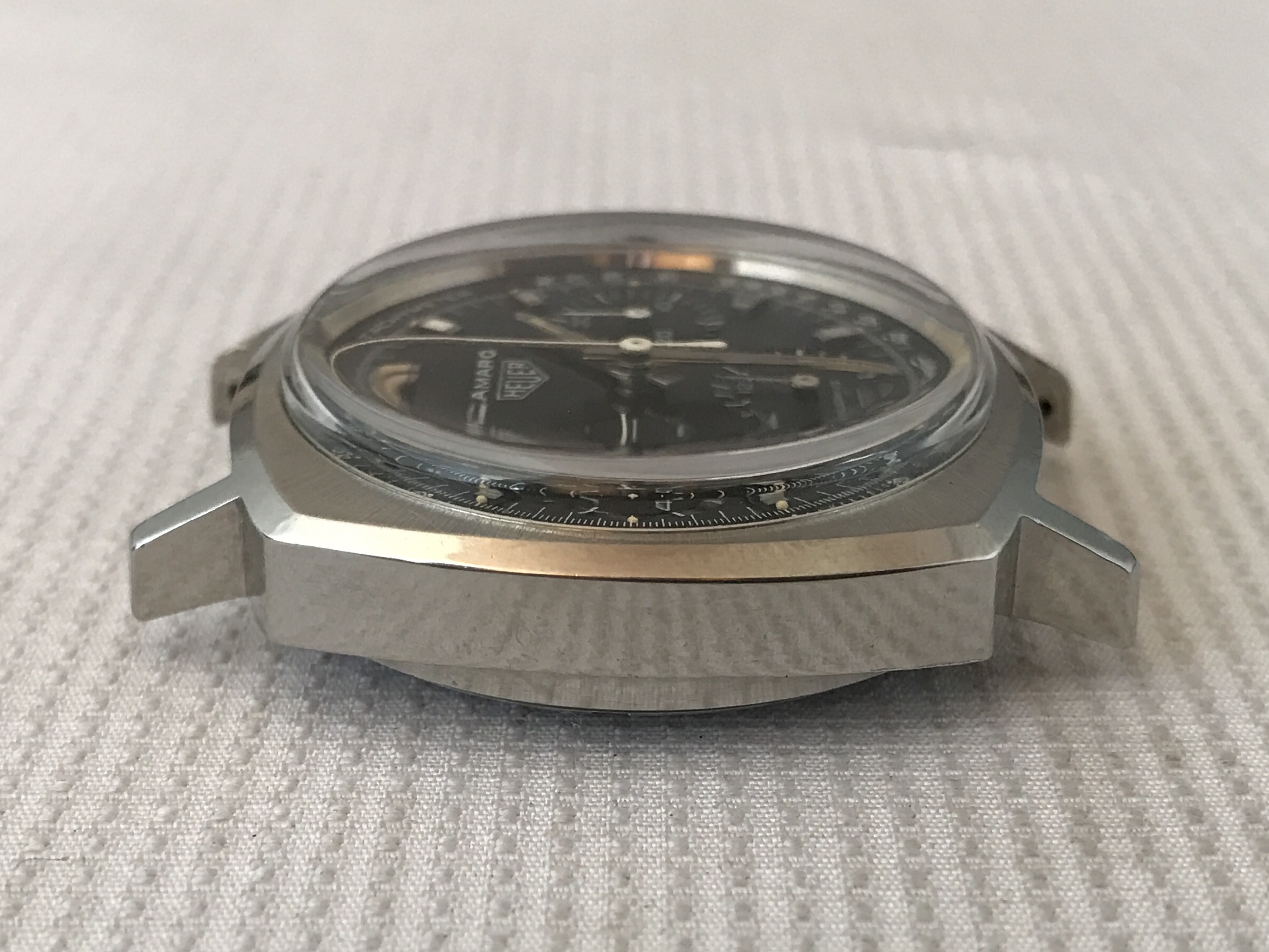 Case - ref 7220 in stainless steel, with brushed top surface. Possibly lightly polished in the past but nice, thick and sharp. Correct pushers and Heuer signed crown. Serial and ref visible between lugs. Case size 37mm (wears slightly larger due to cusion shape), with 19mm lugs. For reference my wrist is 7.5-7.75".