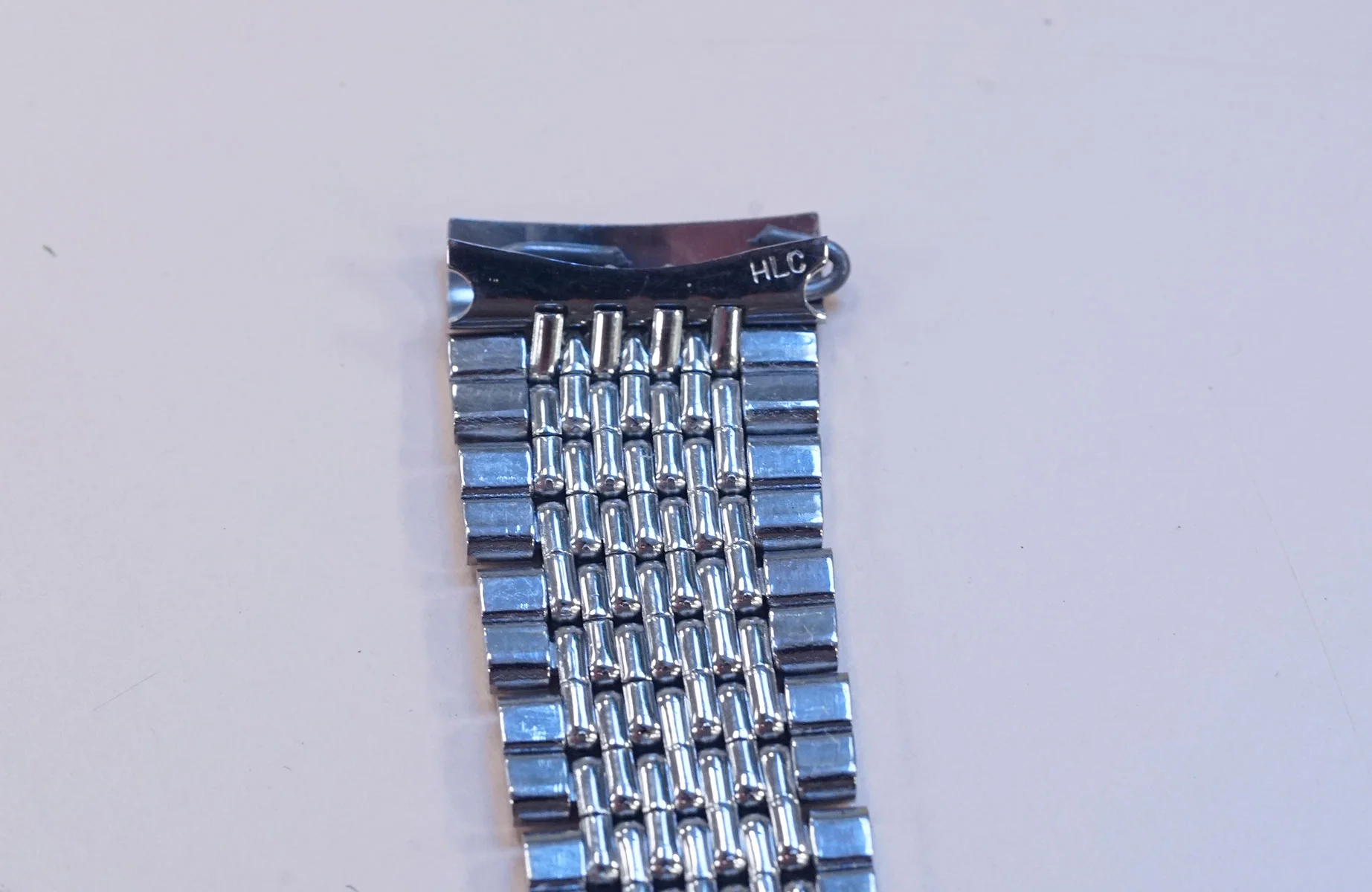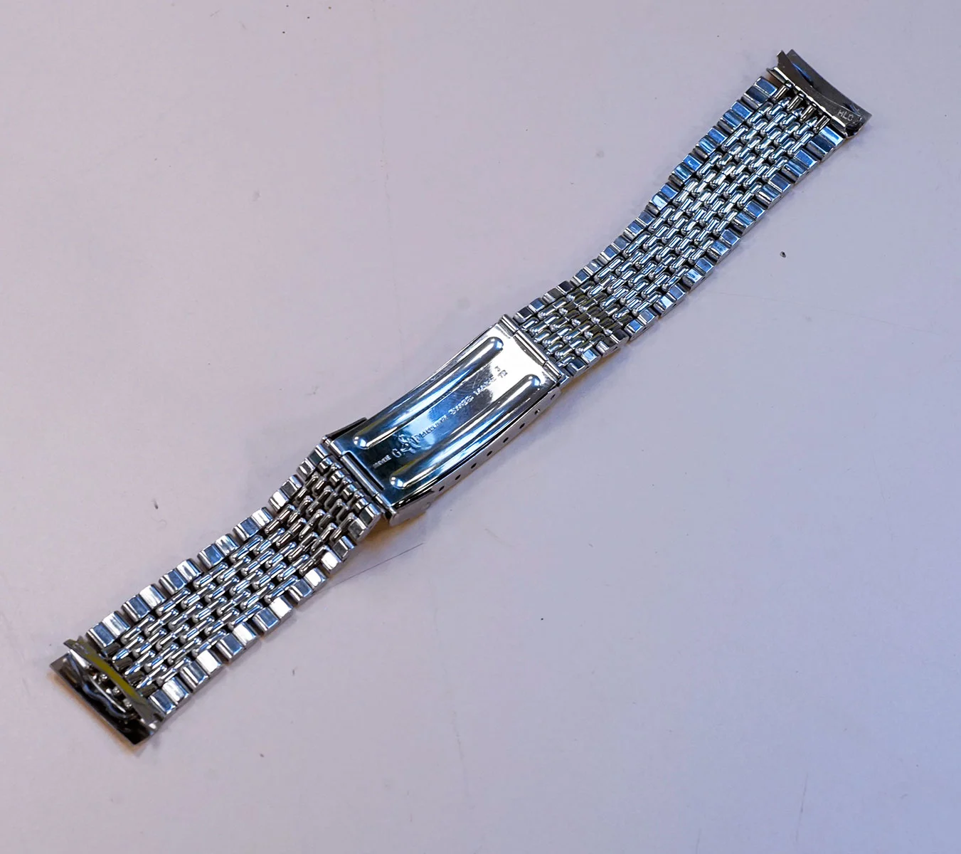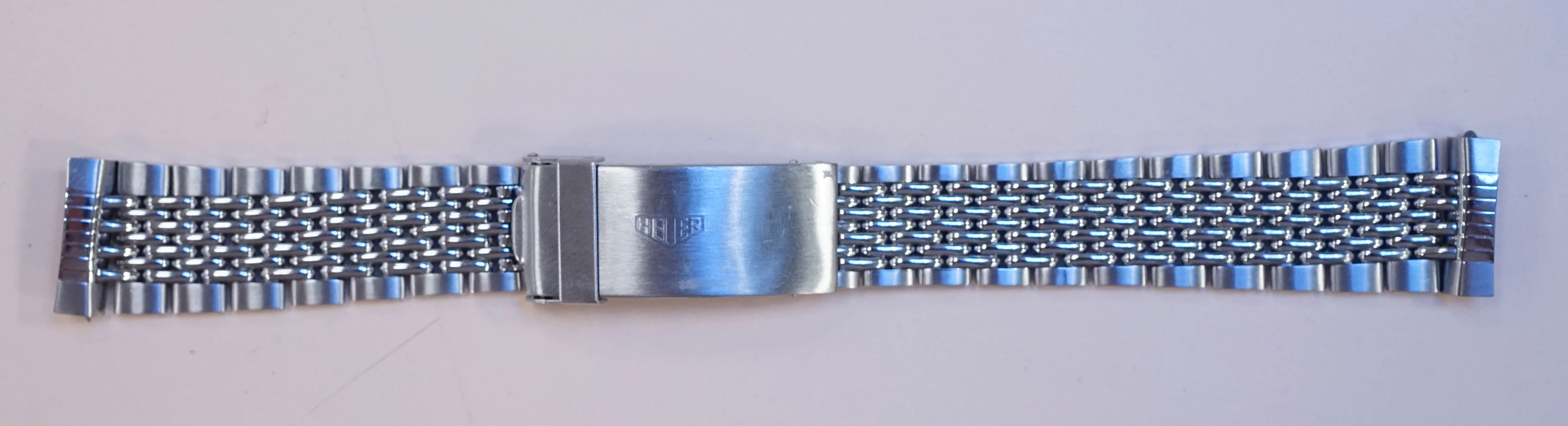 Second is a Heuer Gay Freres Beads of Rice Bracelet. This bracelet comes with HLC end links which fit Carrera models. In good vintage used condition, TZ rating conservatively at 88%, with some minor marks on the buckle and almost no stretch that is captured in pics. No broken links, or other faults. Closes tight and straight and flip lock engages very securely. Can likely fit an 8.25" wrist as the total length of the bracelet is just about 7". Stamped date of manufacture 3/72. $1600