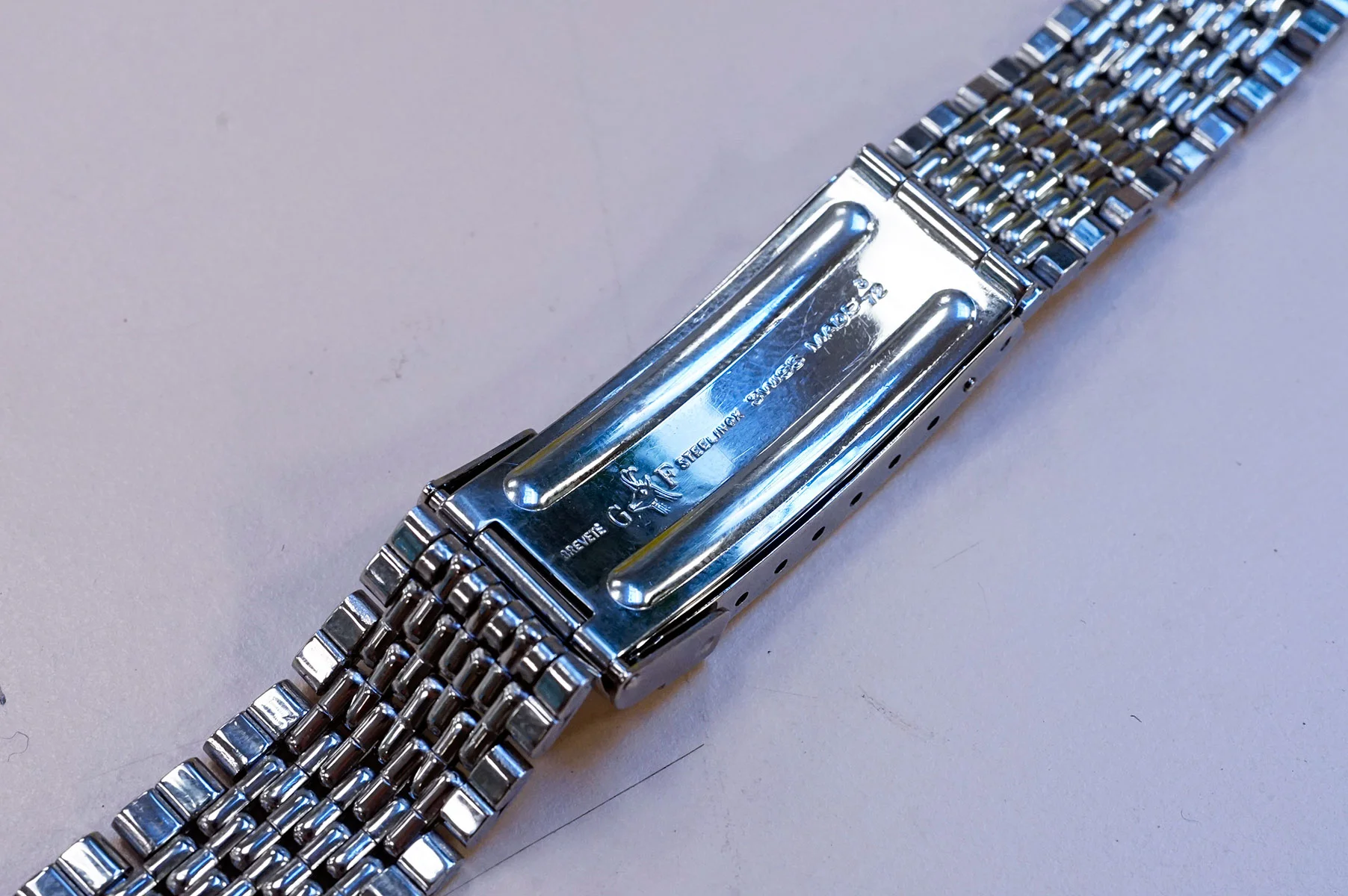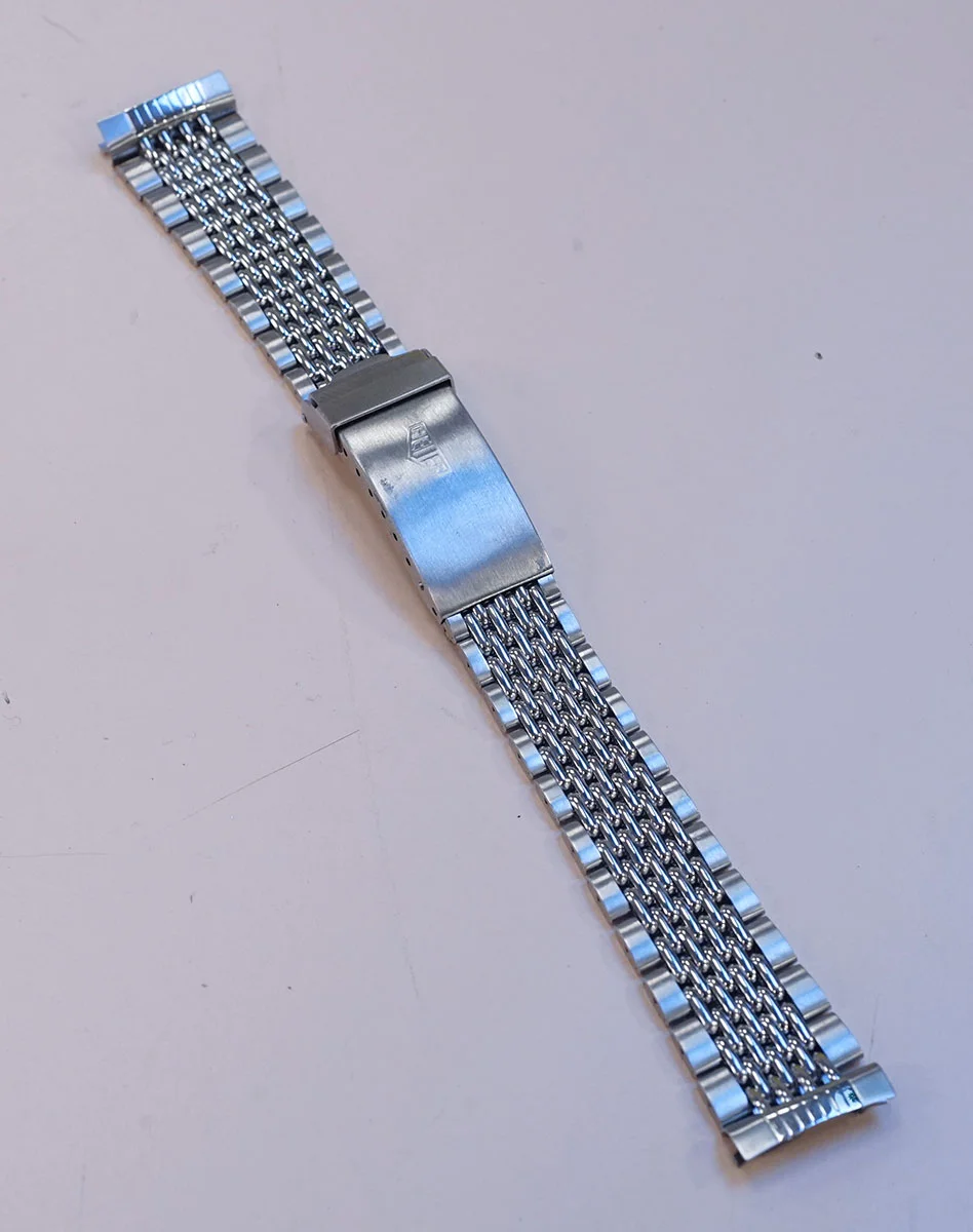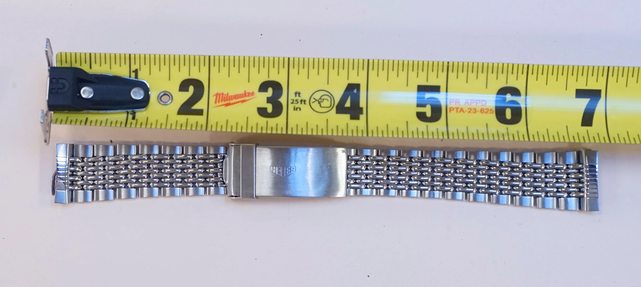 Second is a Heuer Gay Freres Beads of Rice Bracelet. This bracelet comes with HLC end links which fit Carrera models. In good vintage used condition, TZ rating conservatively at 88%, with some minor marks on the buckle and almost no stretch that is captured in pics. No broken links, or other faults. Closes tight and straight and flip lock engages very securely. Can likely fit an 8.25" wrist as the total length of the bracelet is just about 7". Stamped date of manufacture 3/72. $1600