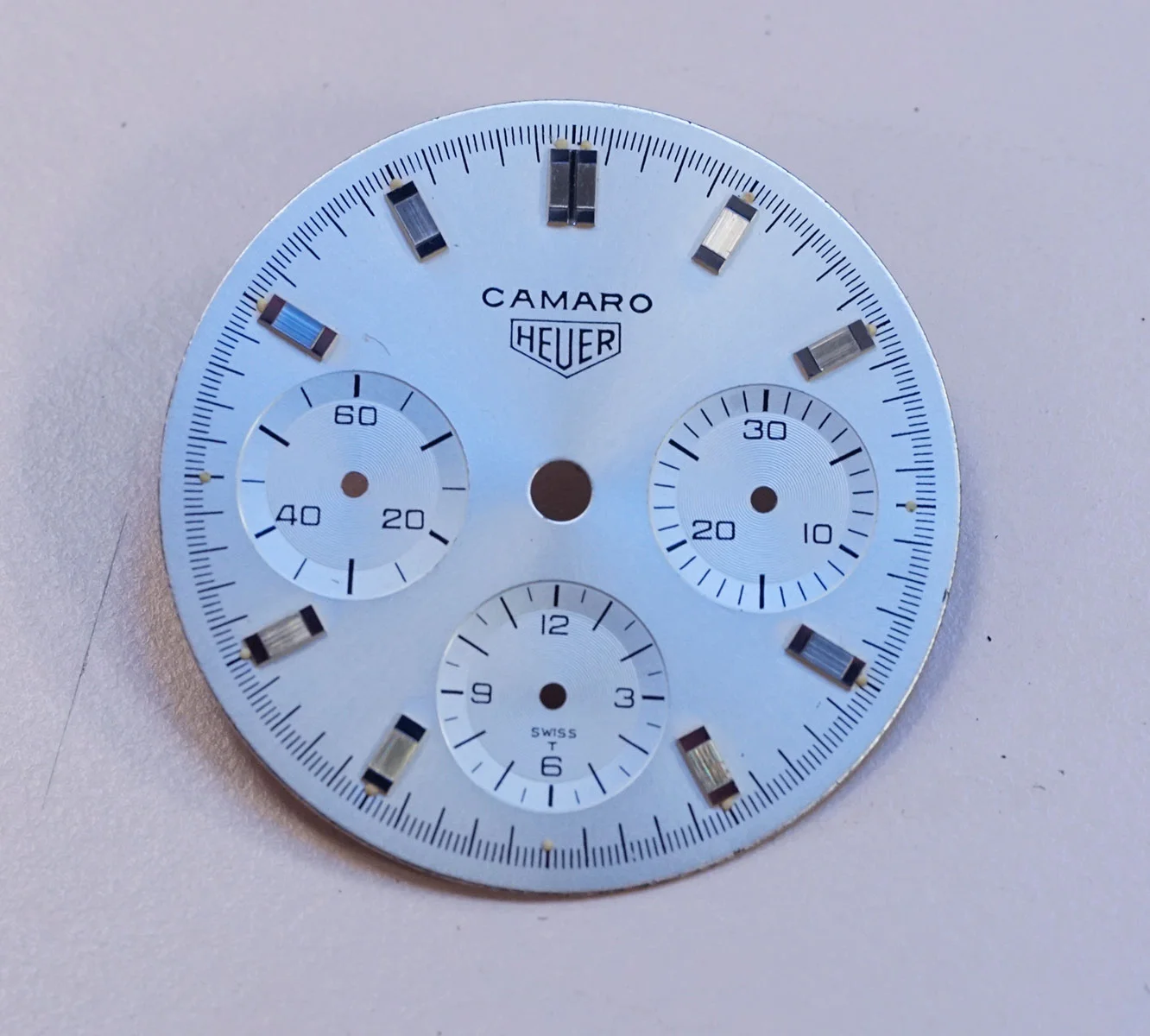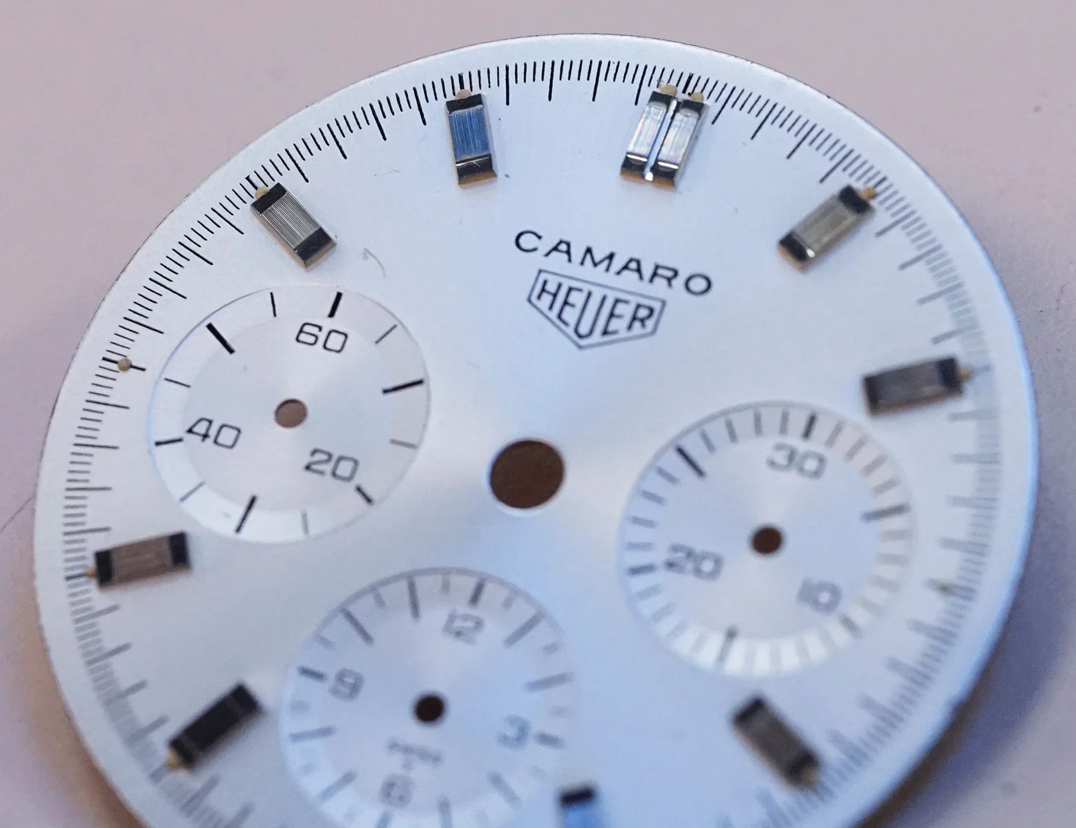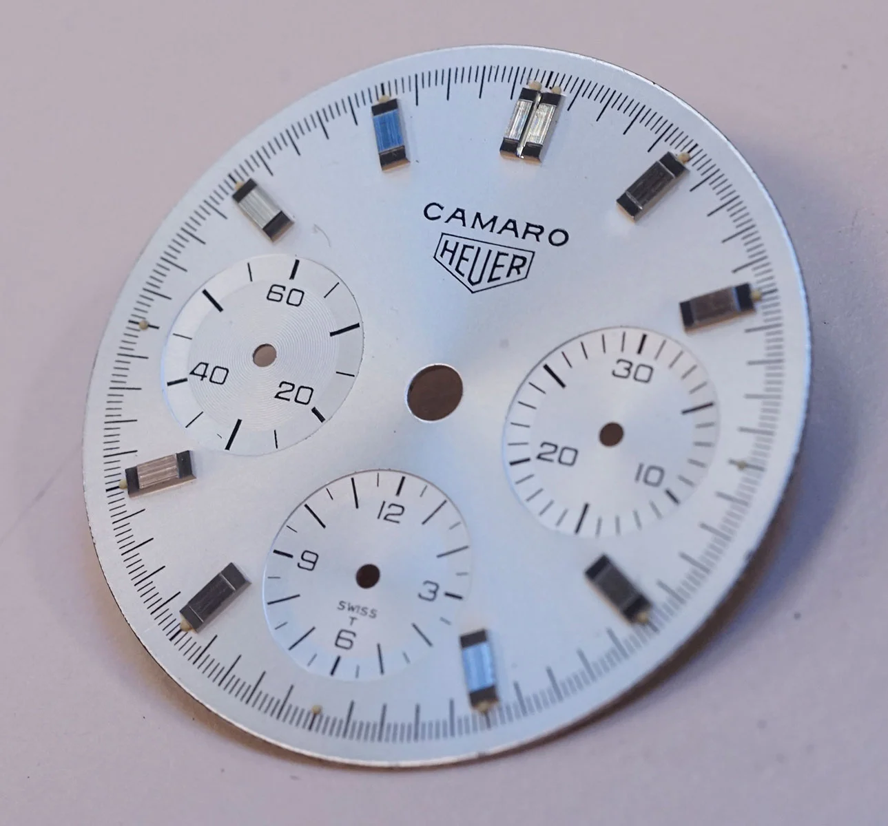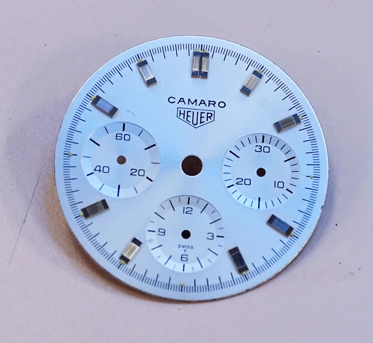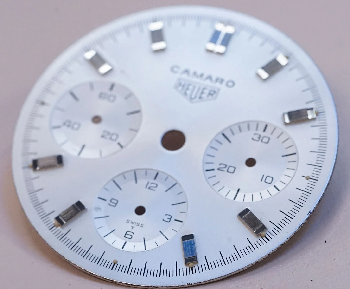 First is a Heuer Camaro 7220 S dial. In excellent overall condition with Tritium markers intact and a very clean face (except for small dust particle I didn't notcie until editing pic). Posts intact on back of dial. $400