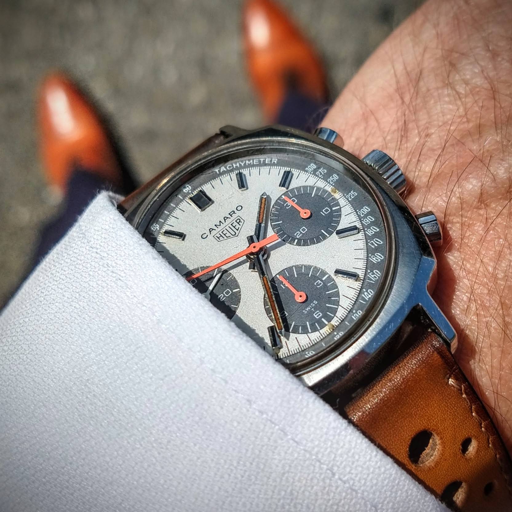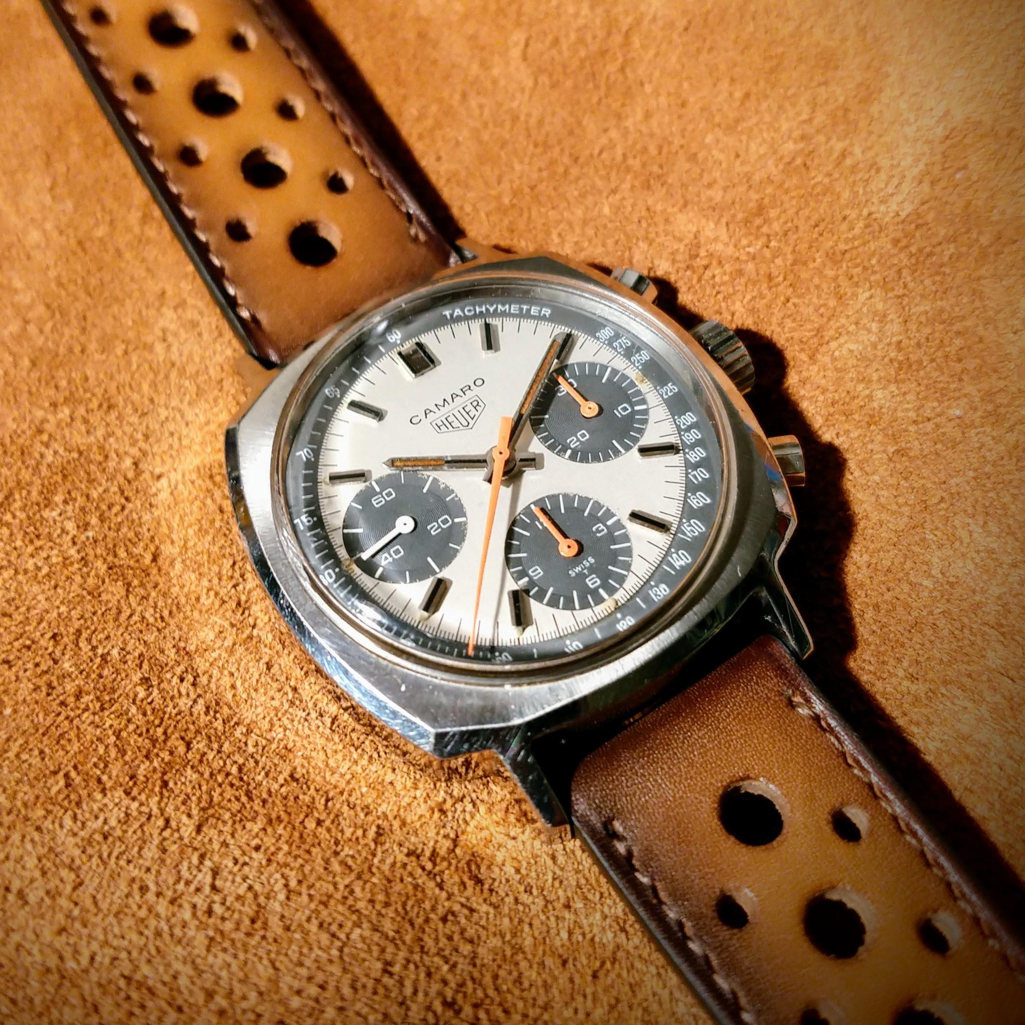 The 73643 is one of the two Camaro designs that has a full-blast 3-register Chronograph, as opposed to 2 registers a la caliber 11: it gives it a very balanced look, that does without the date window at 6 o’clock. The 73643 leverages the Valjoux 7736 caliber. The 73643 T version sports the iconic Panda dial, with bi-color hands, orange for the chrono. I could go on and on about the Camaro, but our very own Steve P does it much better than us here: https://www.heuercamaro.com/overview .Steve even specifically elaborates on the 73643 here : https://www.heuercamaro.com/models/73643 .