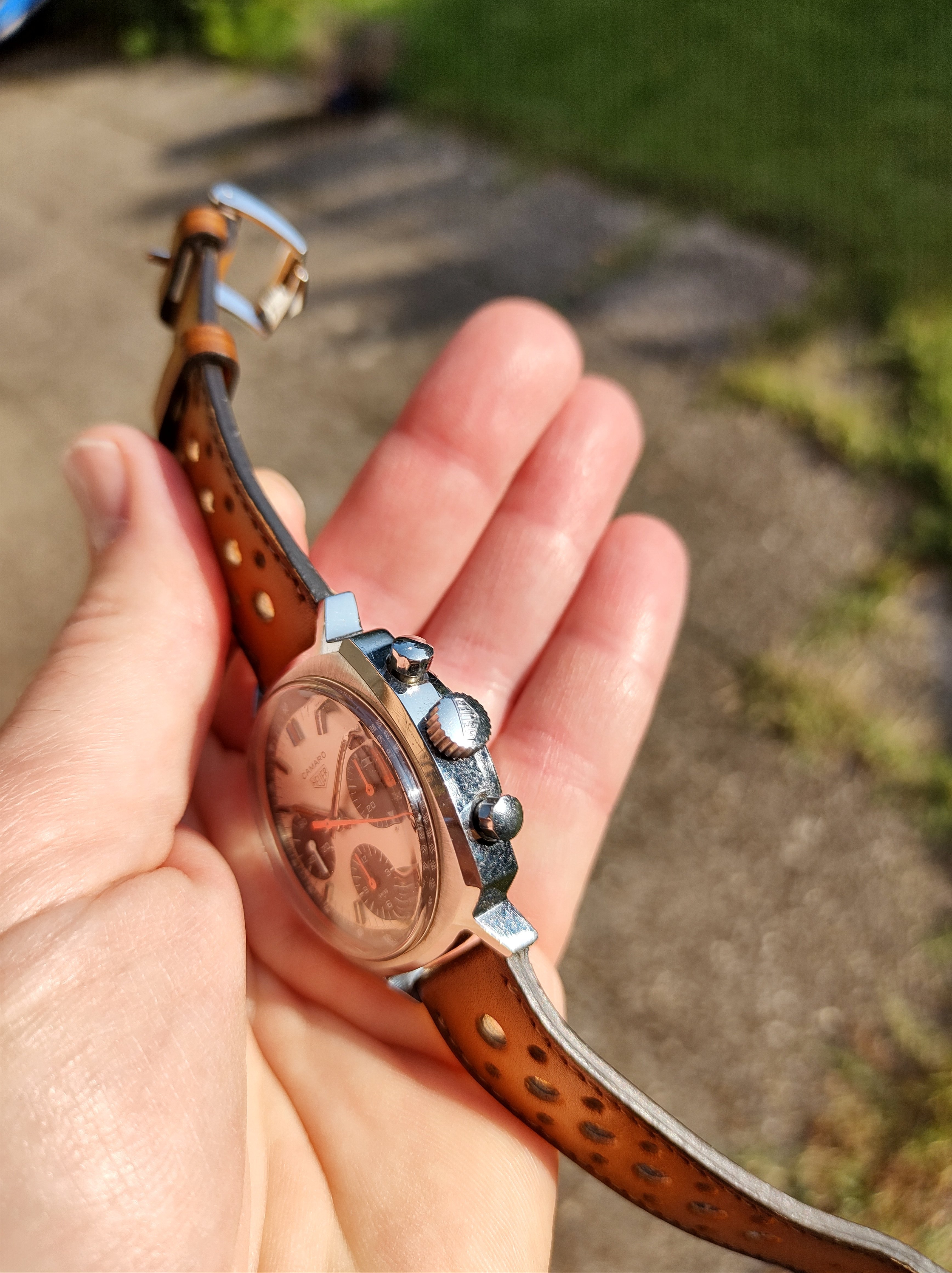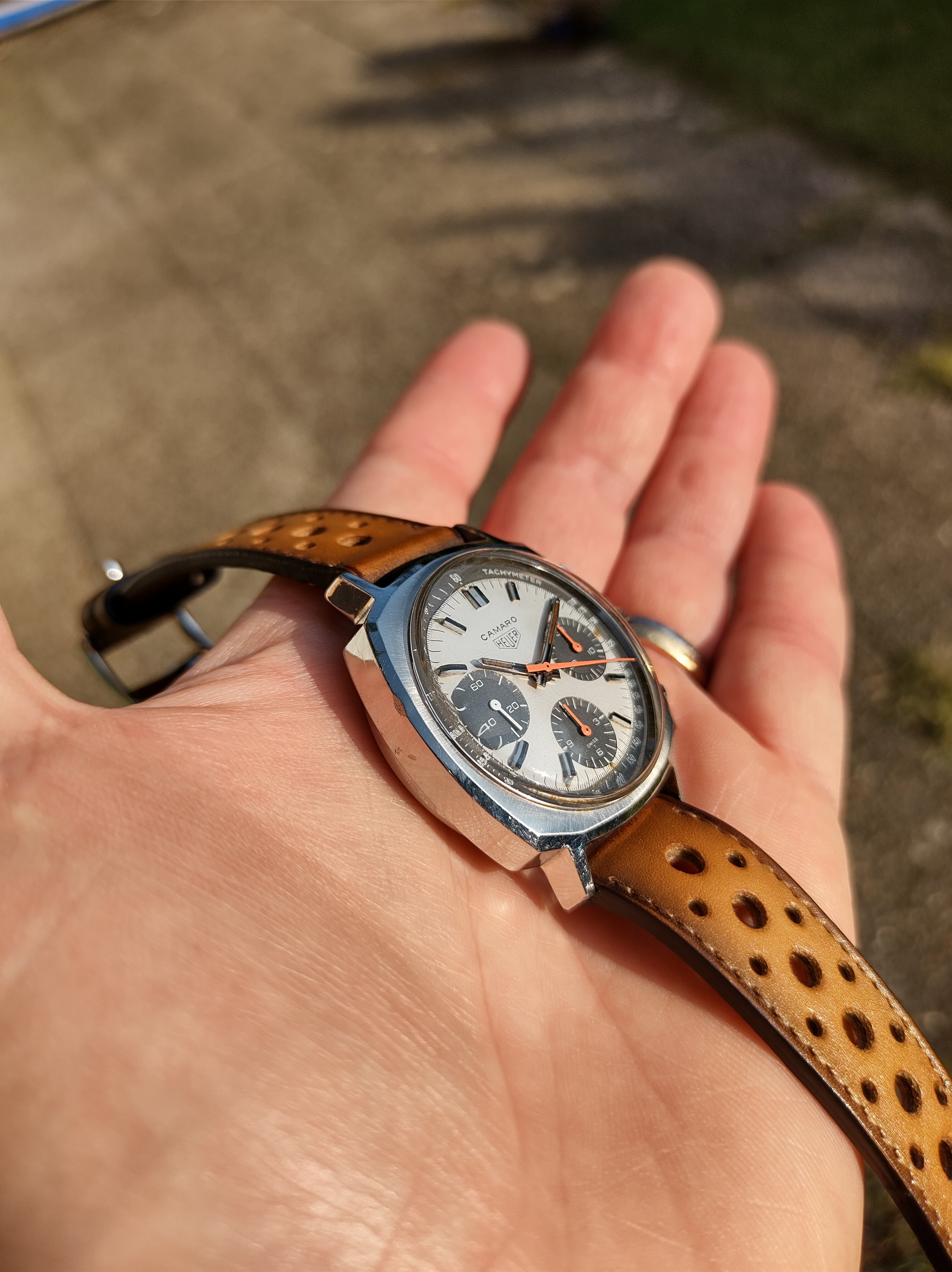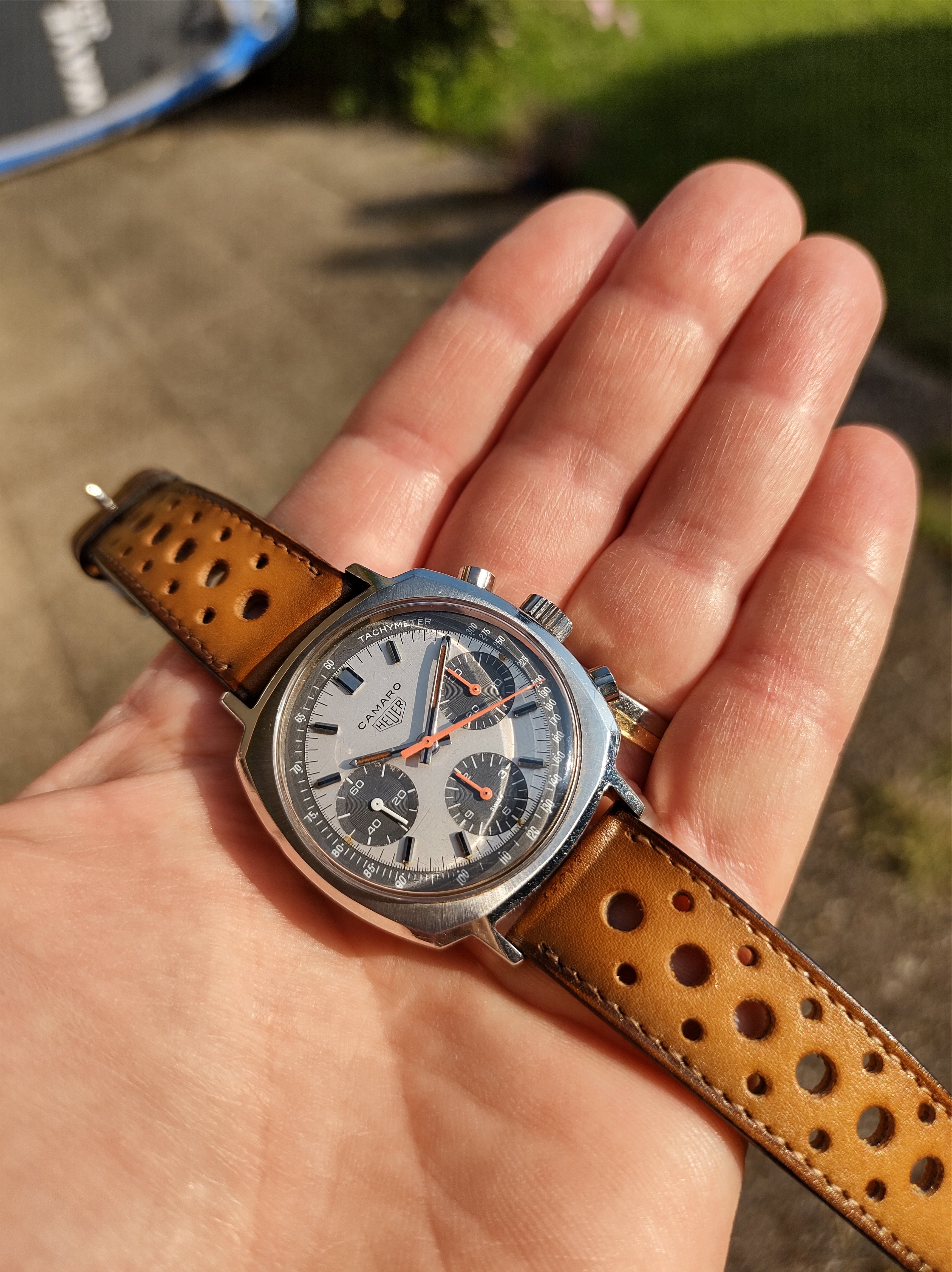 Overall this “Exotic” Camaro is it great condition for a 50 year-old watch. It does show some battle scars on the case, while it retains some of the original brushing on the top side. There is some color degradation on the subdials, and also around the lume plots. The 70’s two-color Heuer dials are unfortunately notably famous for this. The hands do show some mild corrosion, which has been mostly polished out at the time when I bought it, but the vigilant user can still spot them when looking closely.