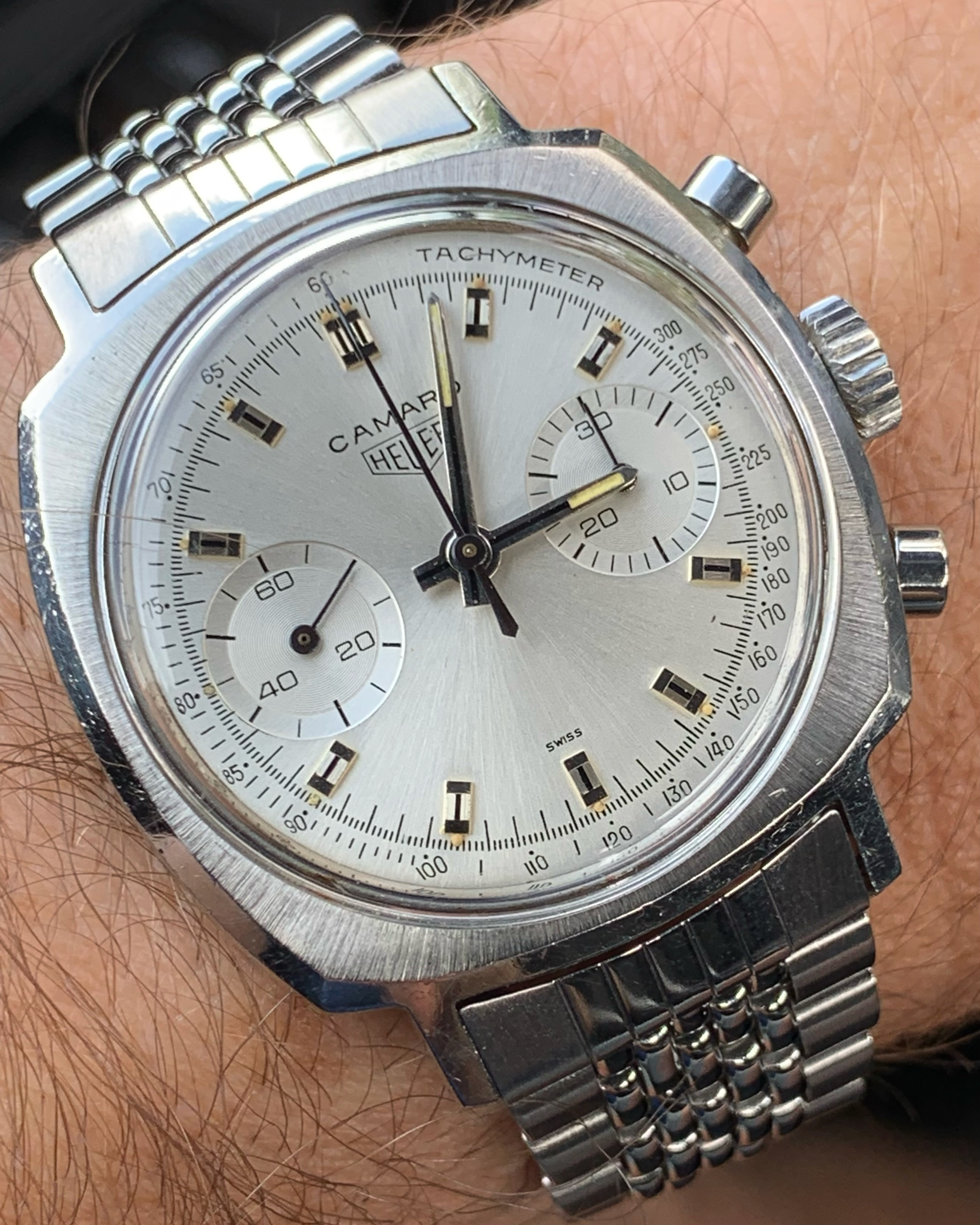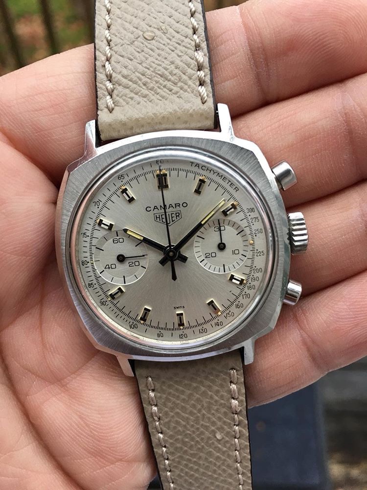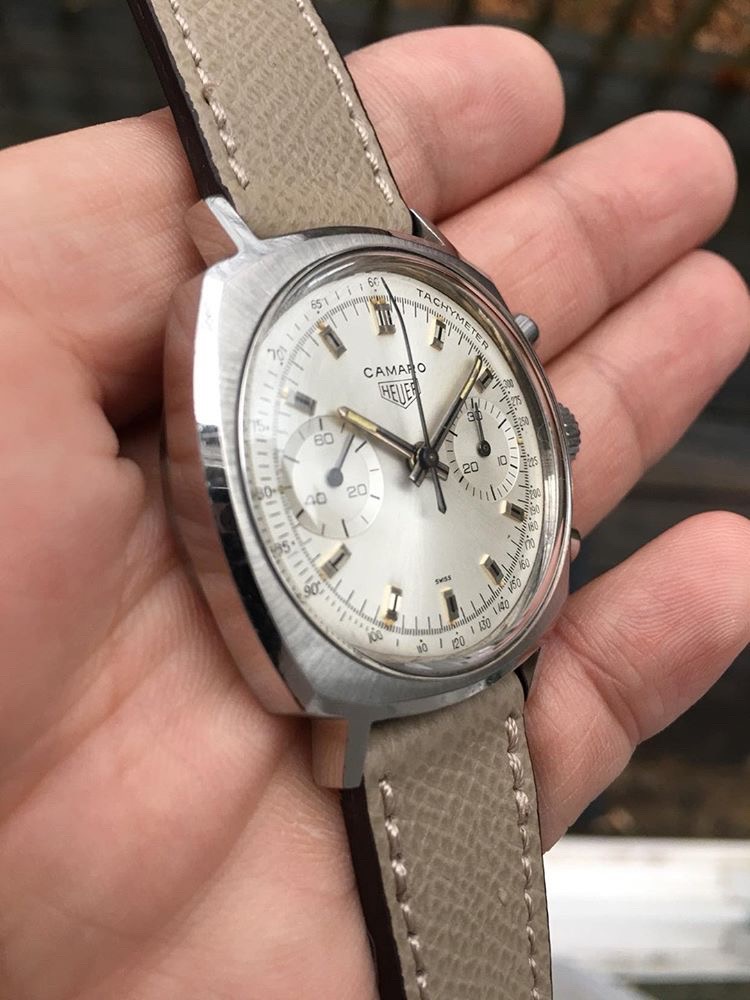 UP FOR SALE A ORIGINAL SILVER DIAL HEUER CAMARO CHRONOGRAPH FROM THE LATE 1960'S. GREAT SPORTY LOOK. CASE MEASURES 37 X 44 MM…ORIGINAL DIAL, HANDS AND CROWN… HEUER CAL. 7730 VALJOUX 17 JEWELS HAND WOUND MOVEMENT. WATCH RUNS, AND IS READY TO WEAR…MY ASKING PRICE is $4500 +SHIPPING. I'm obviously happy to answer any questions or provide more pictures. (The Watch is located in Florida)…(Watch Only)