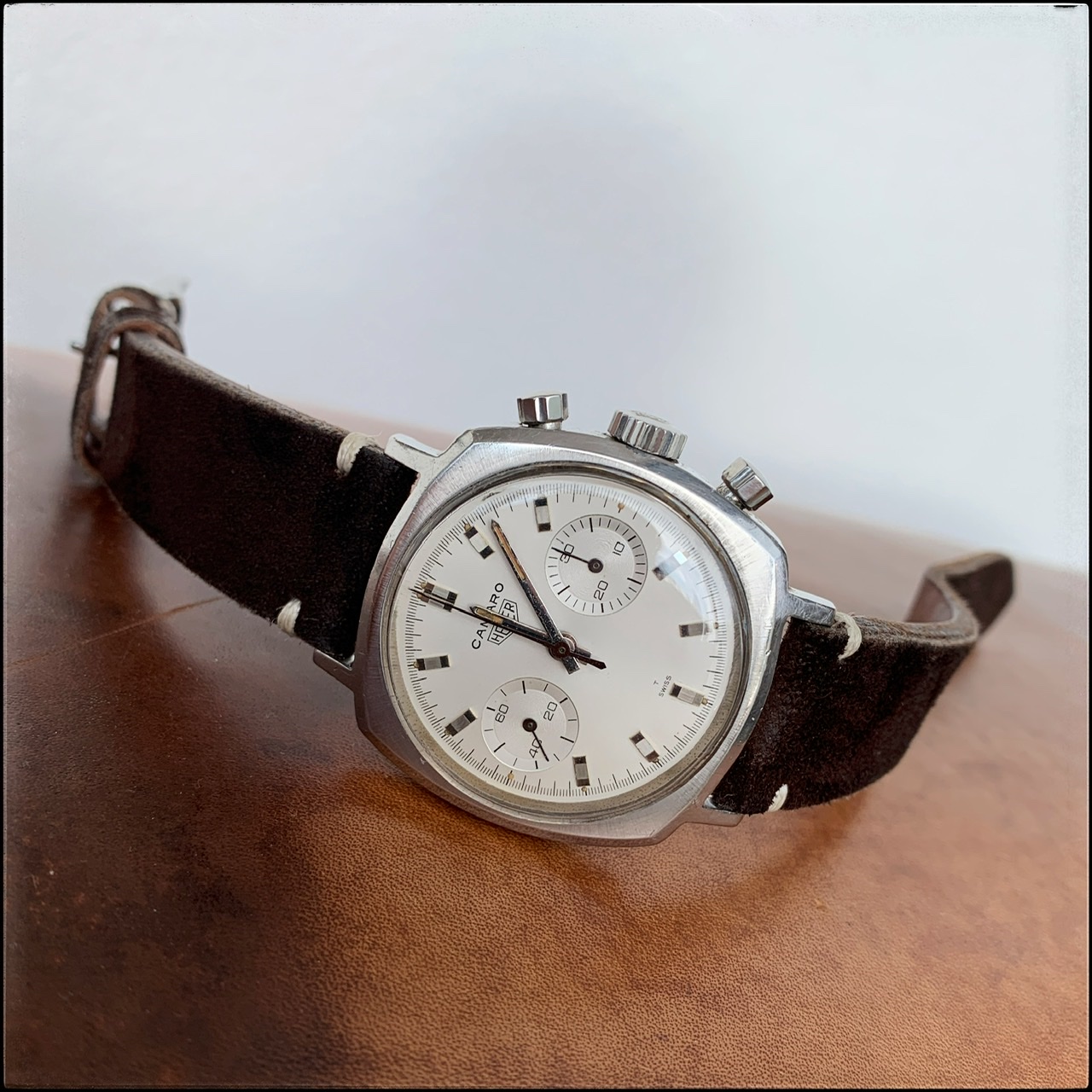 It has a very nice flat white looking dial similar to the early Carreras as opposed to the very common silver burst dial. The case is very sharp, with all the factory lines and finish still being present and pronounced. So my guess is, that it has never been refurbished etc. Just like we all love it with the right amount of wear but no major scuffs or dings etc.