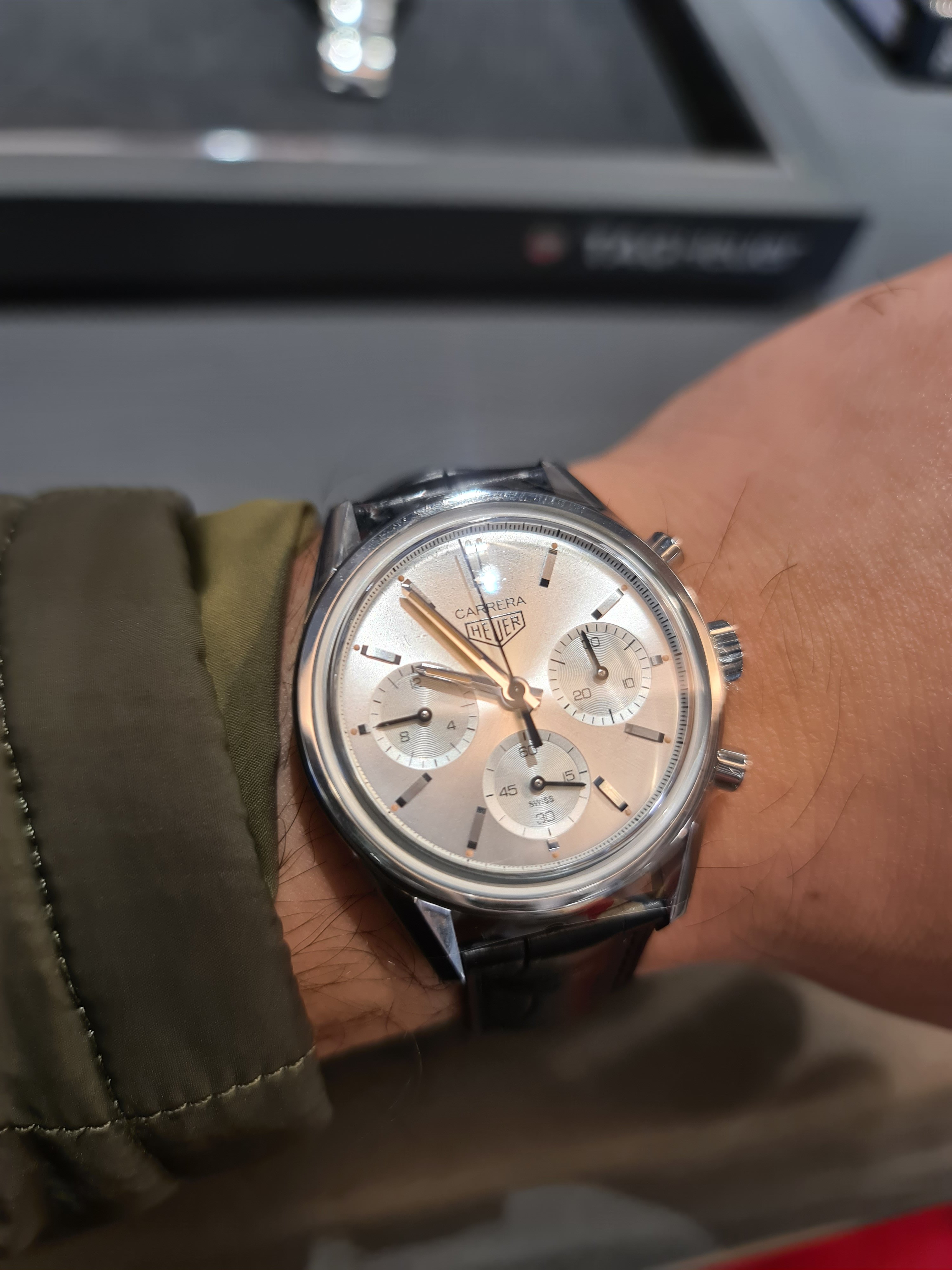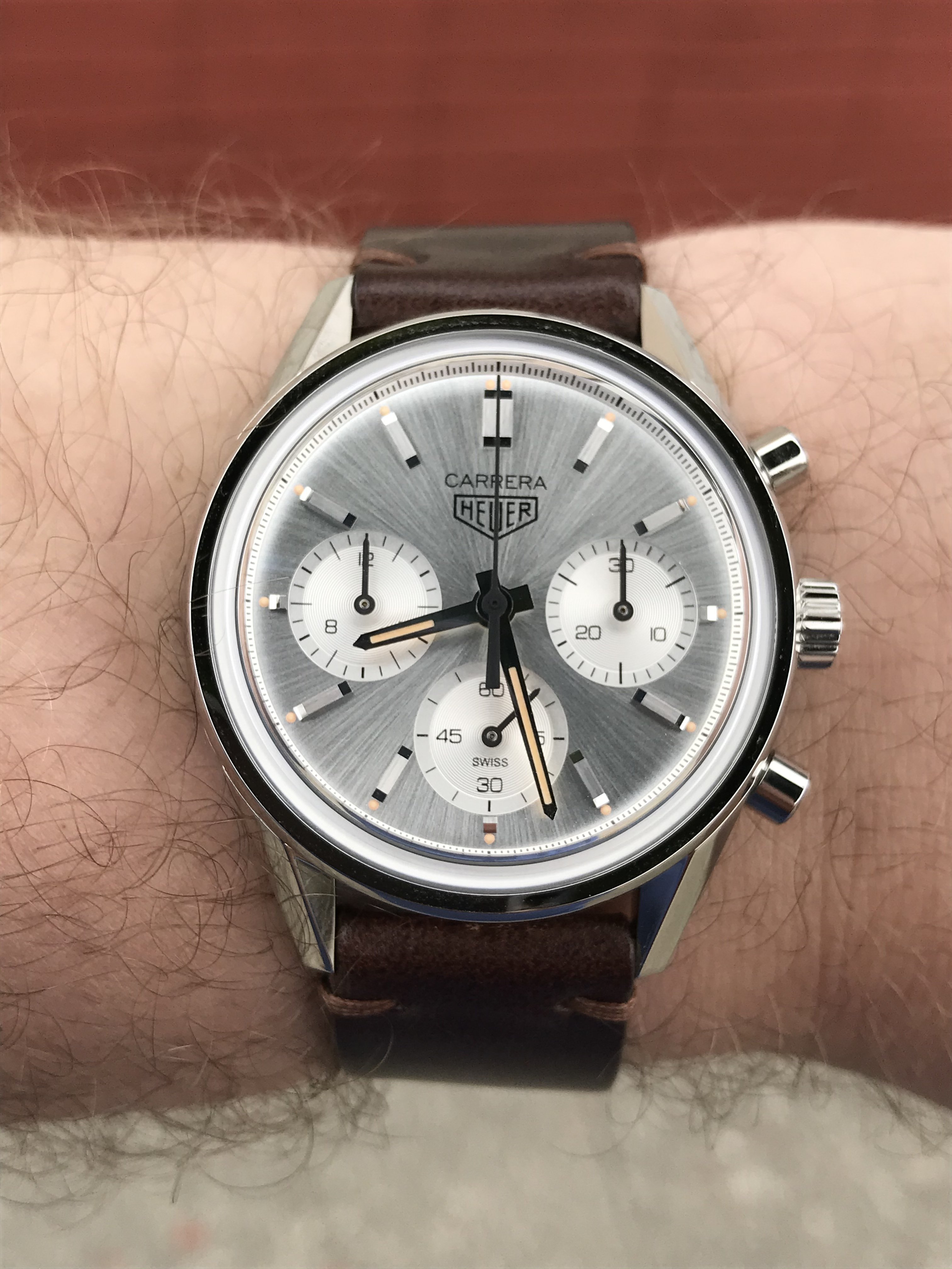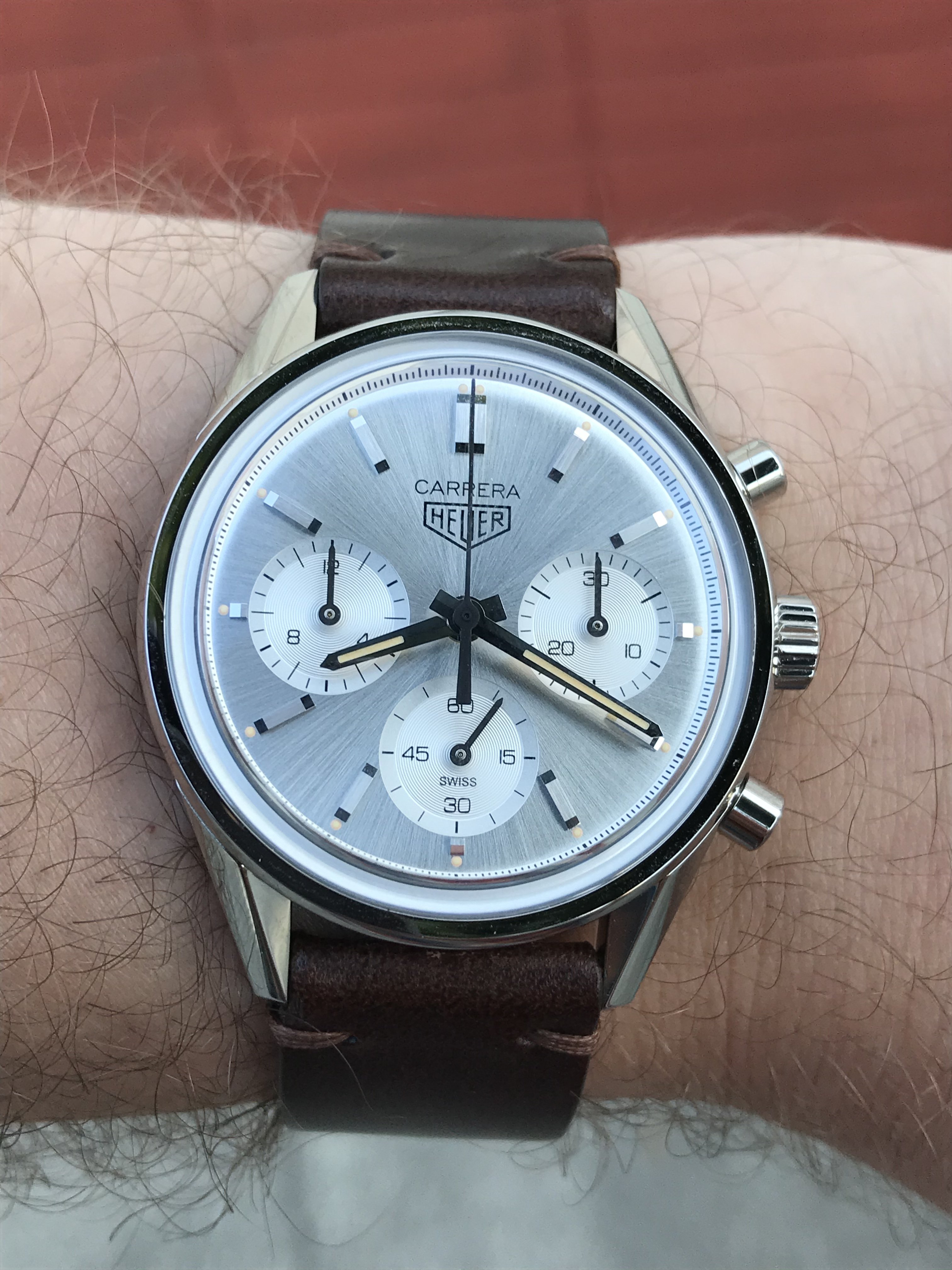 Photos below from TAG site. That nearly orange/ochre lume draws in my eyes before I see the silver dial and hands, which is a pity. The lume in OPs photo isn't as in-your-face - not sure whether that's the camera angle and reflected shop lighting, and maybe in real 39mm life the lume isn't as obvious. Otherwise really like this and, switched to a black rally strap, probably even better.