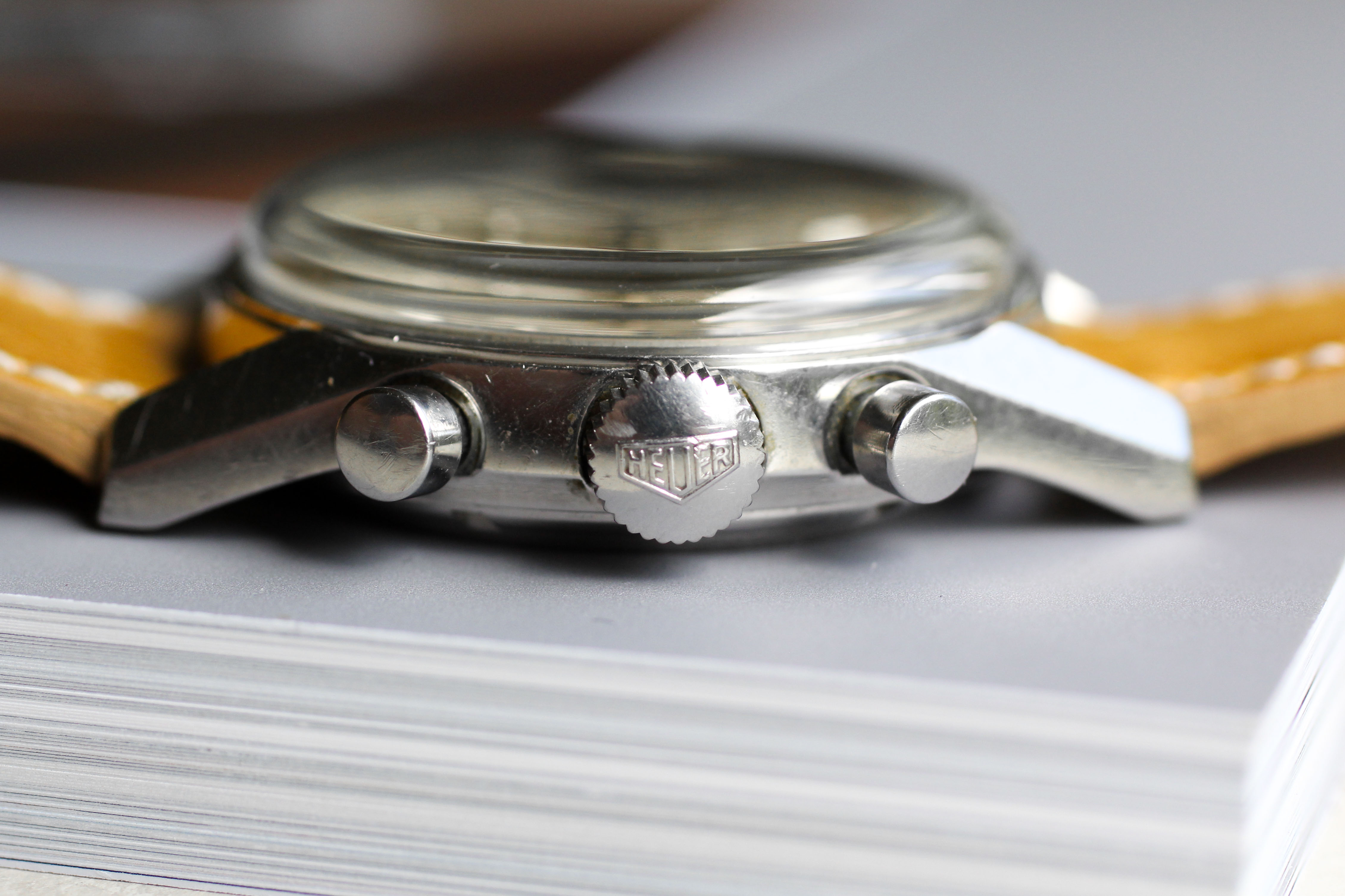 Dial: The silver dial on this Carrera is in excellent overall condition, with one scratch near the 9 o'clock marker and another (very small) marking near the 3 o'clock areas. Both marks are from an incorrect crystal that was installed on the watch when I found it. The lume plot at 9 o'clock is shrunken, though that is extremely common with the dials that did not have an applied marker in the corners. First generation tachy scale is vibrant and in great condition and the rest of the lume plots are present, undamaged, and matching with a beautiful custard shade of patina.