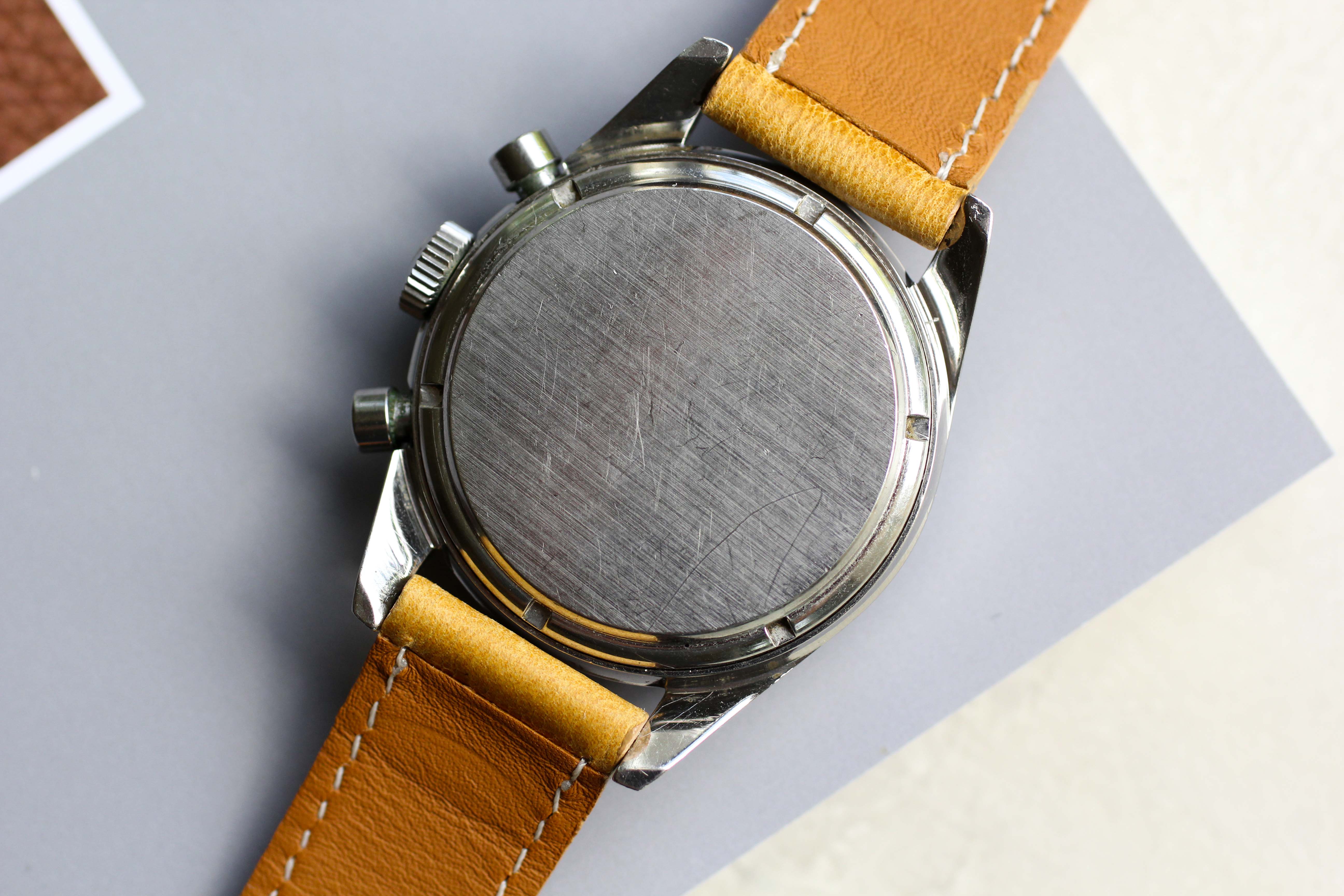 Movement: Valjoux 72 movement is original and very clean. I have worn the watch fairly often over the past couple of weeks and it keeps good time (note: I do not formally time my watches) with a strong power reserve. Chronograph functions correctly and stops/resets crisply. I will note that the minute subdial hand is offset from the minute lines by a minuscule amount, which does not bother me but may concern some of our OCD members here!
