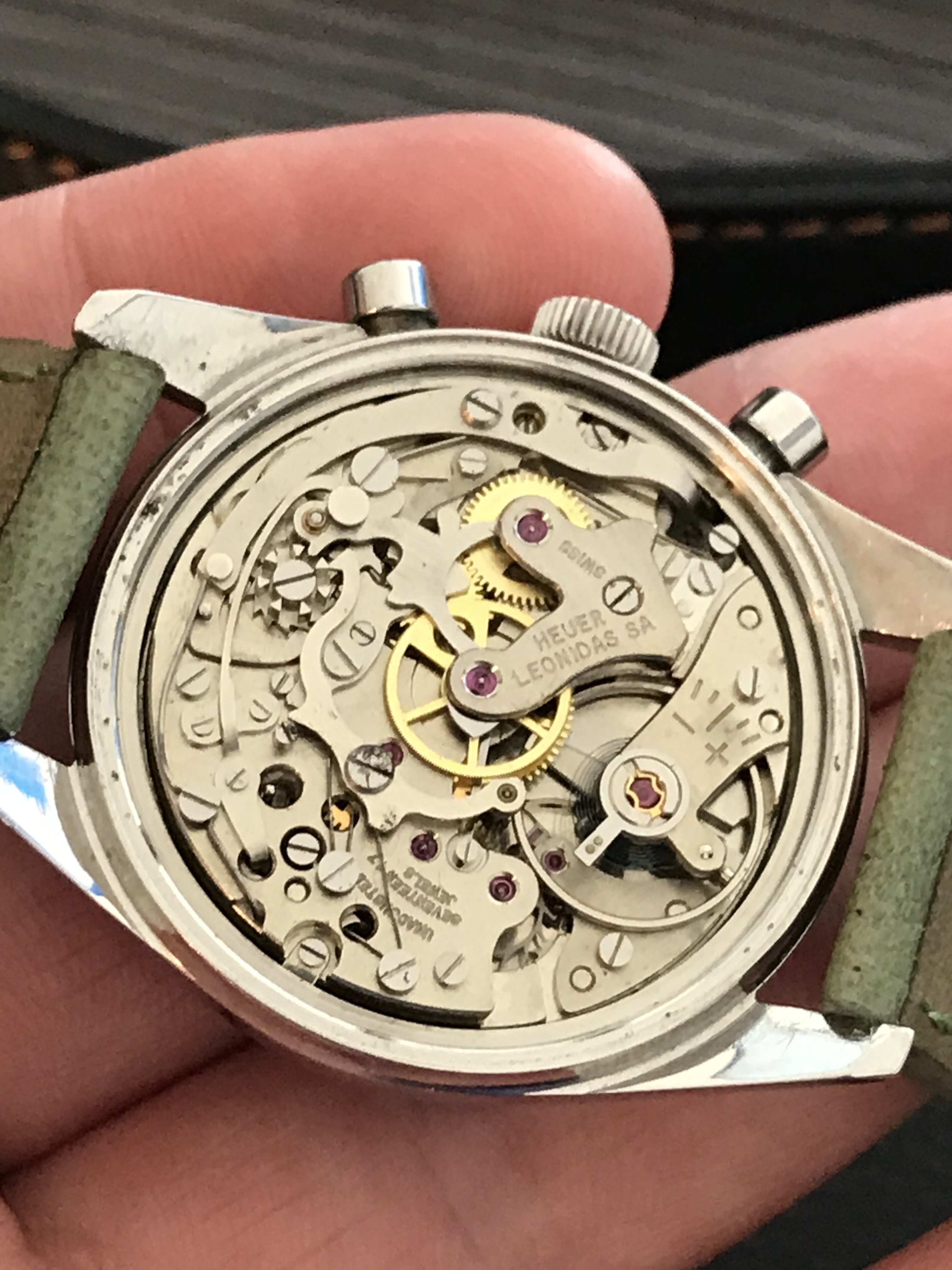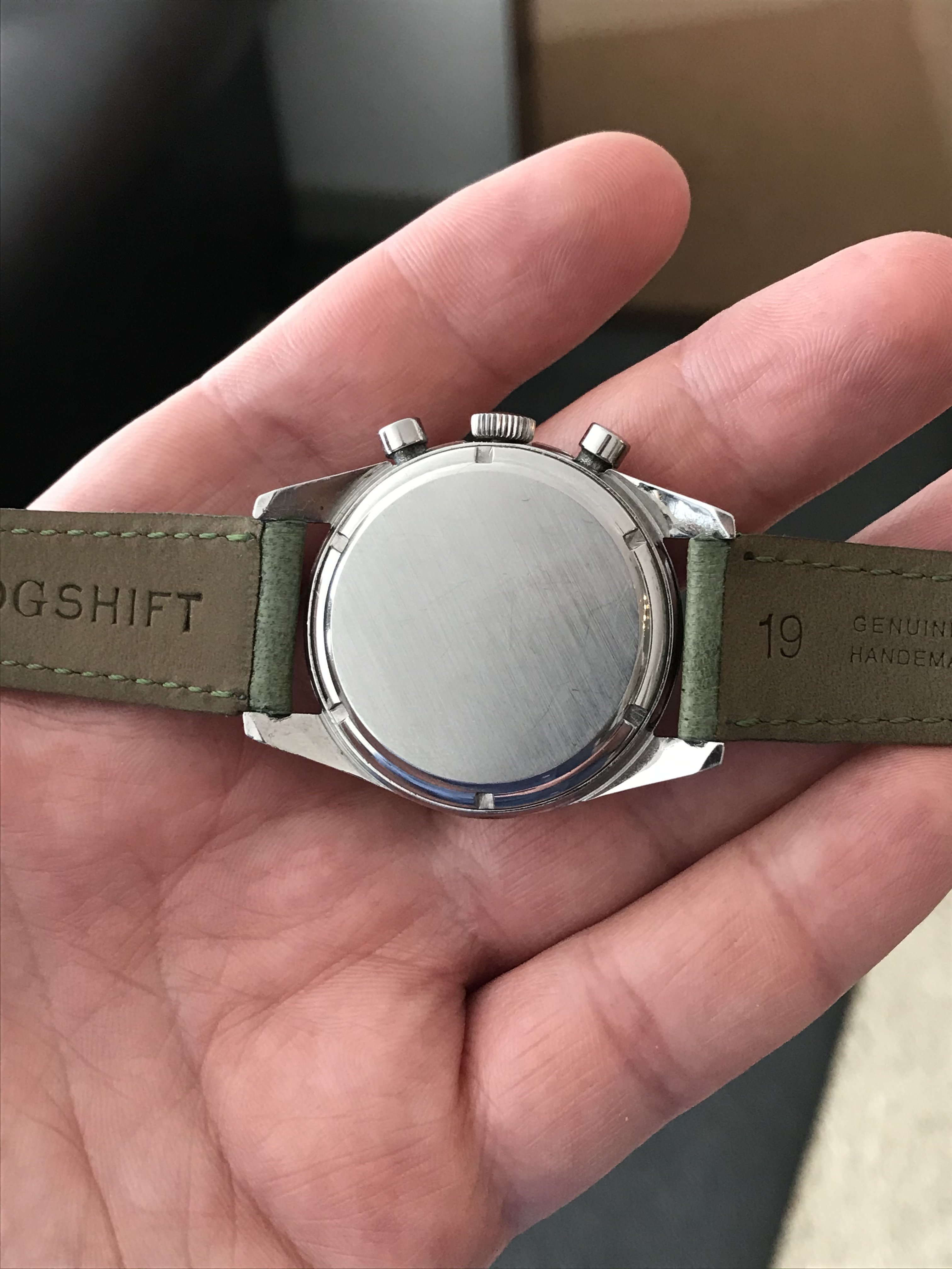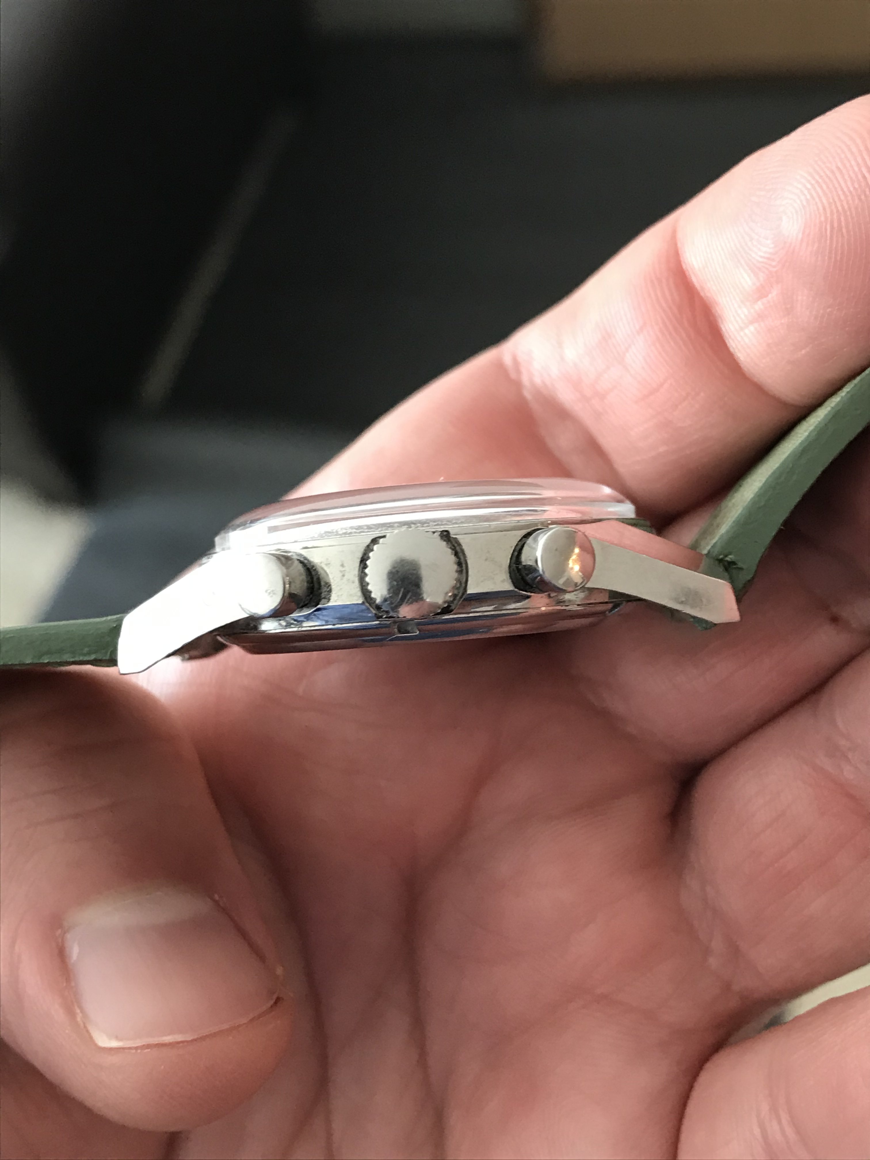 The Valjoux 92 column wheel movement runs well, keeping time and chrono functions all work properly. The previous owner stated that it had been serviced by Abel Court in 2019, but I don’t have documentation to support that.