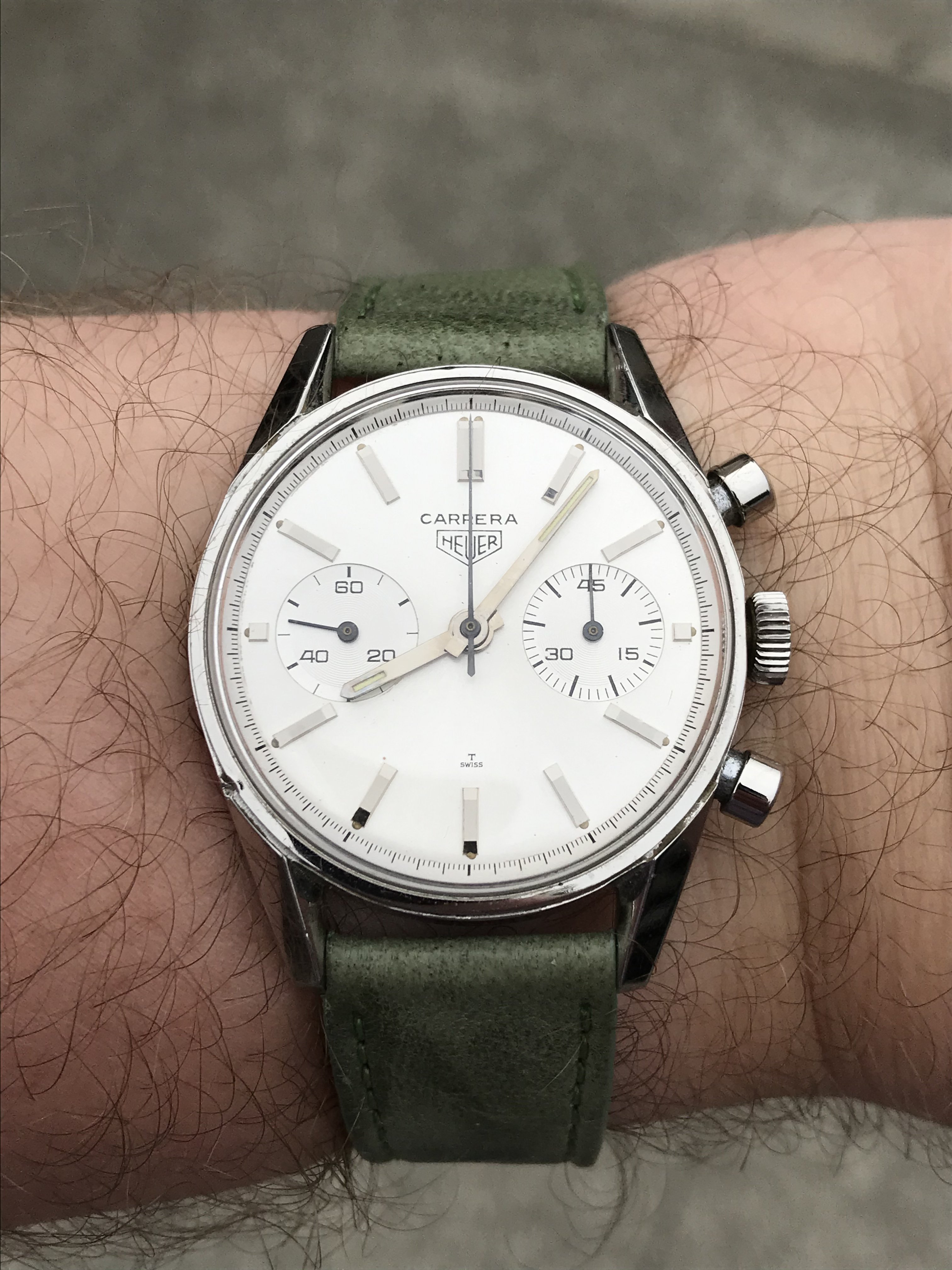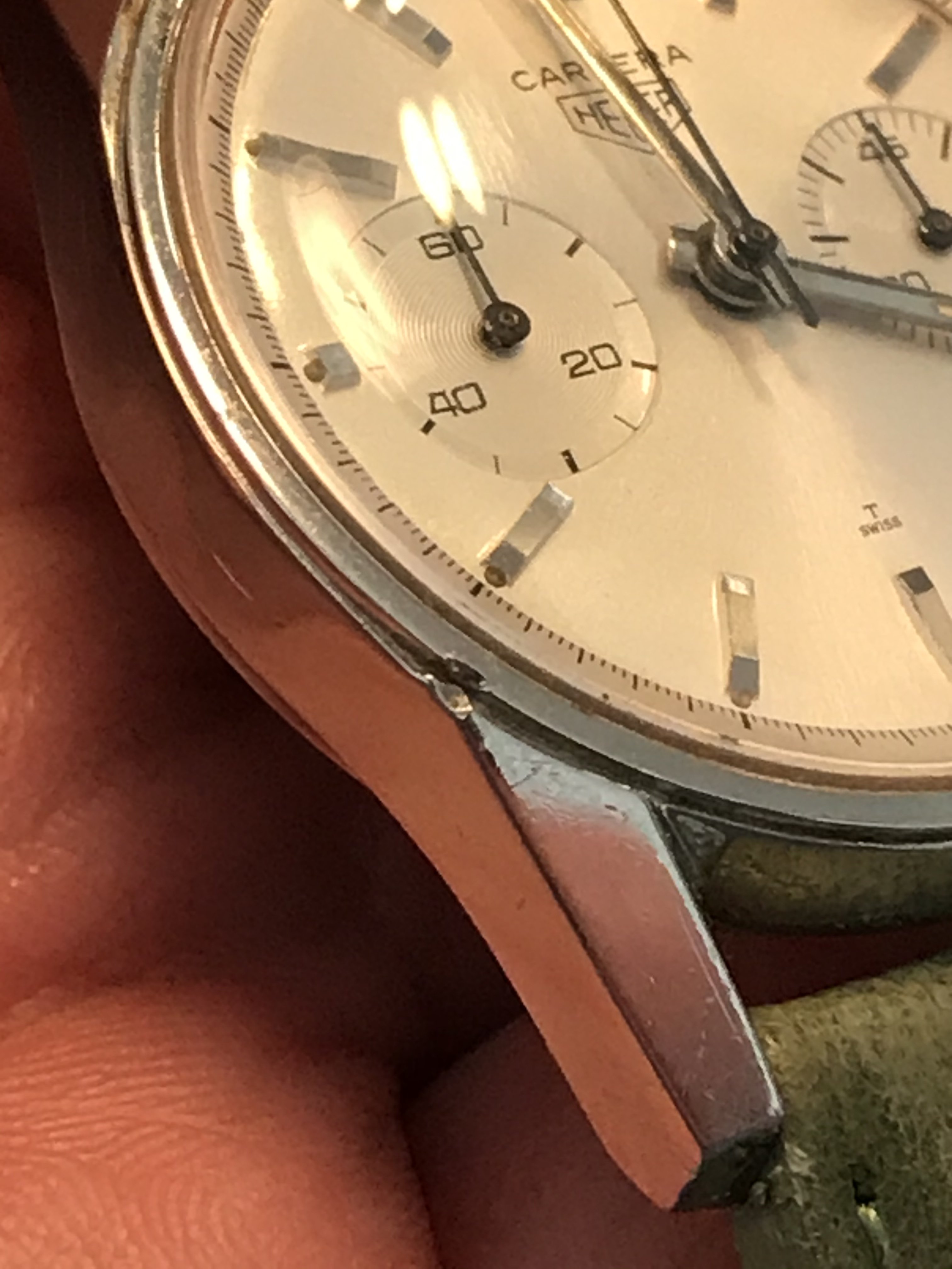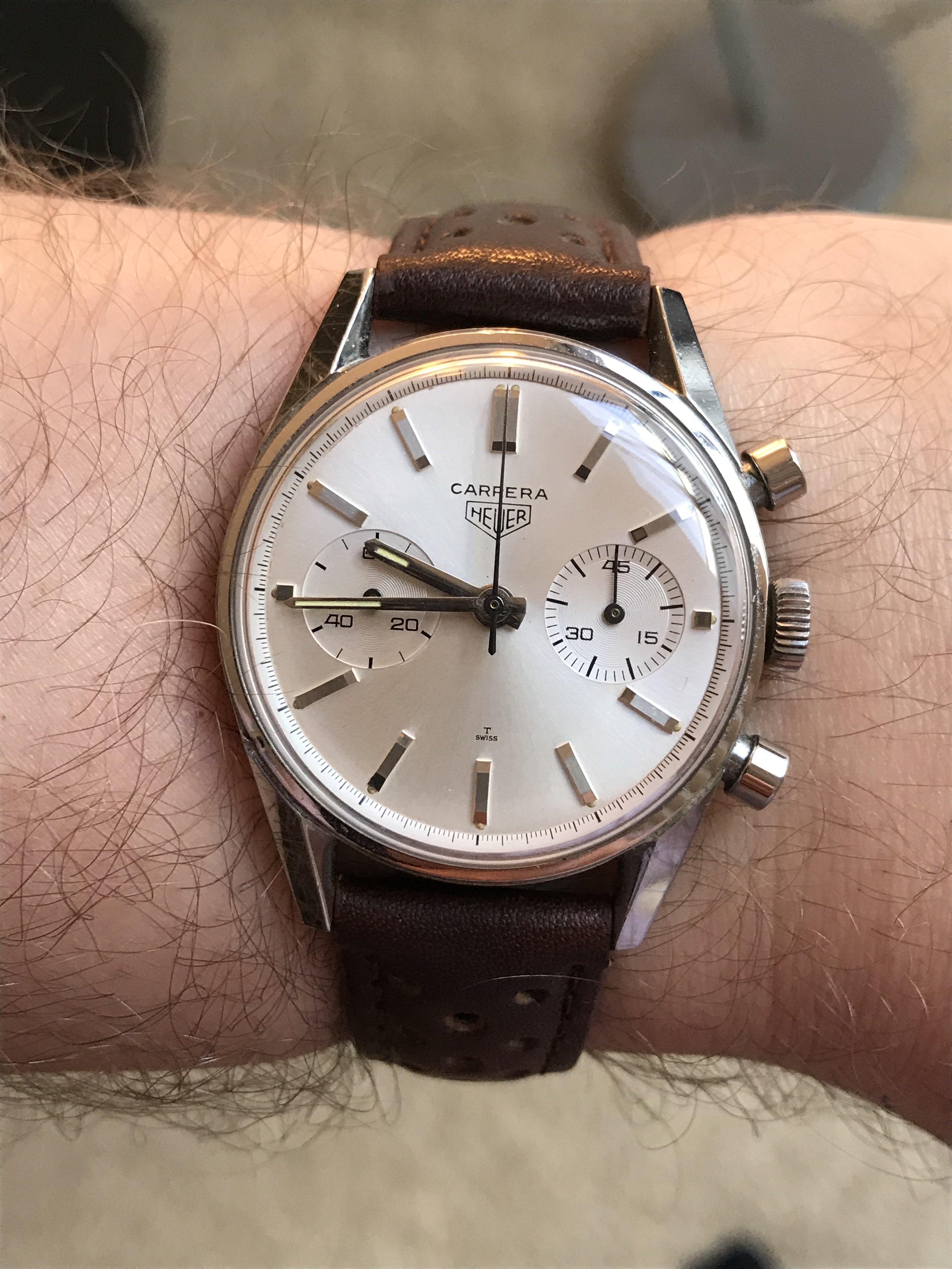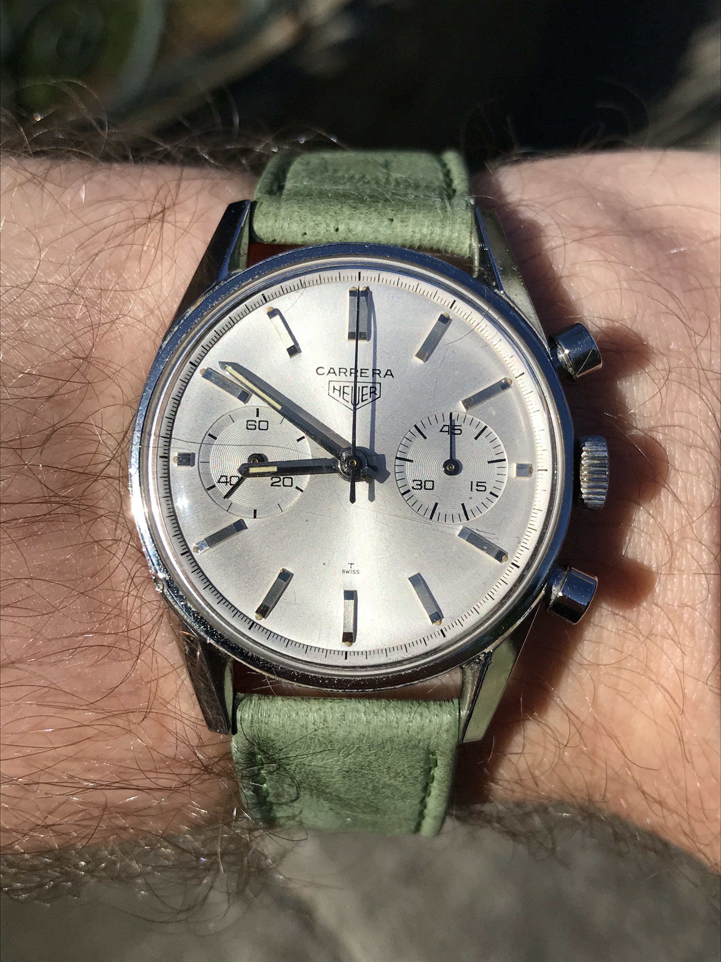 The Valjoux 92 column wheel movement runs well, keeping time and chrono functions all work properly. The previous owner stated that it had been serviced by Abel Court in 2019, but I don’t have documentation to support that.