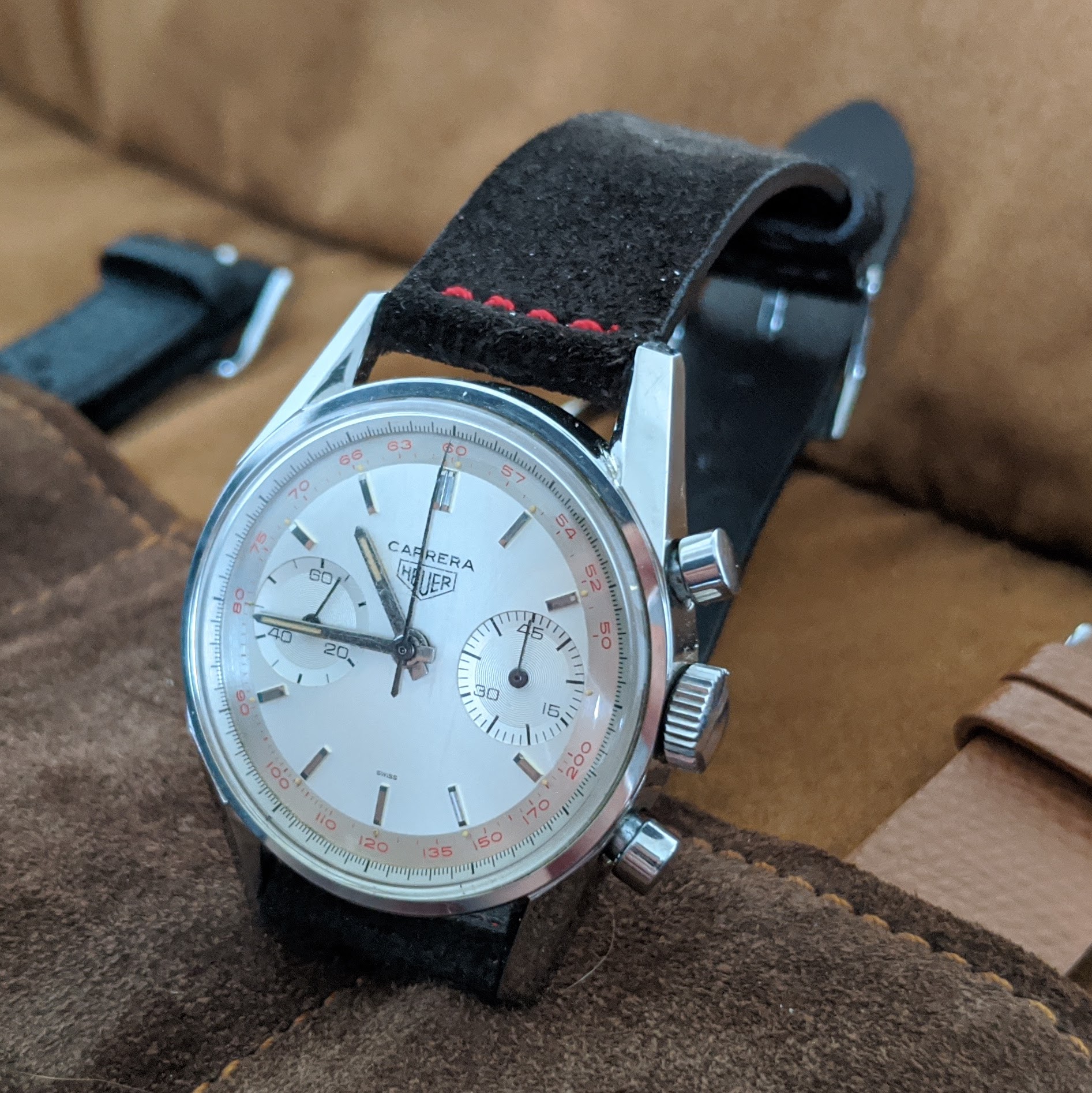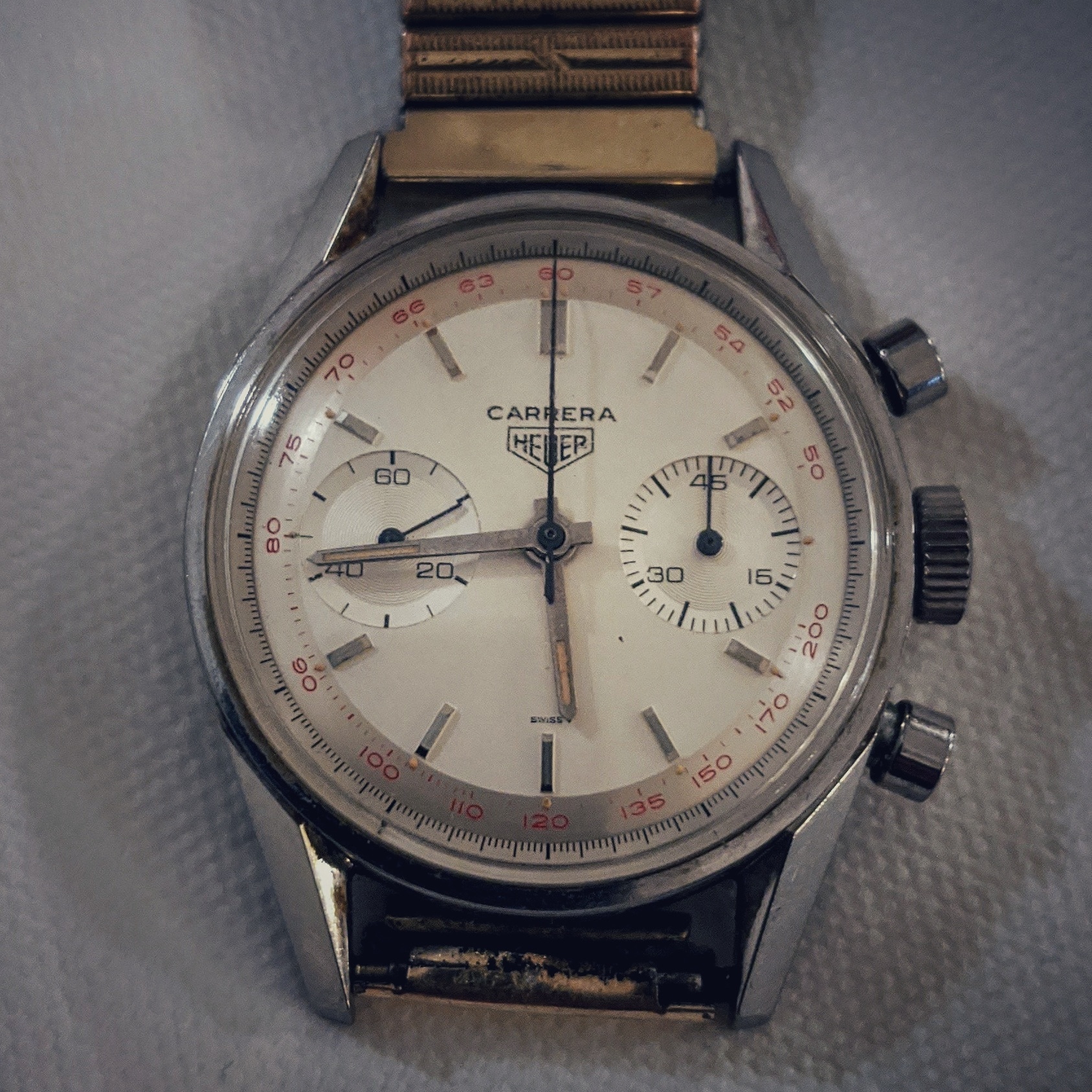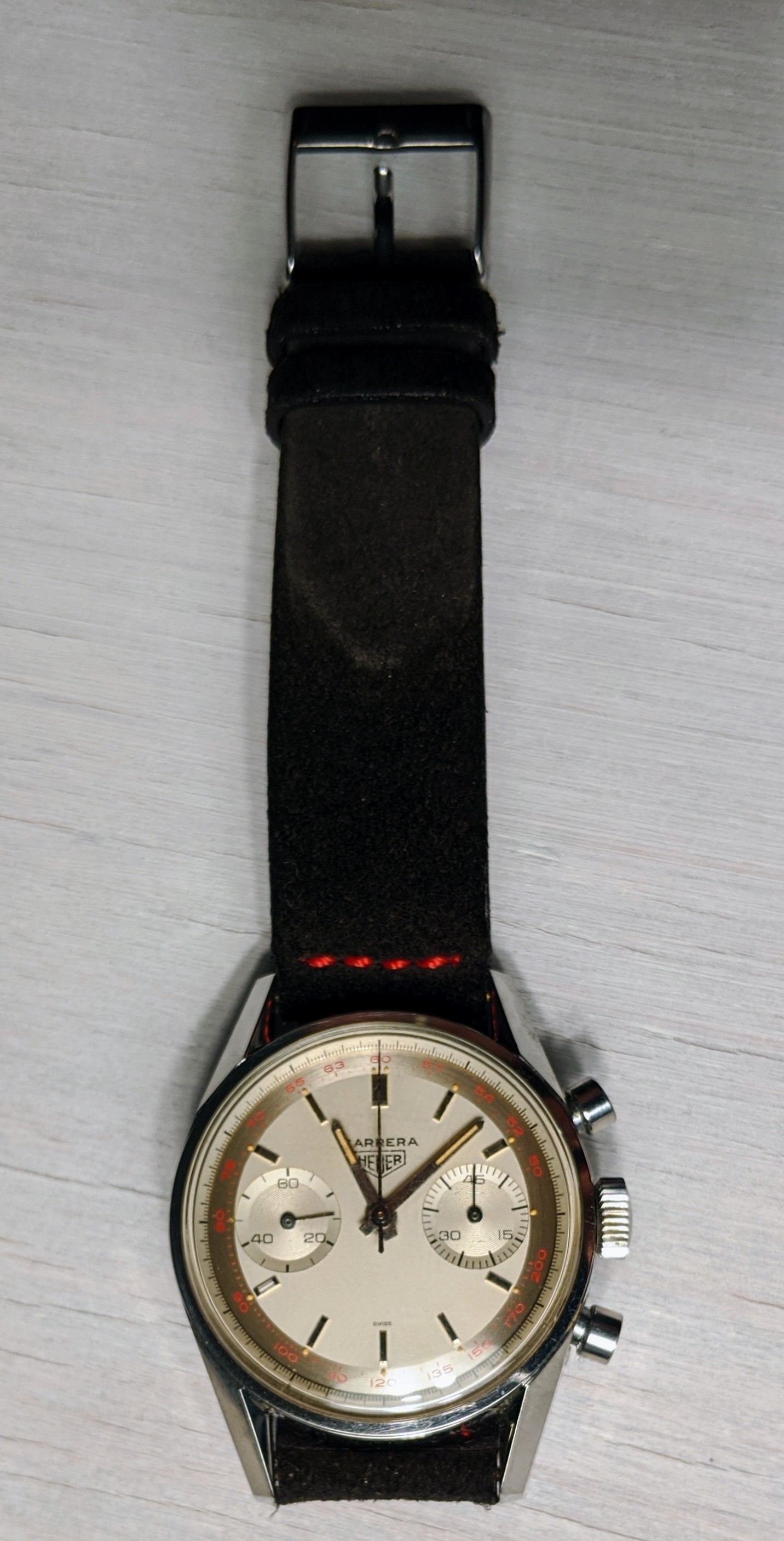 What I now own is a Heuer Carrera which was on my list, met a nice seller, had an adventure with my watchmaker friend and in the end a rare First execution Heuer, perfectly original in great condition - Ed Heuer signed Valjoux 92, Swiss only dial pointing Most probably to Radium, Red Tachy - I am truely grateful 馃榿