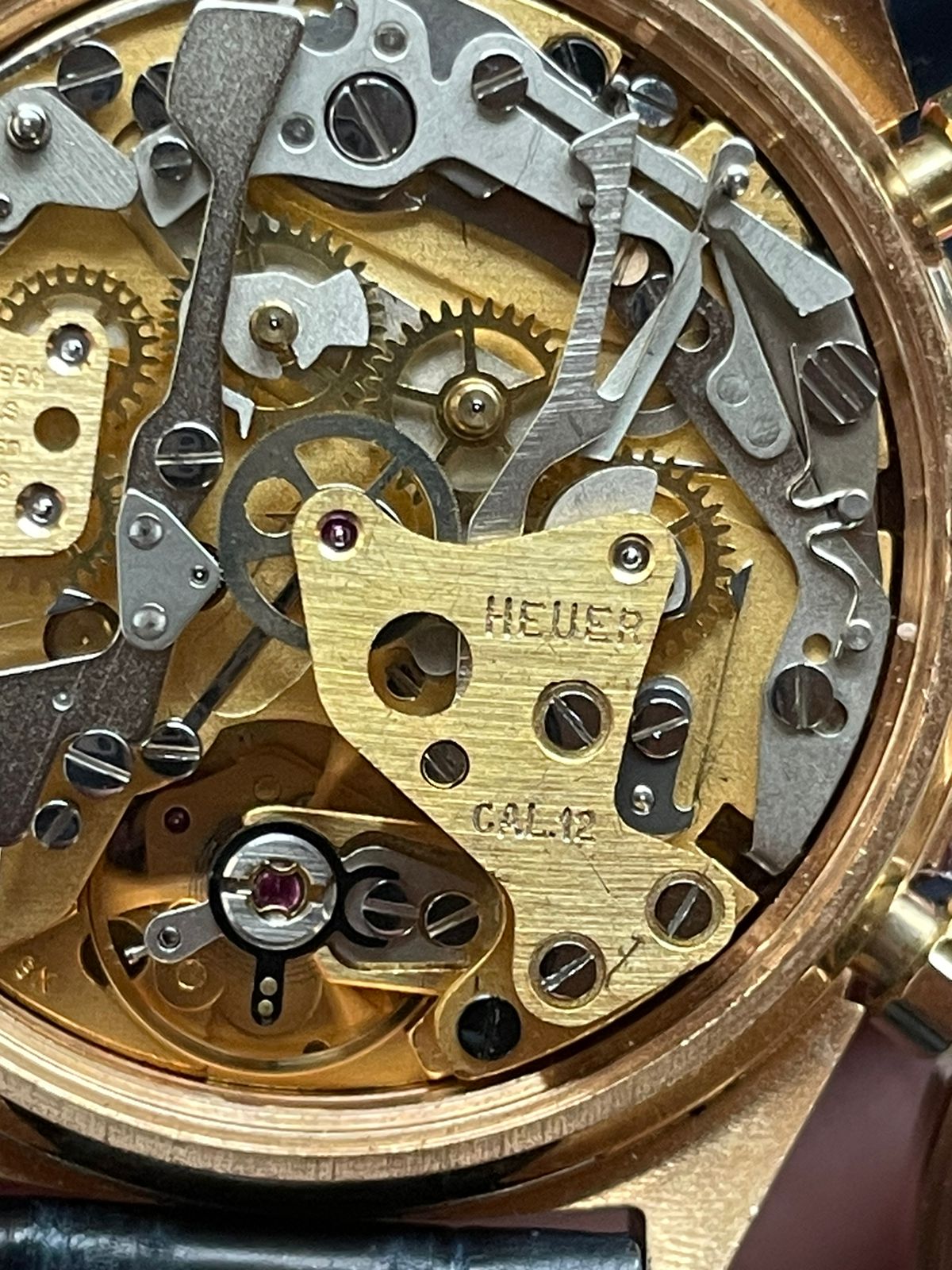 The movement also likely did not come from a Heuer originally, as that bridge plate is far shoddier than any authentically seen - compare to the 'SEVENTEEN JEWELS' etc etc on the other bridge.