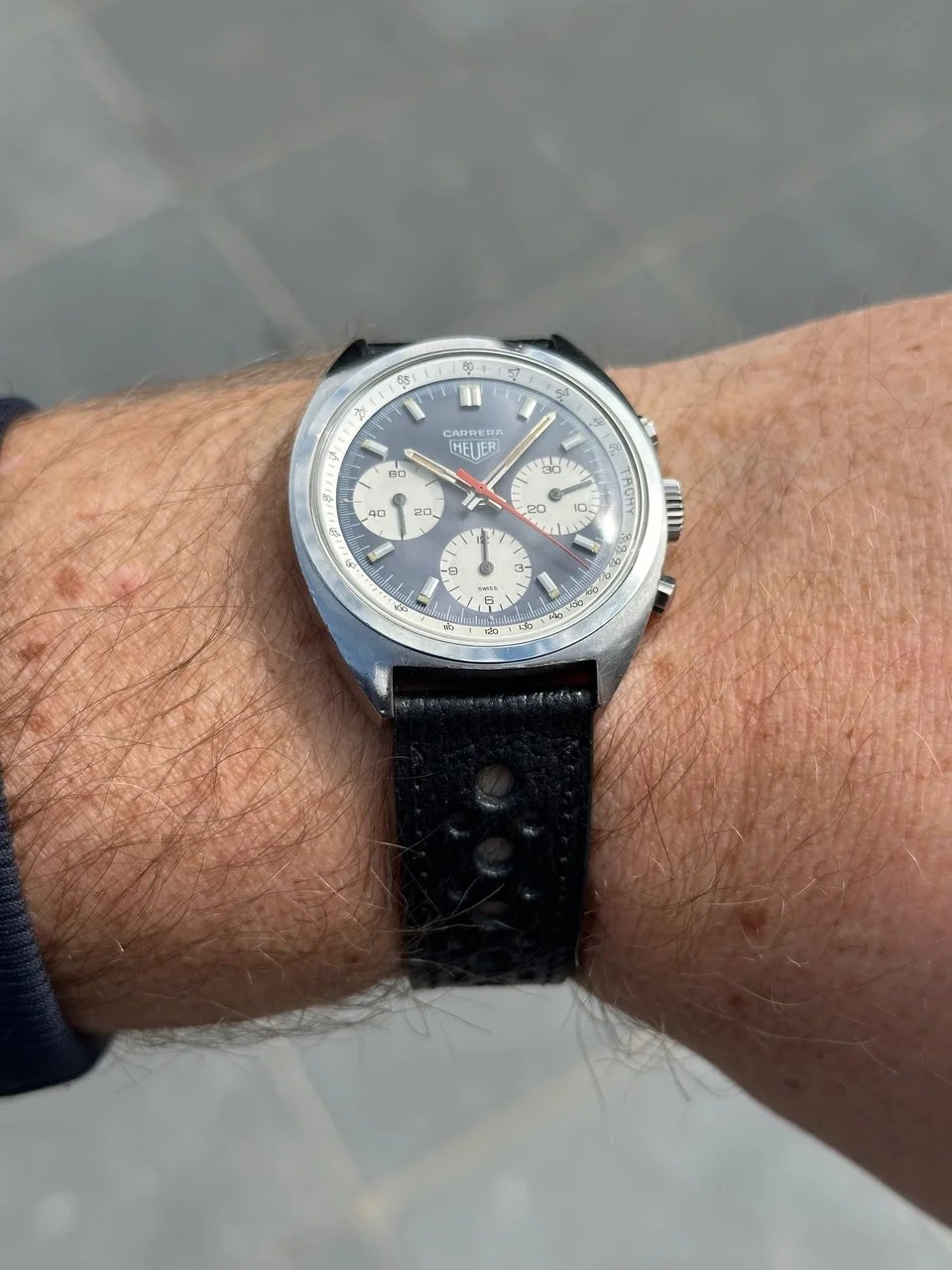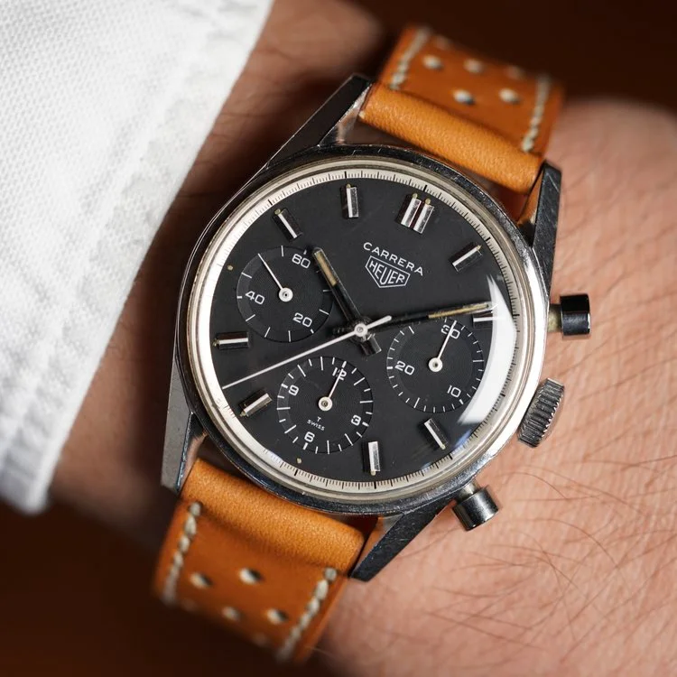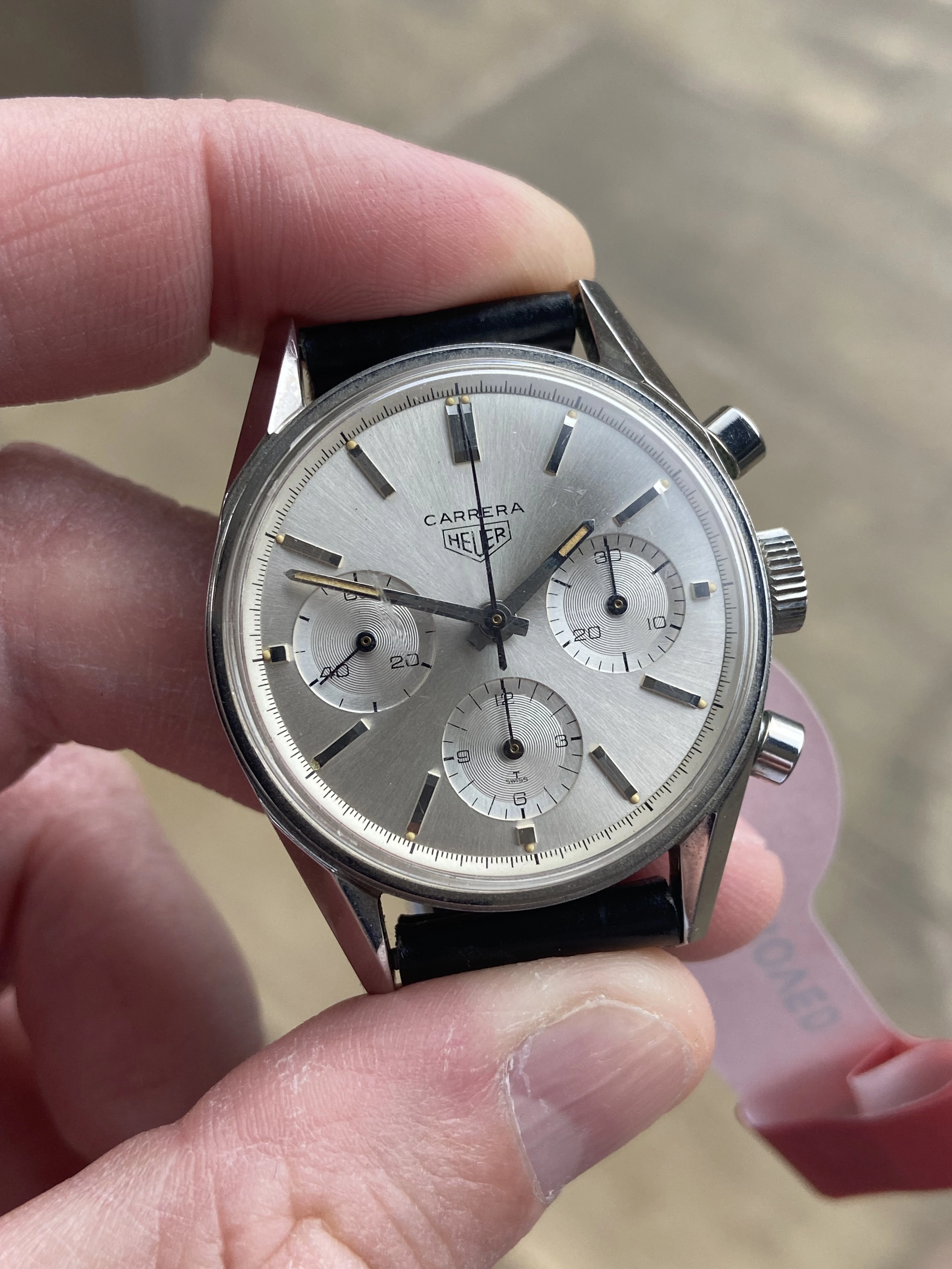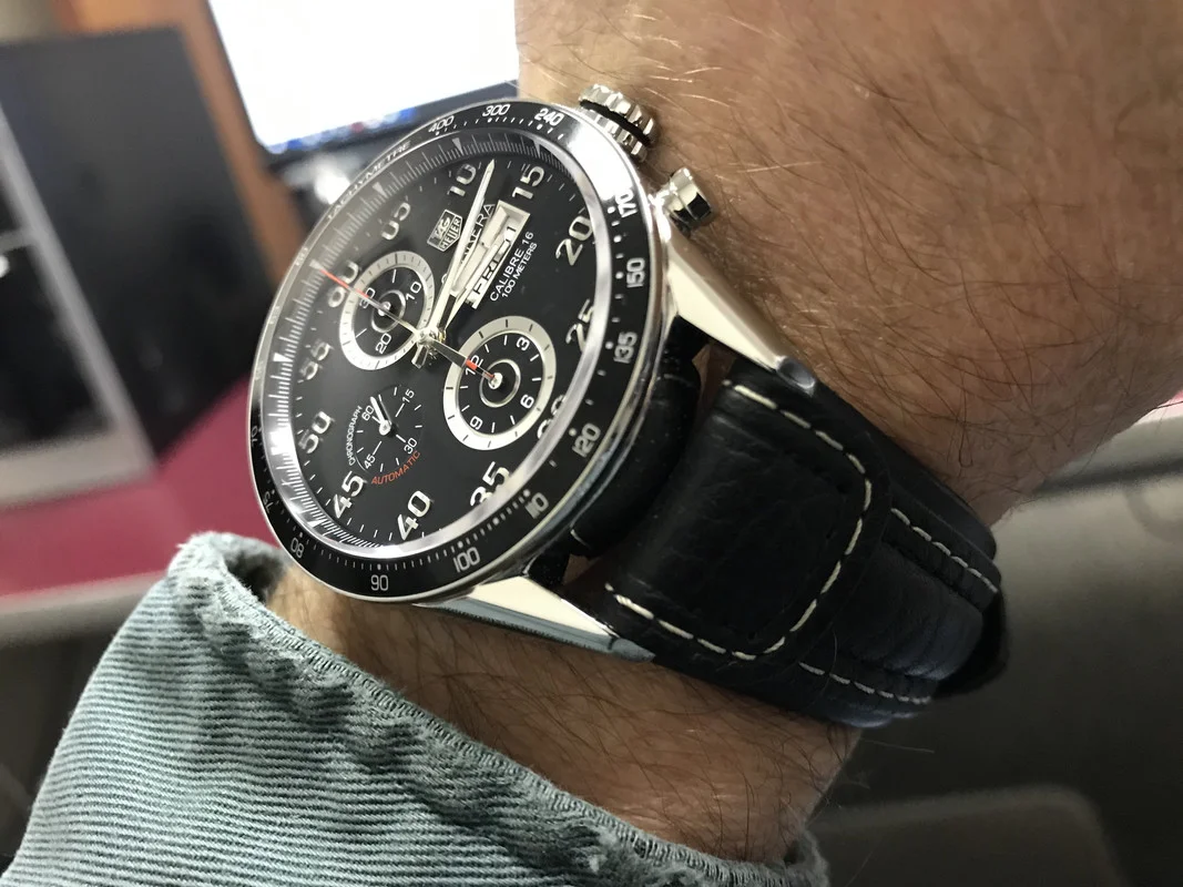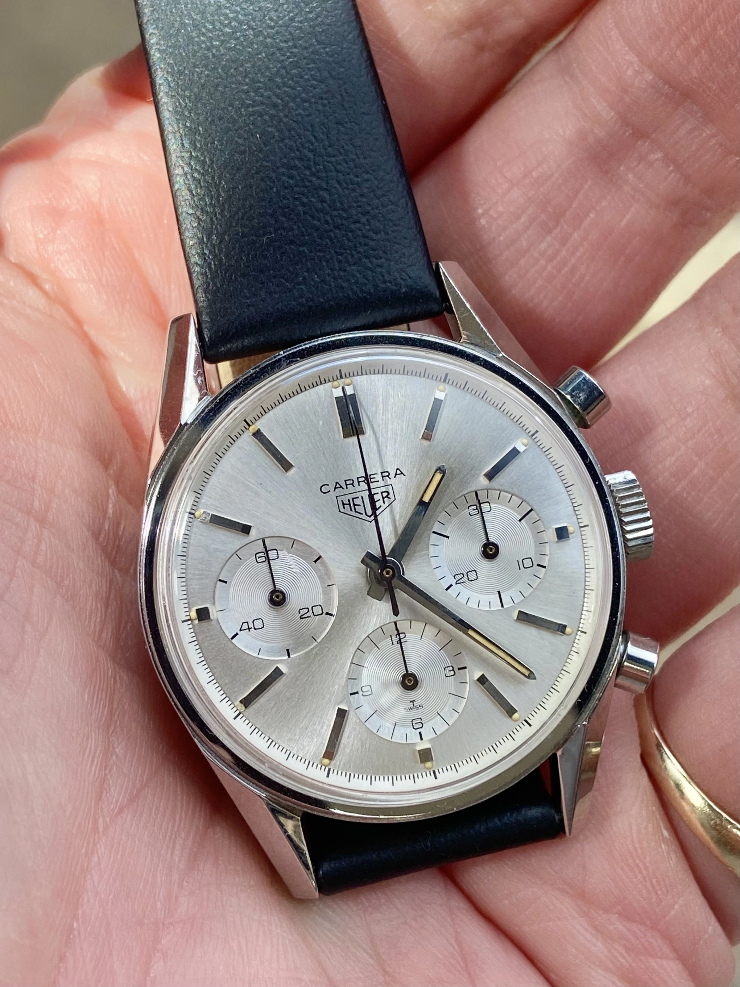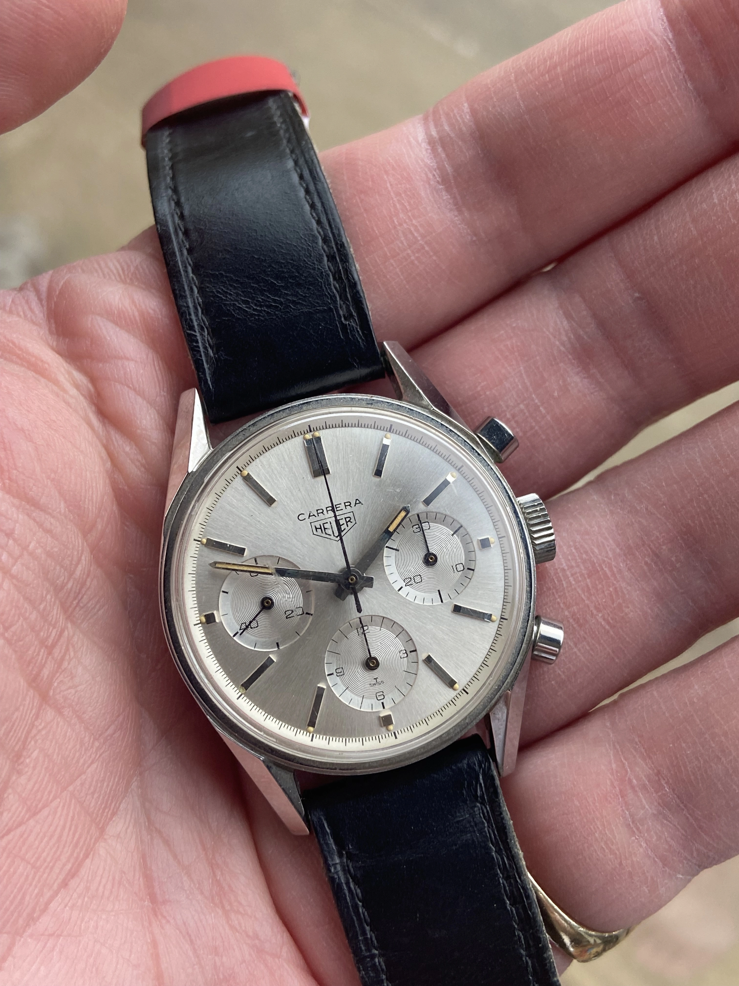 Here’s mine with a modern strap and vintage buckle. As I’ve learnt recently the straps used on early Carreras were devoid of stitching so I tried to find something along those lines to complement it.