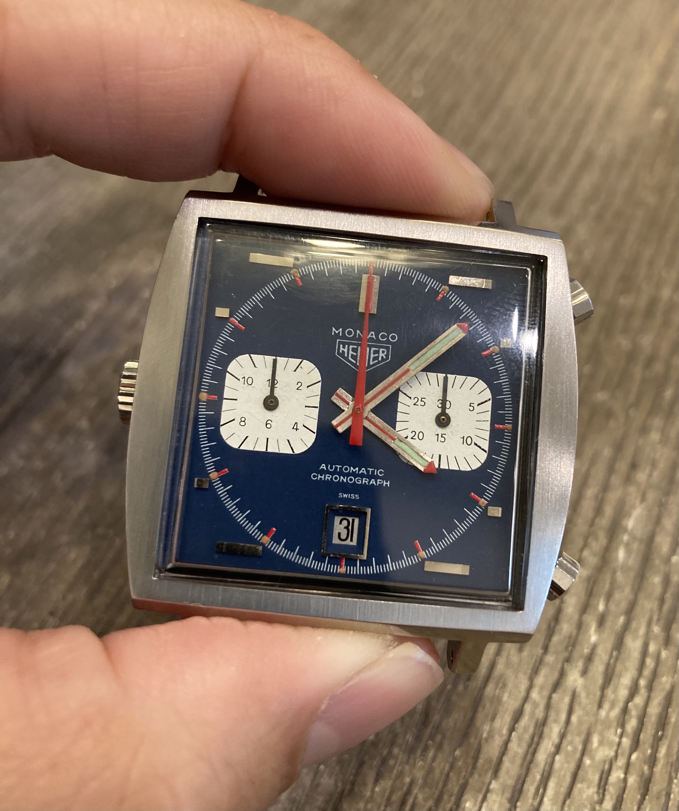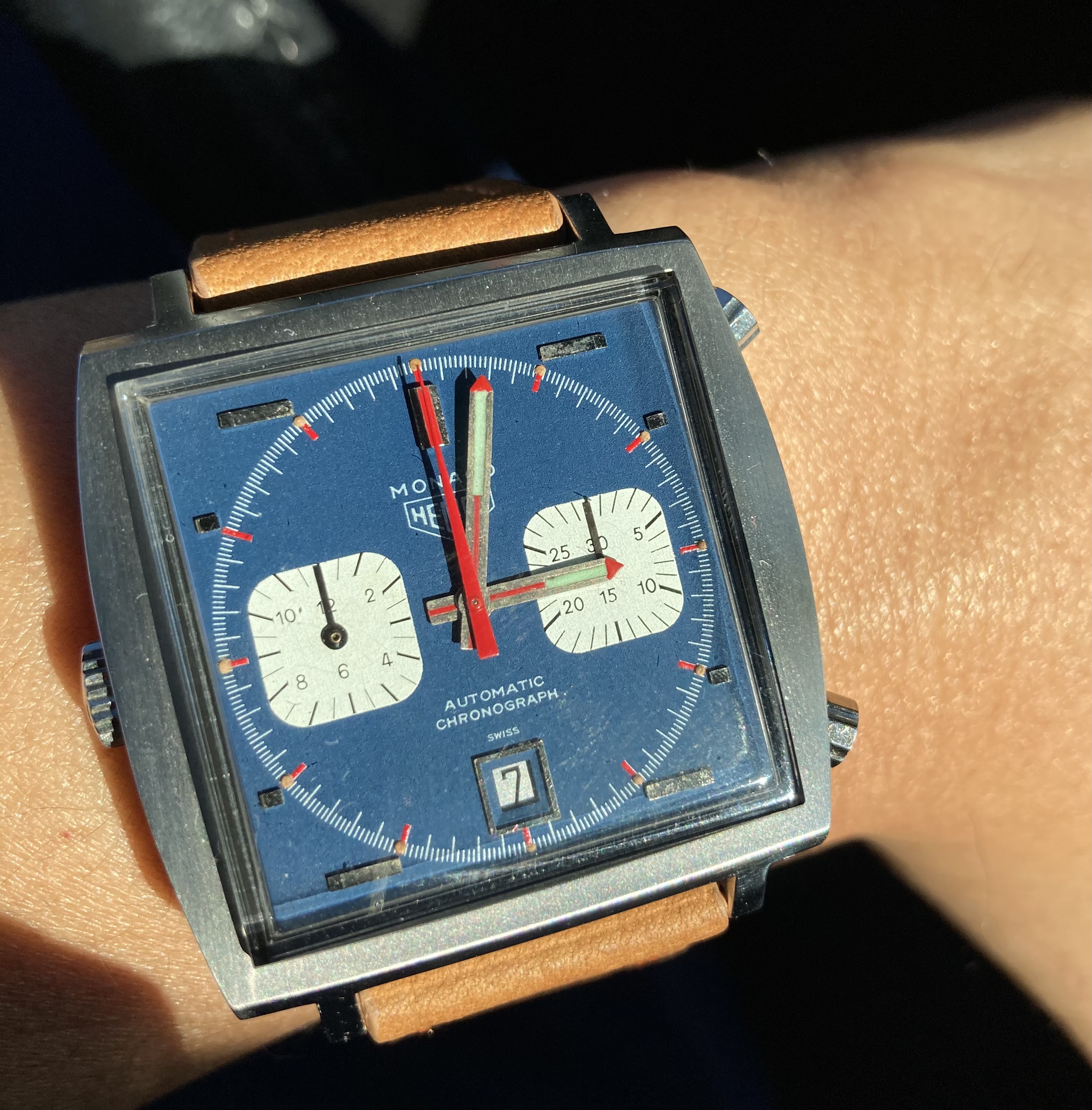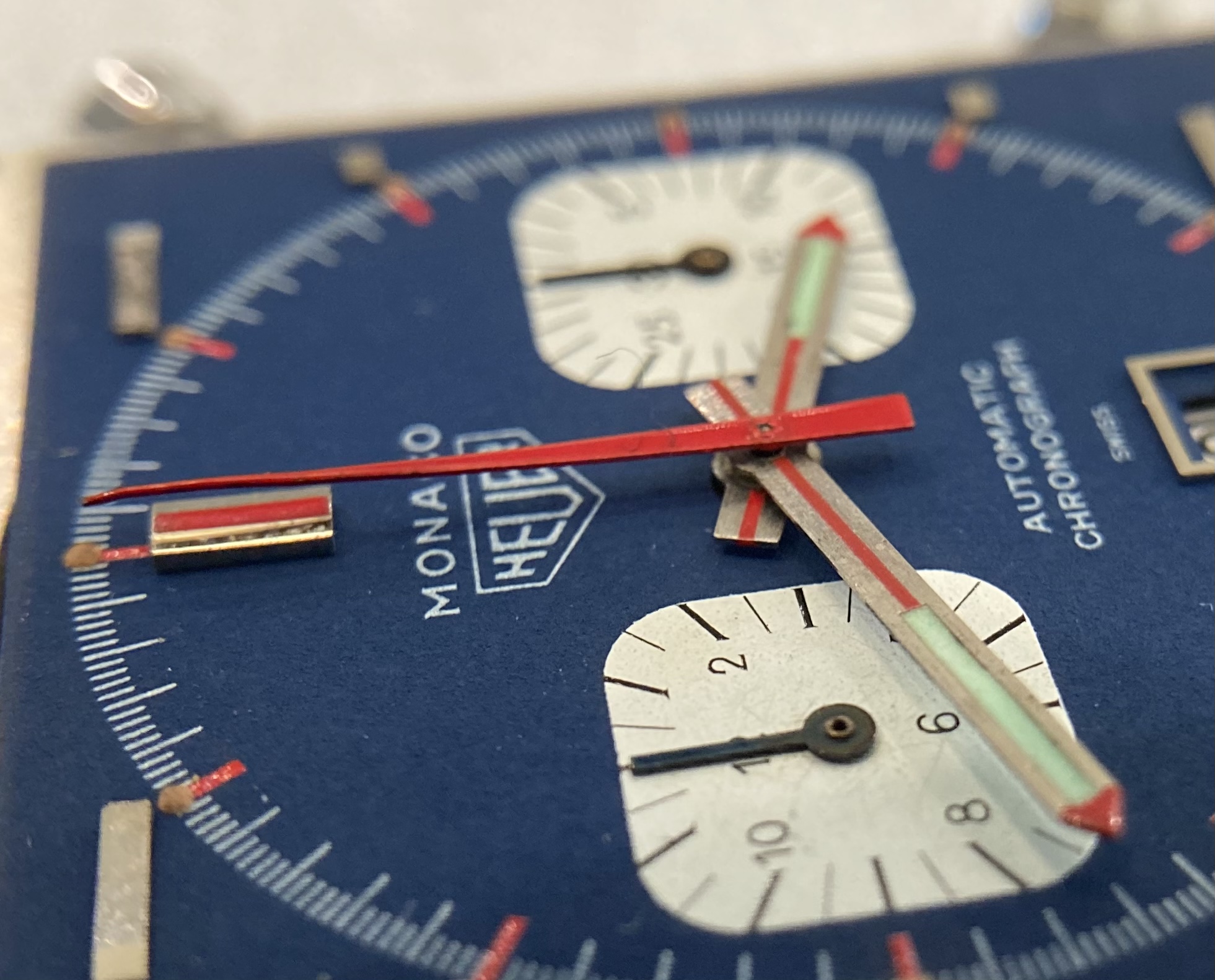 ·Could be a relume, could be service replacements, but some of the earlier Monacos had hand lume that went blue-green so it could be that, though those are usually the straight-end Chronomatic and "Transitional" style hands. Lots of tritium from that era went greenish though so it doesn't raise red flags necessarily.