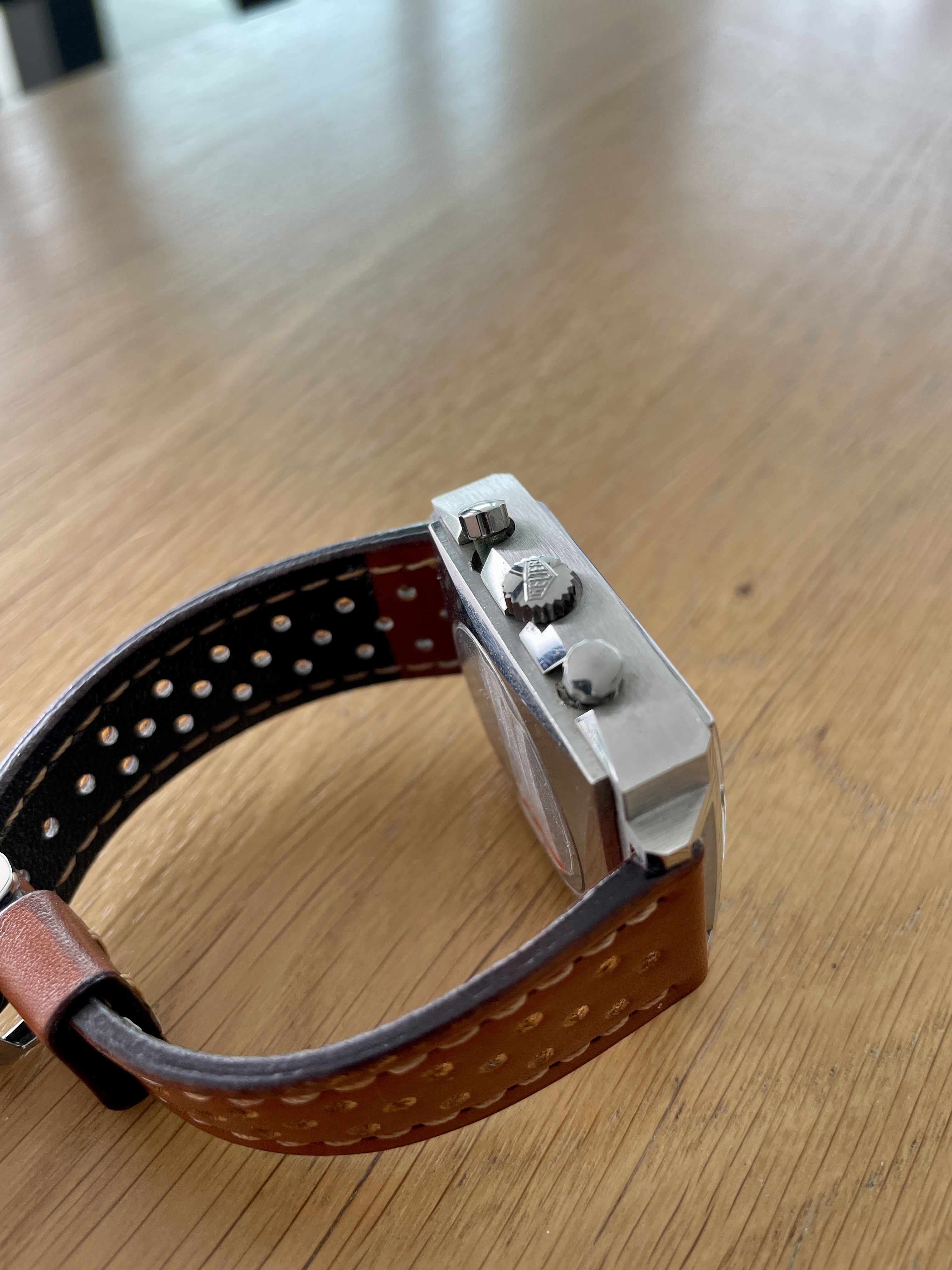 Fitted with a bespoke racing strap and Heuer b buckle.