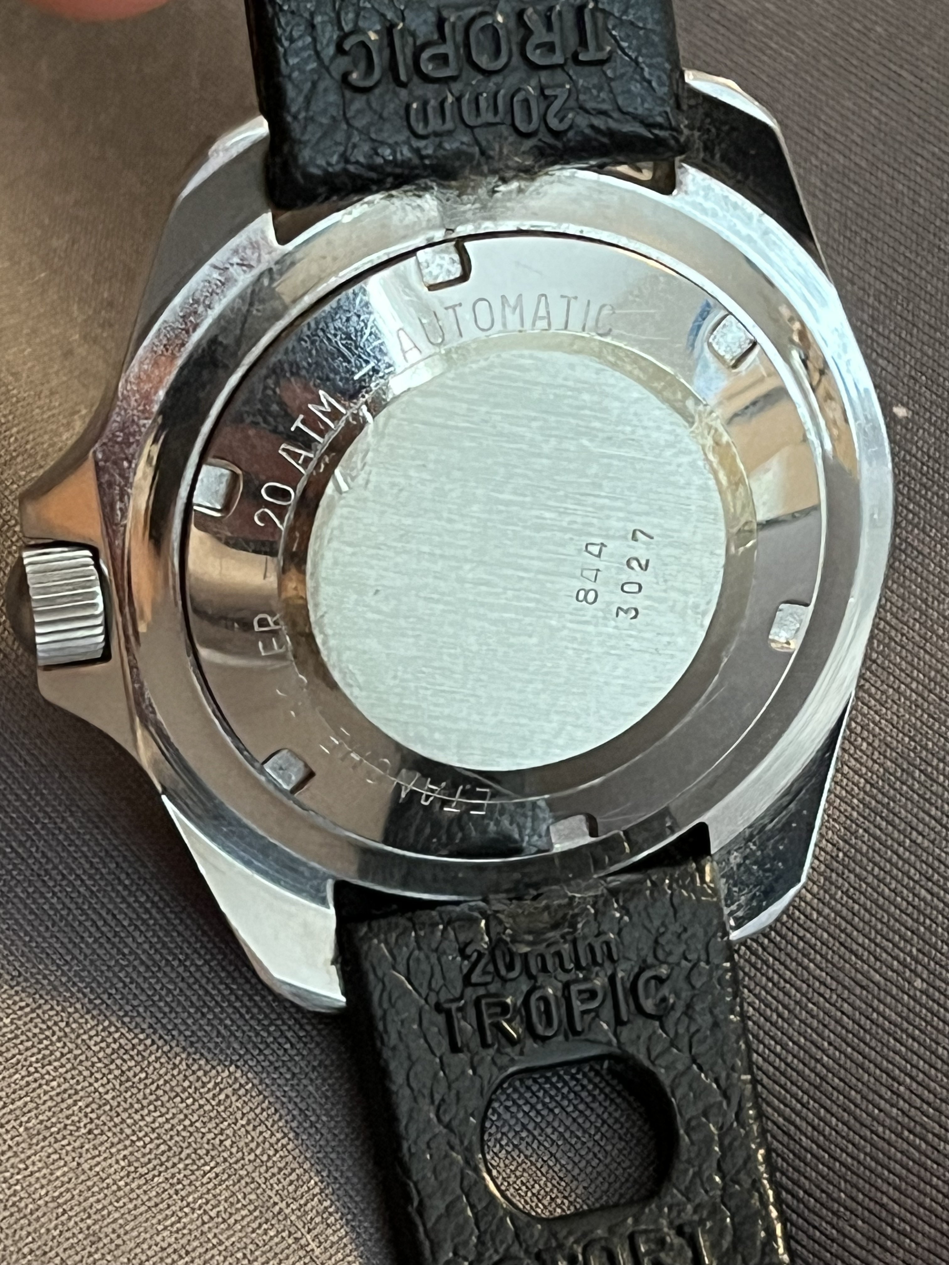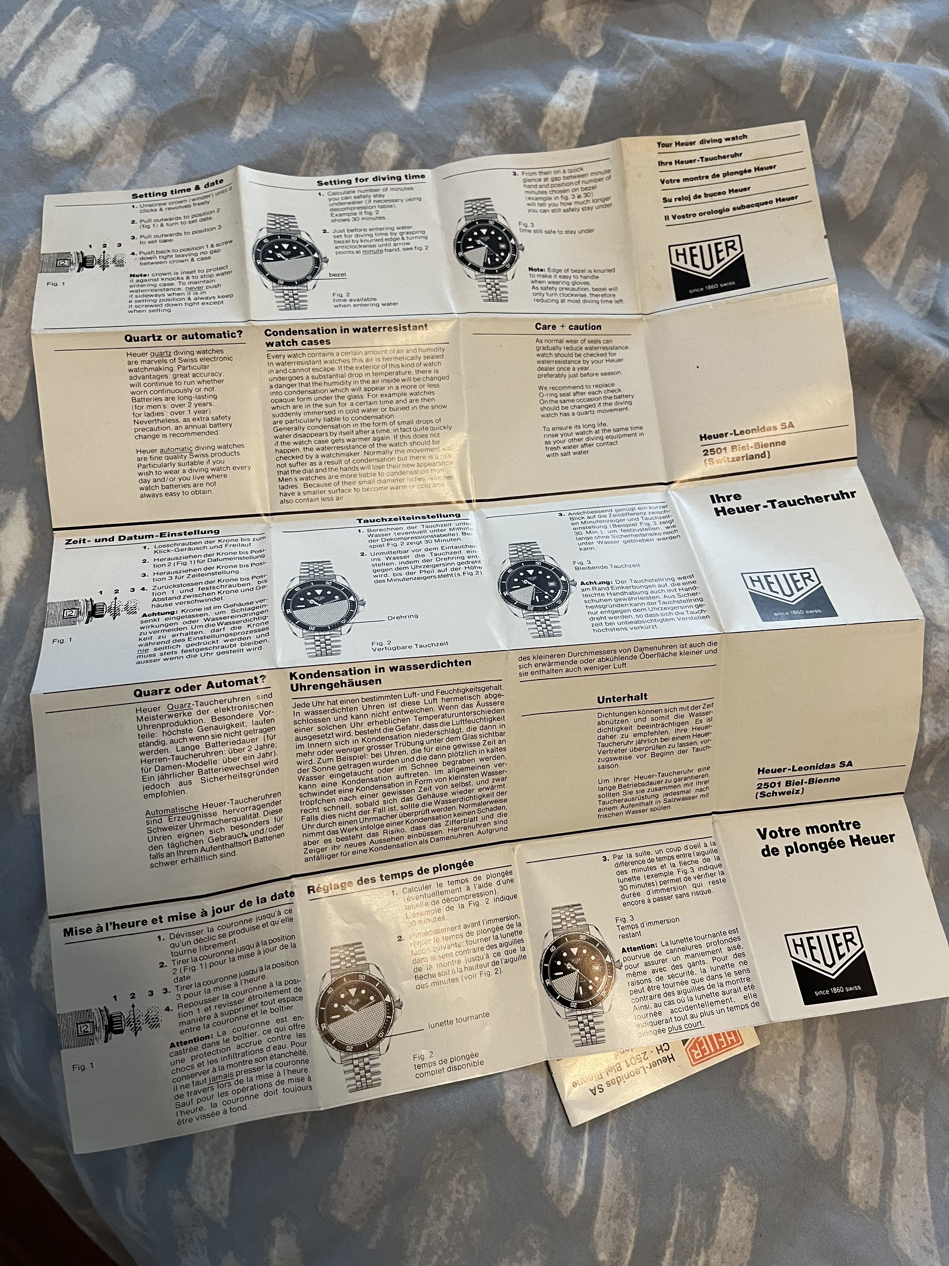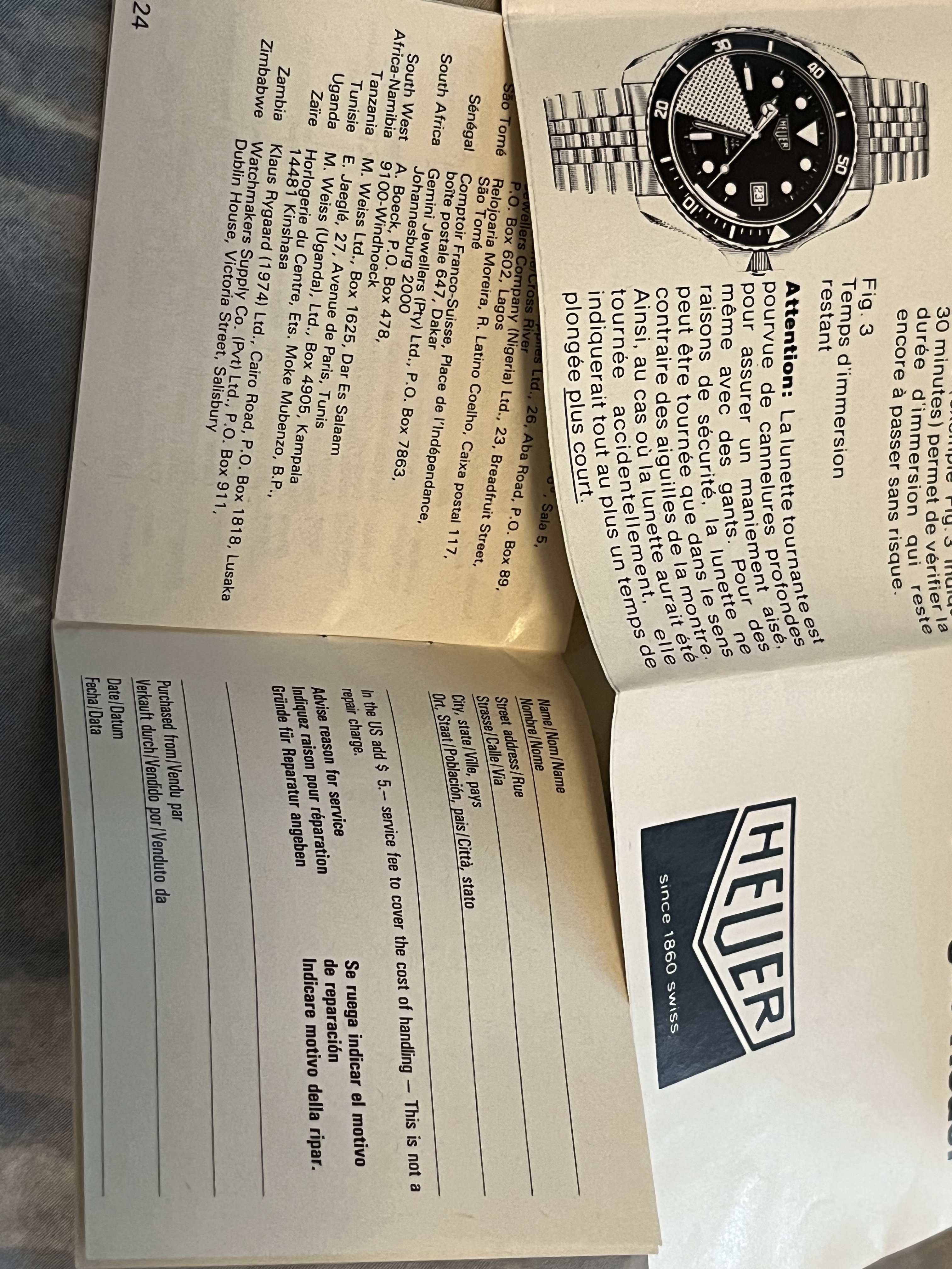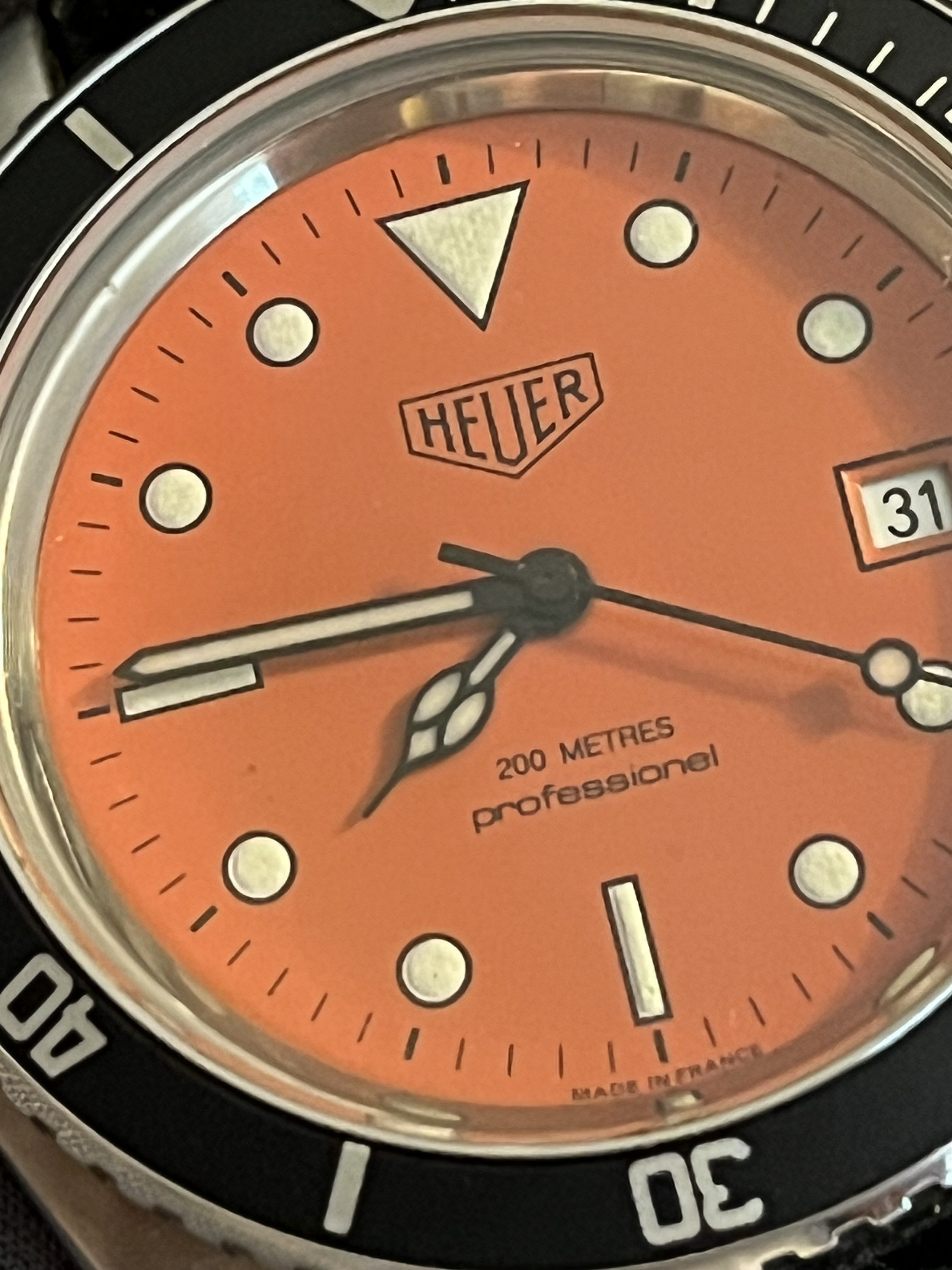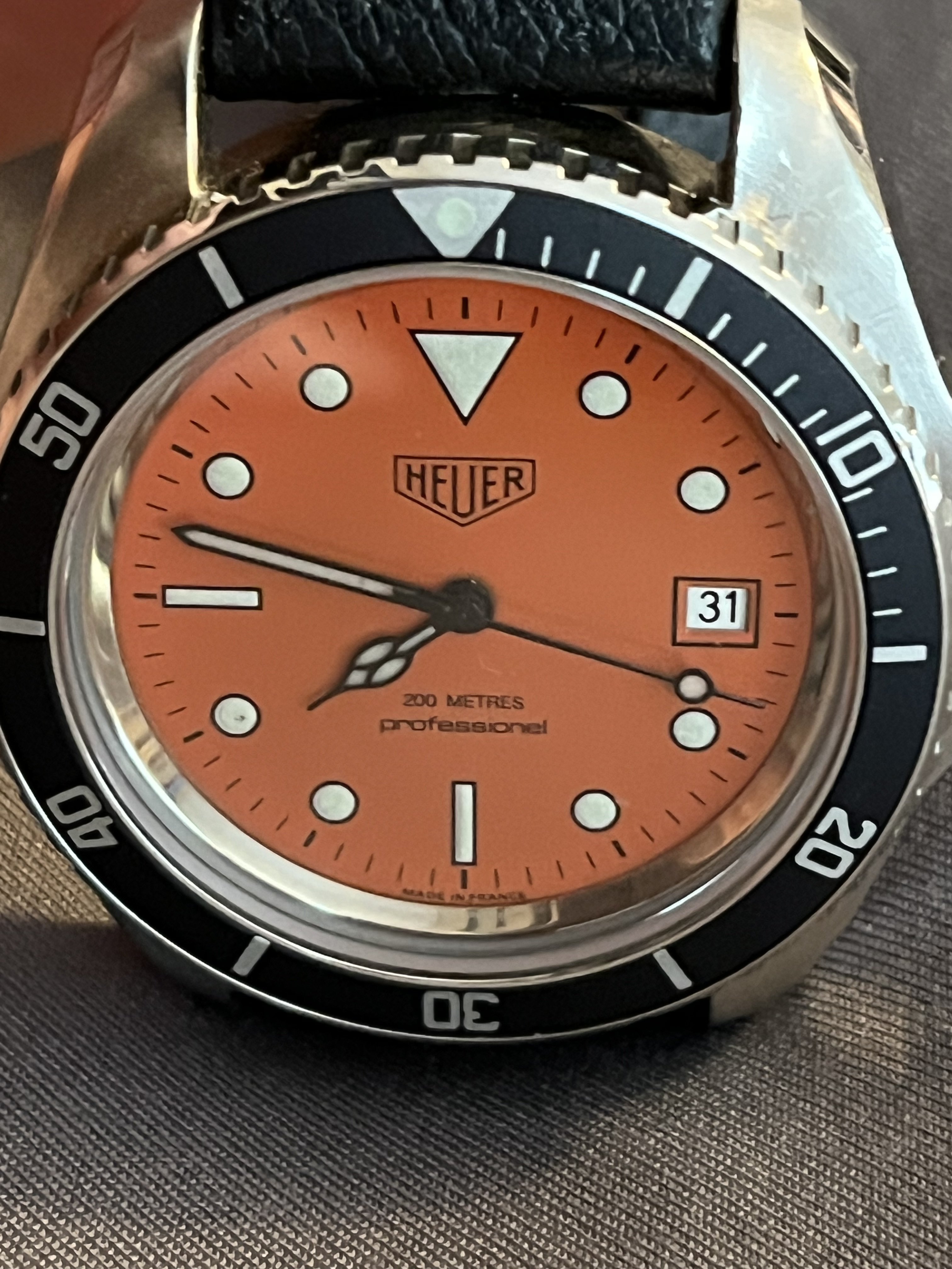 ·Rarely seen as most orange dials are quartz ones. This is an automatic with French made FE 4611A movement. I have the paperwork showing I dropped it off for service in October 2019 but can’t find the receipt showing when I picked it up. A new buyer could always call the watchmaker and provide the invoice number to verify (if so inclined). Includes tropic strap with Heuer buckle and separate bracelet. Also has box but the hinges are broken. Comes with instruction sheet and unsigned (blank) warranty booklet. The dial is in great shape with the proper “made in France” dial. The lume has a yellowish patina. The cathedral hands glow longer than the dial and may have been relumed prior to me getting it.