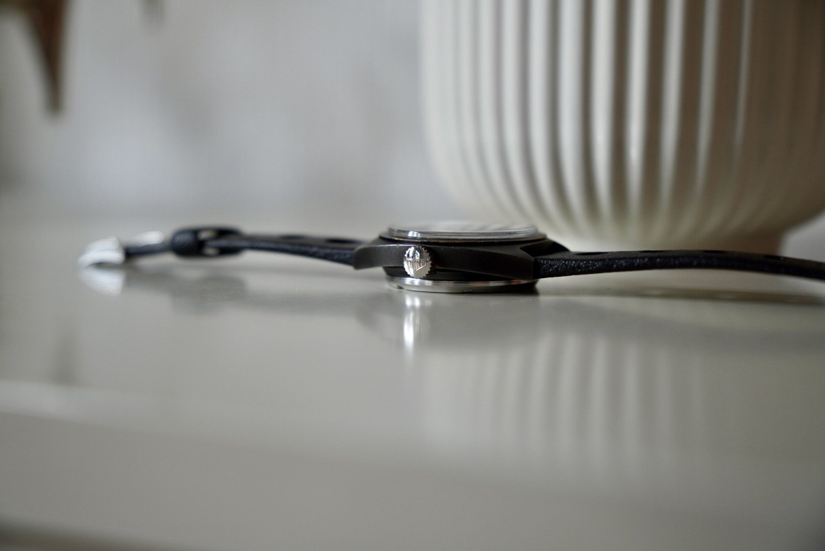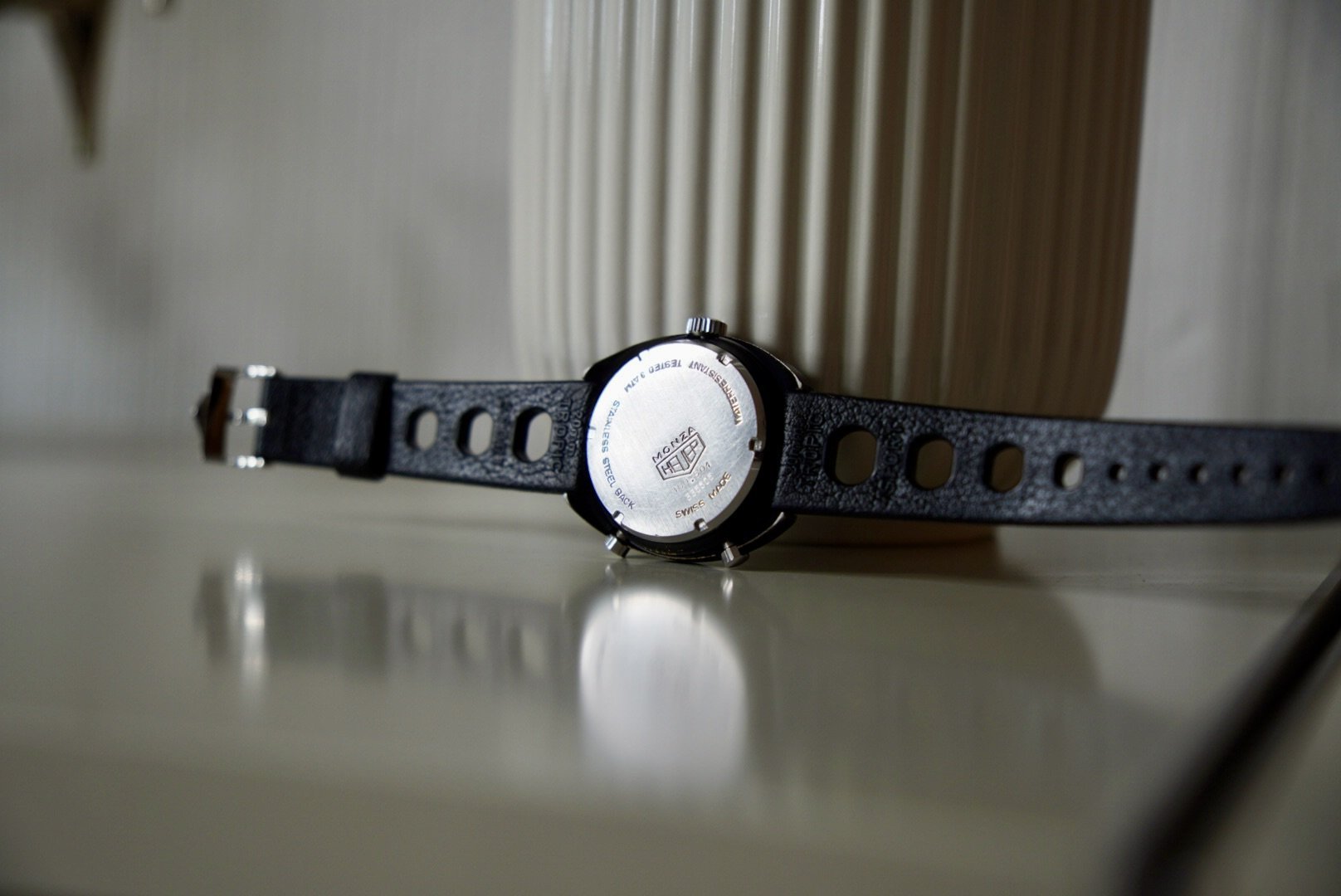 The strap of the watch is a contemporary Vintage Tropic Sport strap with an original Heuer clasp.