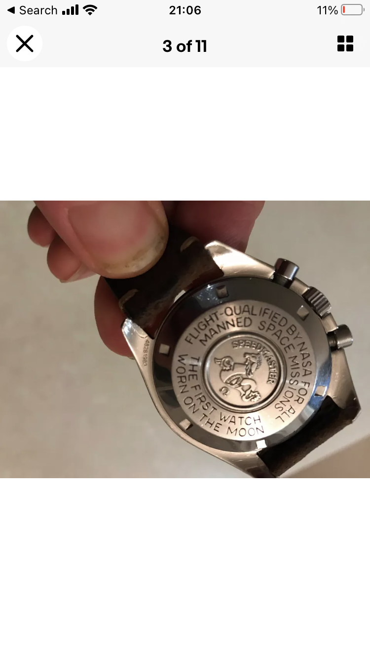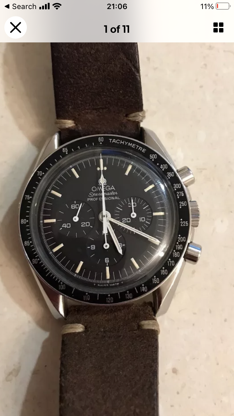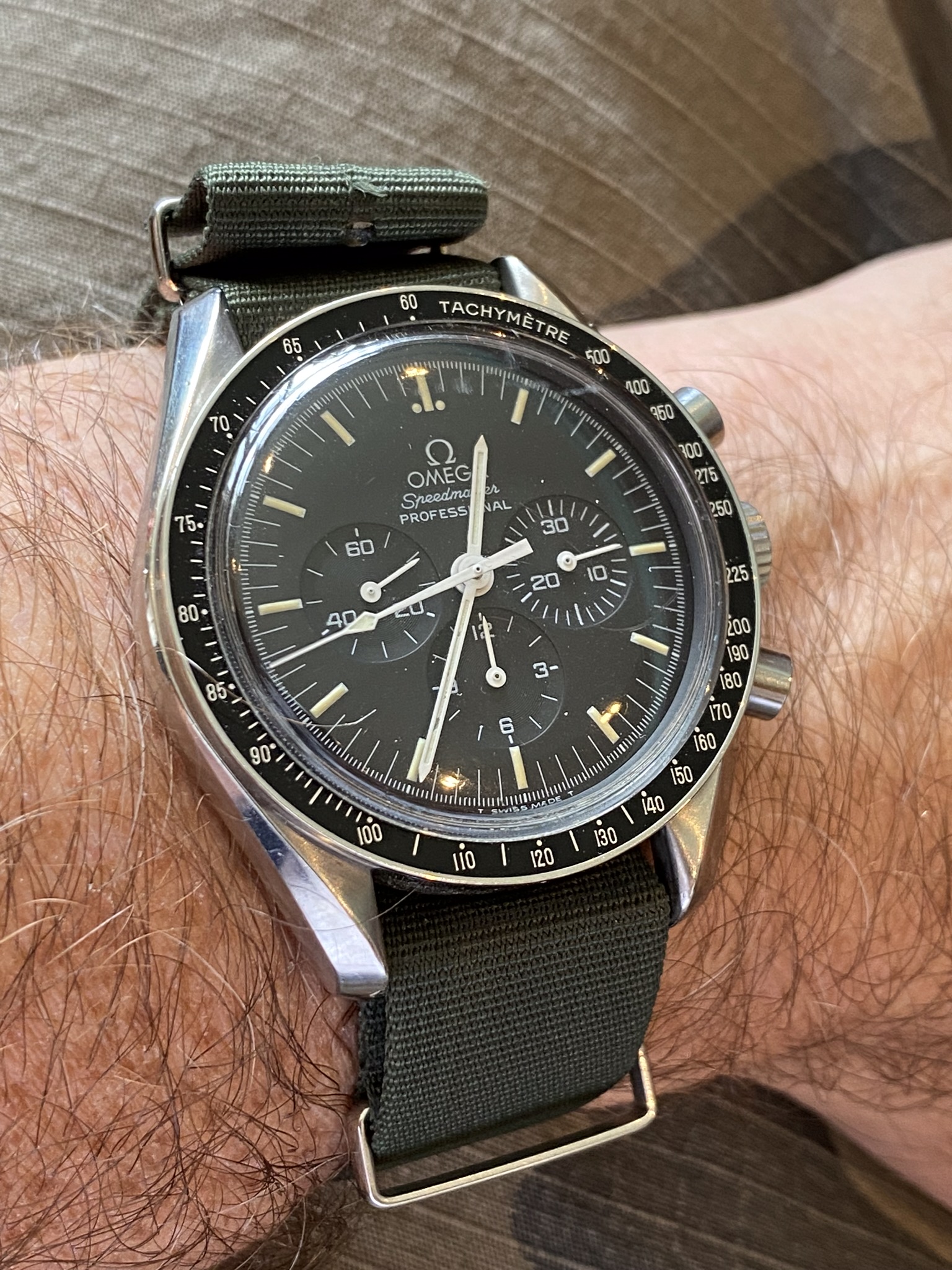 Hi All we have a very nice Speedmaster ,almost 30 years old ,a lovely creamy patina on hour markers , serviced about 8 years ago , no receipt, no box,no papers , comes with aged Italian leather Hodinkee strap . Keeps good time +/- 1min per day