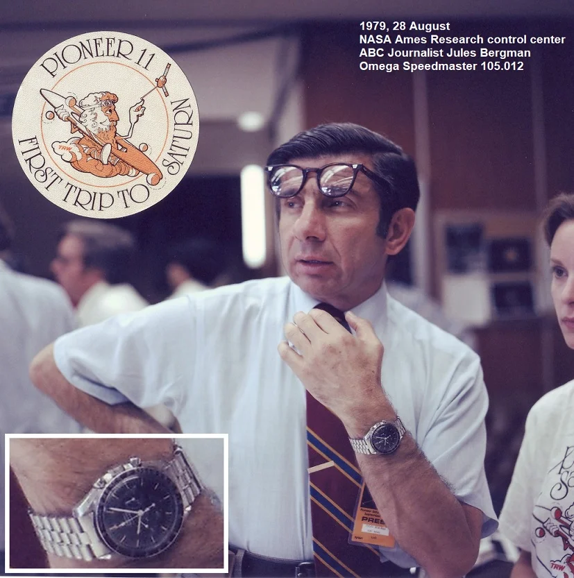 Bergman soon noticed the Omega Speedmaster chronographs on the wrist of astronauts and bought one for himself. This Speedmaster 105.012 can be seen on Bergman's wrist between 1966 and 1986 as he wore it to cover Gemini, Apollo, Skylab, ASTP, the space shuttle program and even a few unmanned spacecraft missions such as Pioneer & Voyager.
