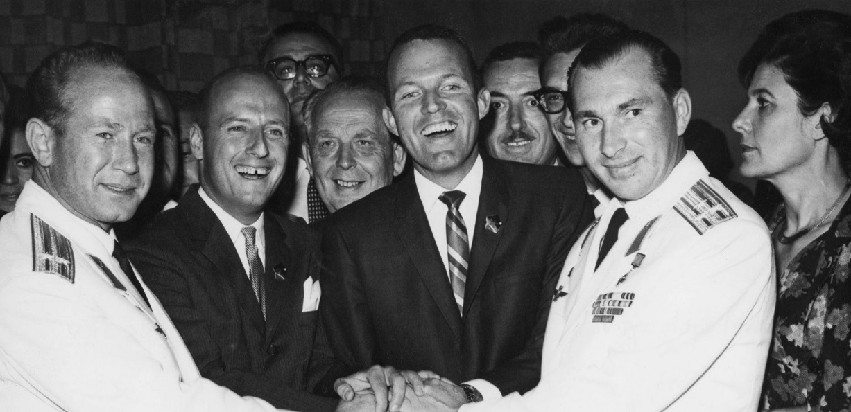 A meeting in Athens - Greece, during which Gordon Cooper gifted an Accutron Astronaut tuning fork wristwatch to Major Pavel Belyayev.