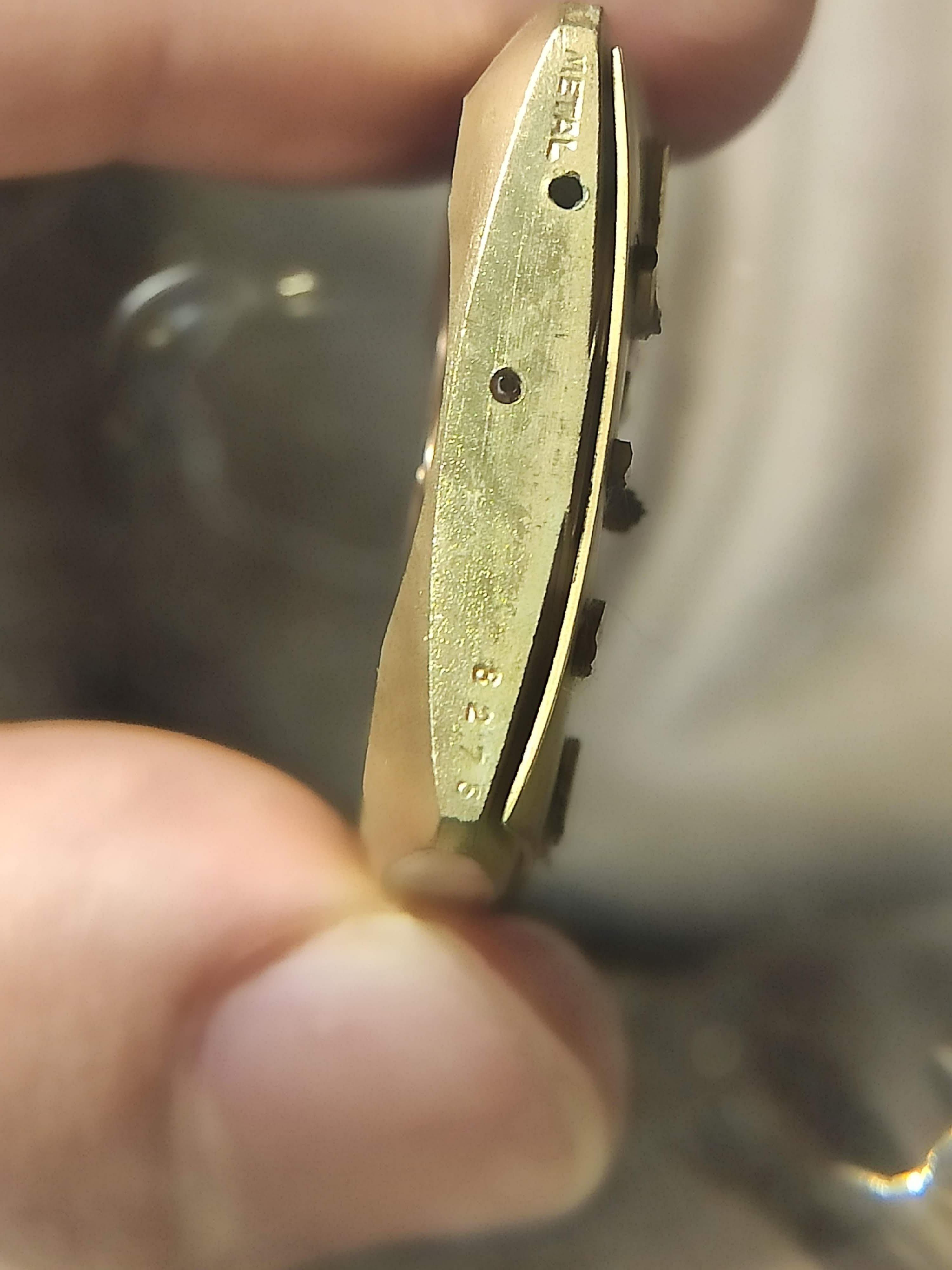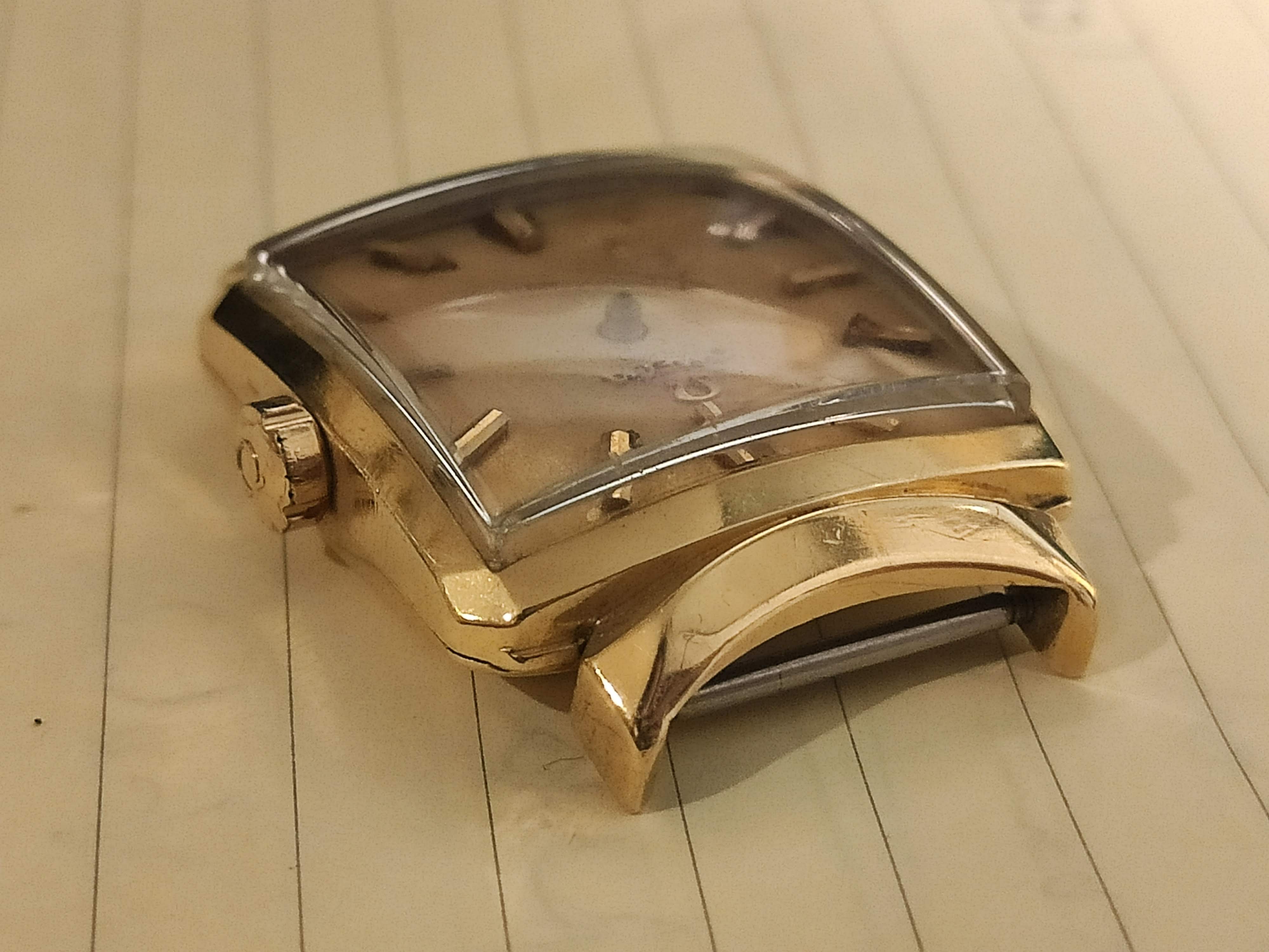 When I first held it, I noticed that the case was in beautiful shape with almost no polishing and still keeping its curves, so is the original signed glass and probably original crown (confirmation would be appreciated). However, the dial was in terrible condition with hands and some indexes removed and some "glued":