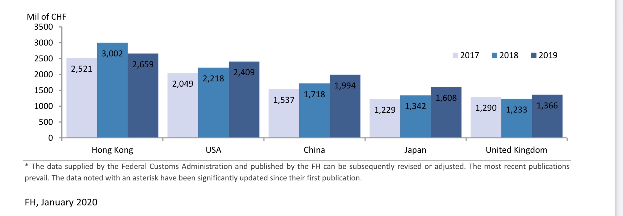 • Finally, the 2019 press release contains the following curious and unexplained note: “The growth in value was almost exclusively due to mechanical, precious metal or bimetal watches priced at over 3,000 francs (export price). Other price segments, quartz watches and steel products, in particular, declined in 2019.”