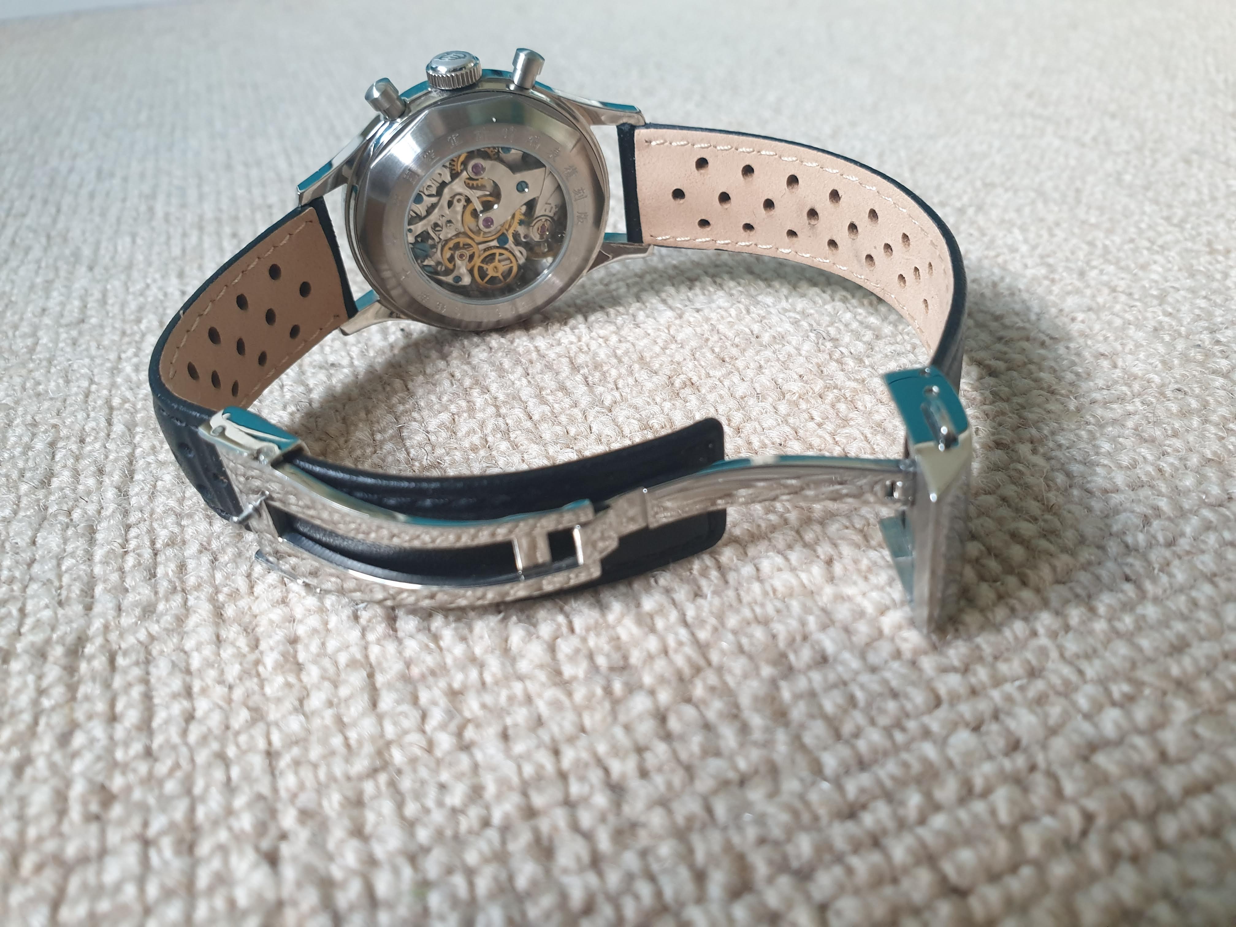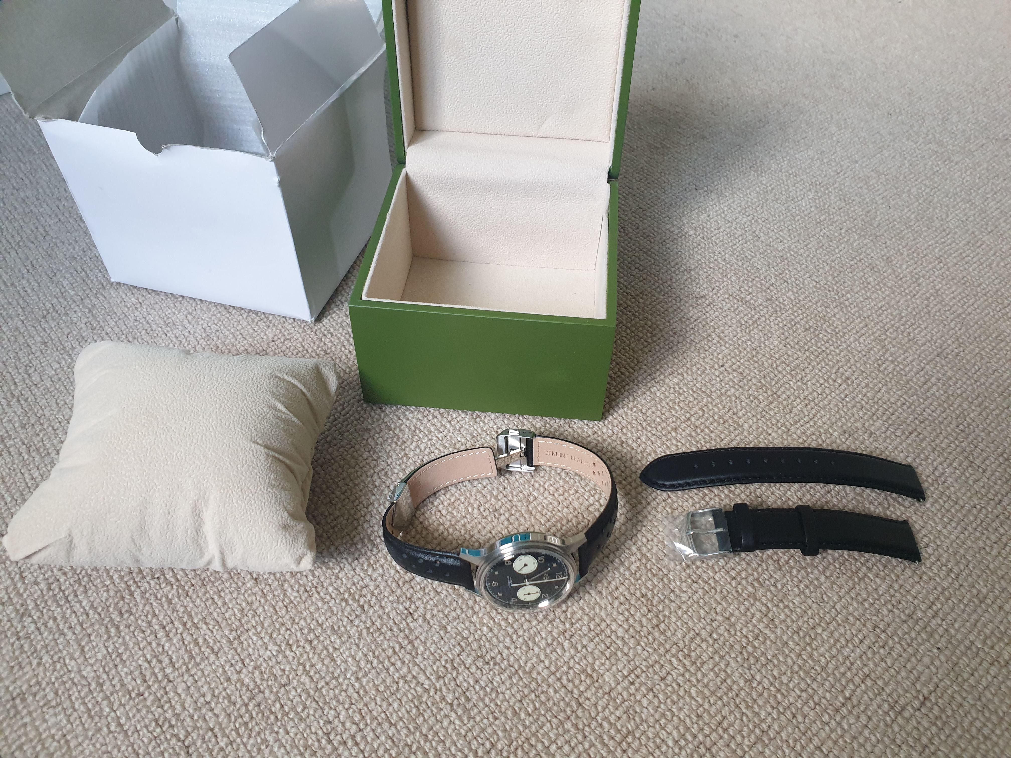 Comes with original box and original black strap (unworn), plus I'm also including the 18mm Heuer-style black rally strap with stainless steel deployant clasp shown in the pictures (worth about £60 I think).