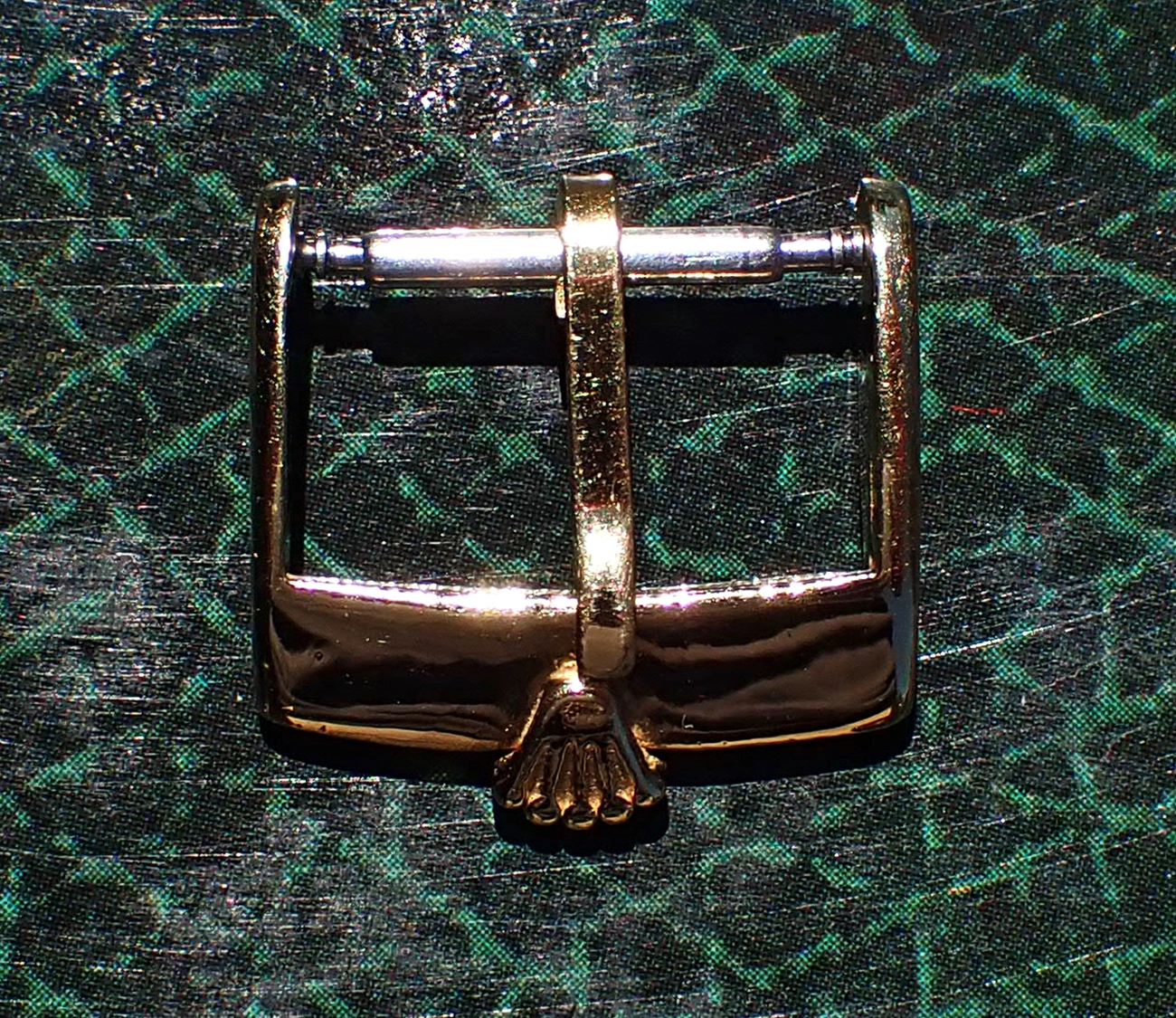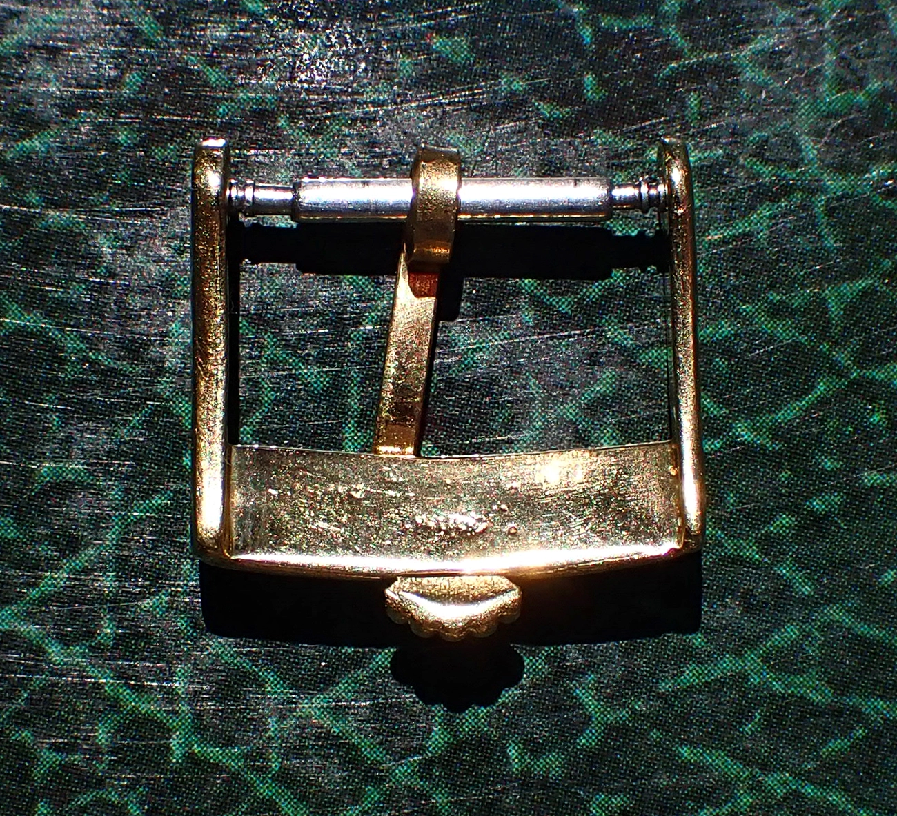 This buckle is in Very Good overall vintage condition, with some signs of wear and age but no major defects. The nomenclature & hallmarks on the underside are very worn, however, and not particularly legible even with a loupe, though the ghost of “SWISS” can still be discerned.