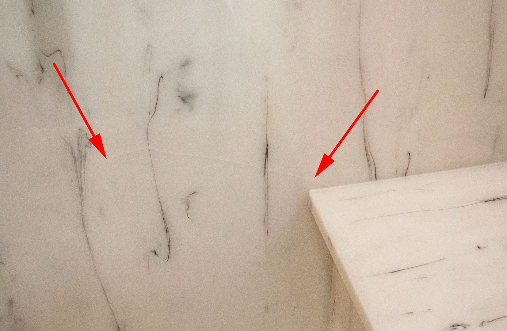 A crack coming from the corner of the bench, that is about 18 inches long. We contacted the company that did the shower stall, and that didn't go well - they tried to blame it on a steam leak. I said "Come on out, we can open up the wall from behind again, turn on the steamer, and we'll quickly see if there's a leak." They declined that offer, and at that point we got our general contractor involved again, because the company didn't want to deal with us directly (they technically sold this to the contractor, not us). Over several months of back and forth, the company that did the shower agreed to replace the back wall, but the cost of doing just that was more than we had paid for the entire shower stall back when this was done. We asked if they could do anything for us on price, since this is now the second issue we had with this, and they replied that they had already removed their profits from the price, and it was the best they could do...🤦