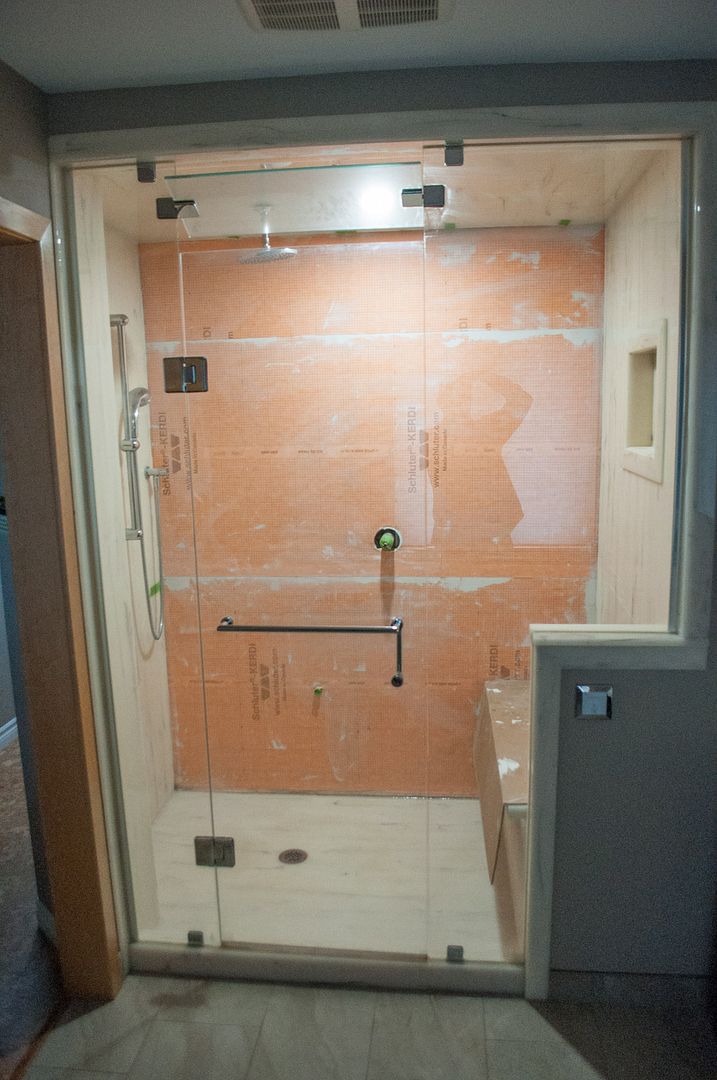 So we had our general contractor come in and carefully cut out the back wall - that back wall was installed first, and everything overlapped it, so that was tricky to do without damaging the other walls. He then used cement board, with Kerdi waterproofing on top.