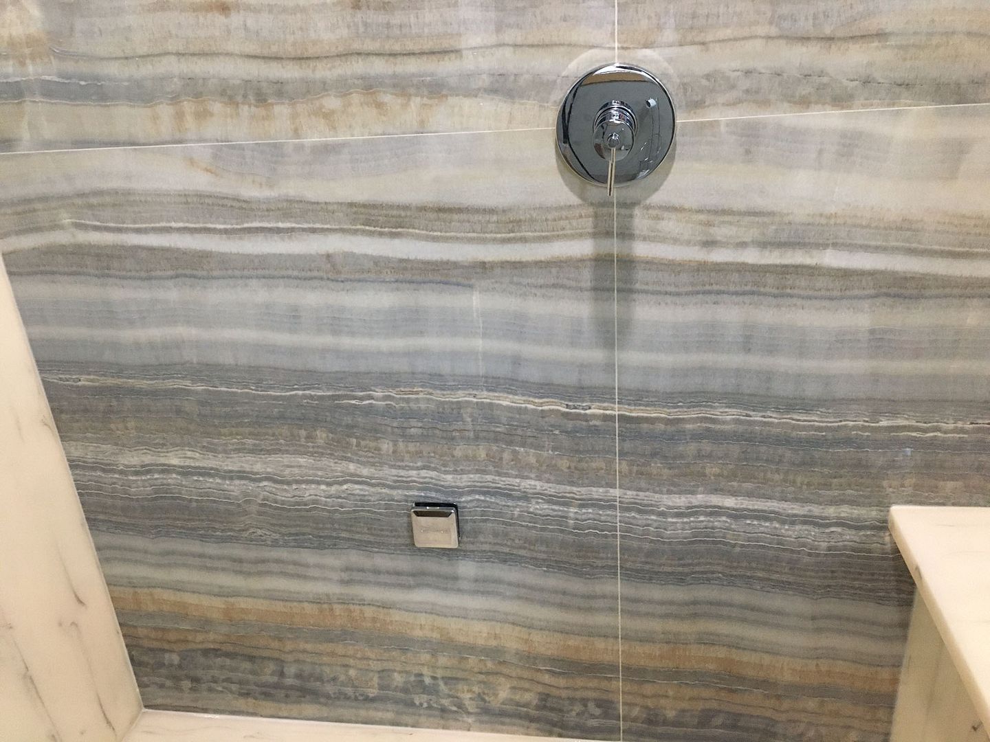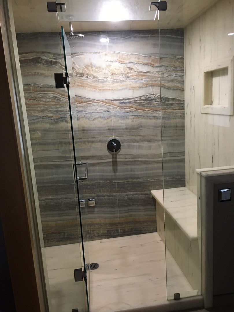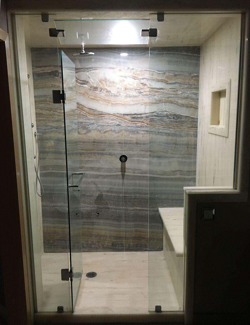 We didn't want to tile the shower with ceramic tiles, because we didn't want to deal with grout, so we had friends who had used a local company to install some sort of resin based shower material that can be cast in large sheets, and they were very happy with it. That's what you see in the photo above, and we really liked the look - they called it Onyx, but it's a mildly translucent material with black streaks in it. But not long after the installation, we had an issue close to the steam vent (small square vent on the back wall) where the wall was bulging out from the heat. We had our general contractor and the people who did the shower look at it, and they came up with a repair that involved going through the back of the wall, and pushing the bulge back in, and adhering it to some plywood. This "fixed" the issue, at least mostly, but in hindsight, we should had then rip it all out and start again...
