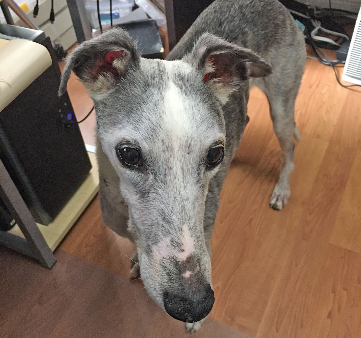 His snout was almost completely white a month ago...now dark hair growing back in...