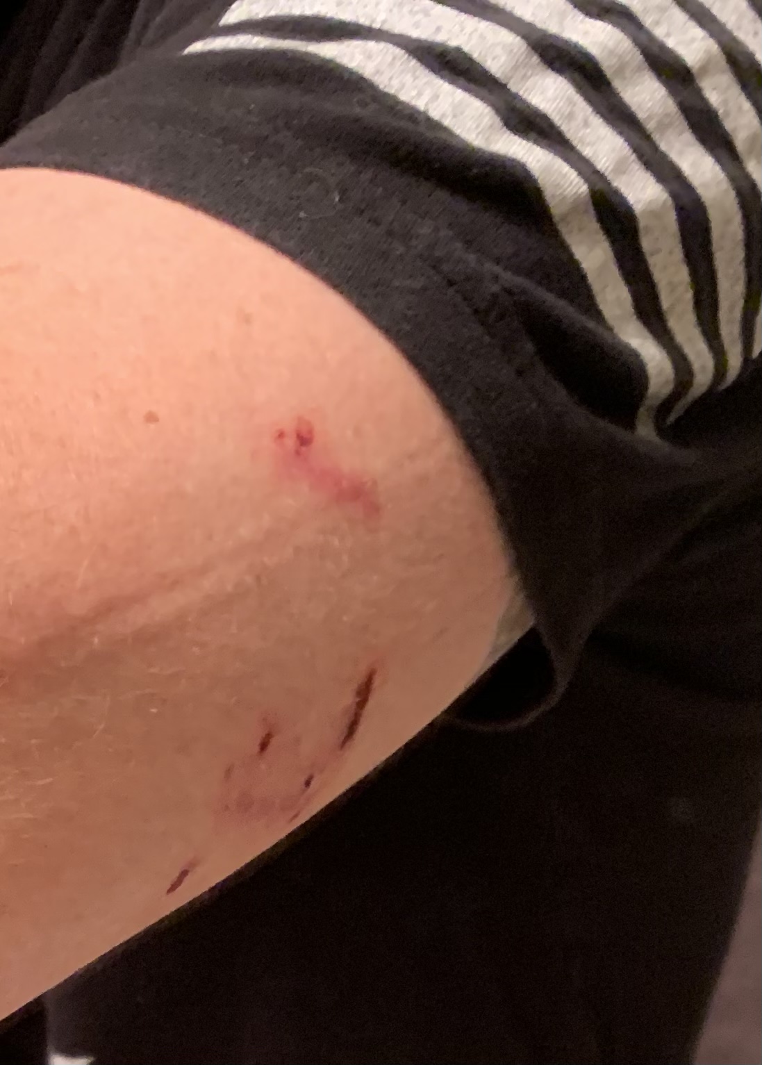 When TJ is fighting he has the tendency to go psycho. TJ decided he needed to bite something. He figured my arm was a good as Sammy.