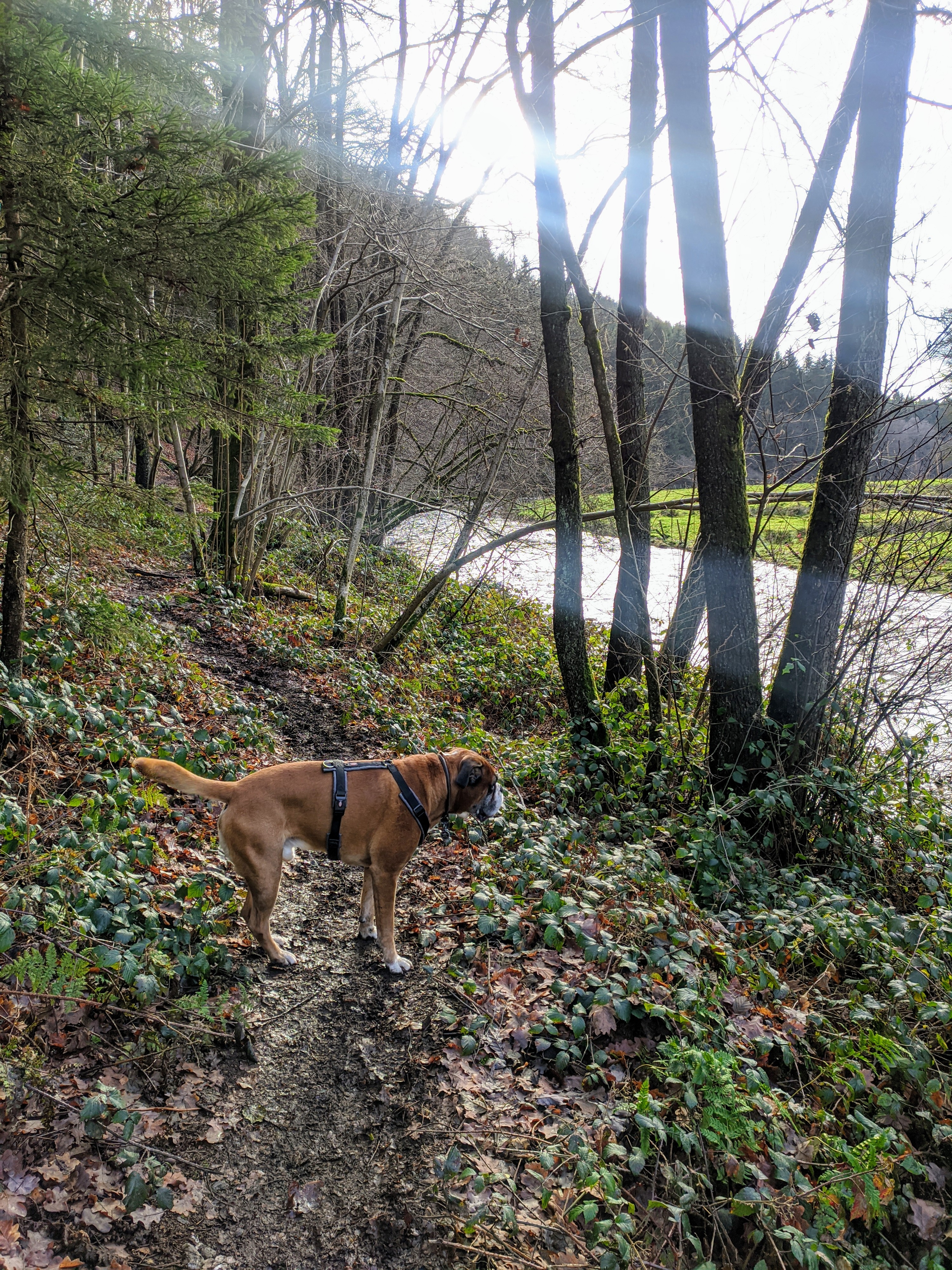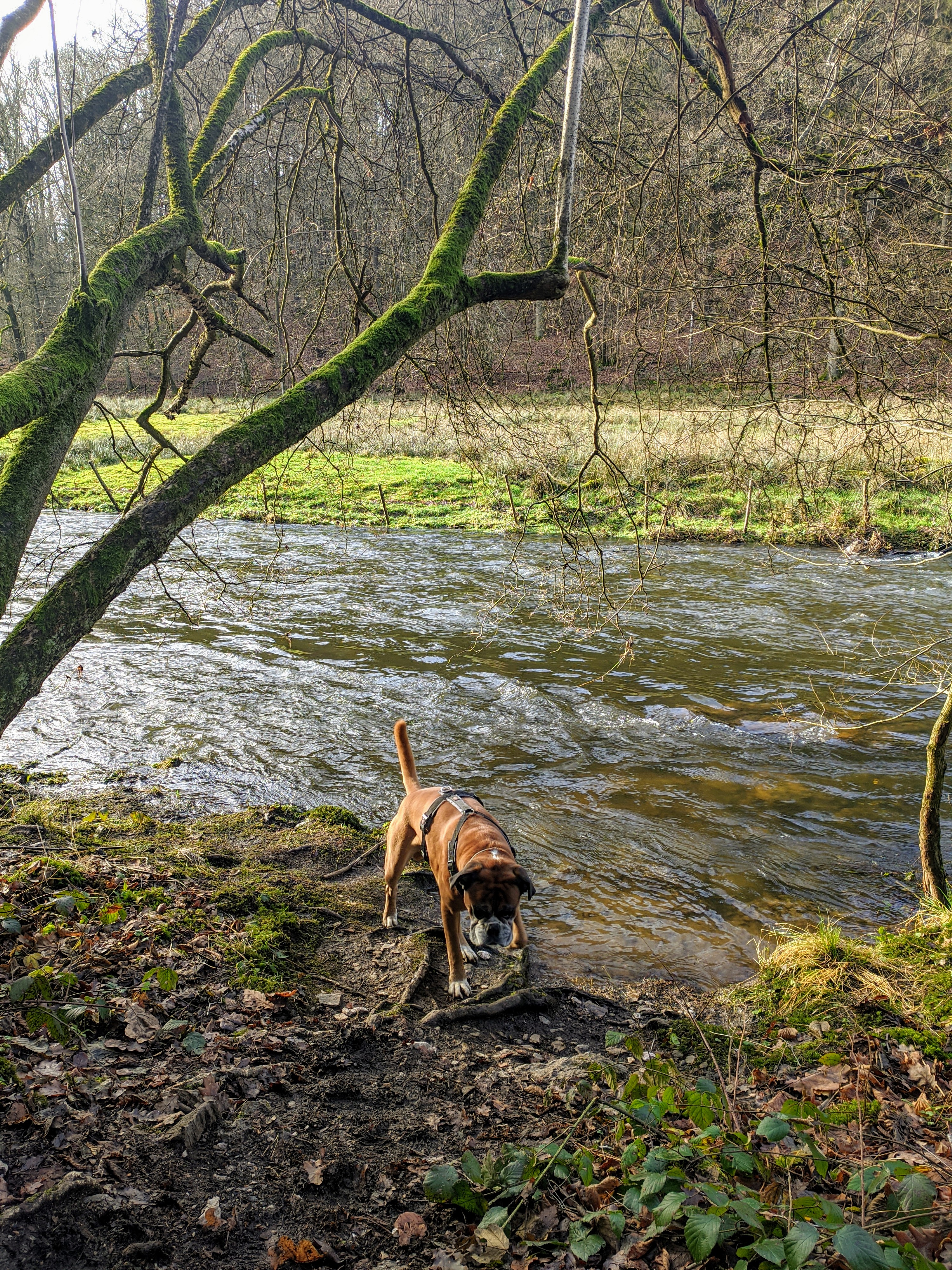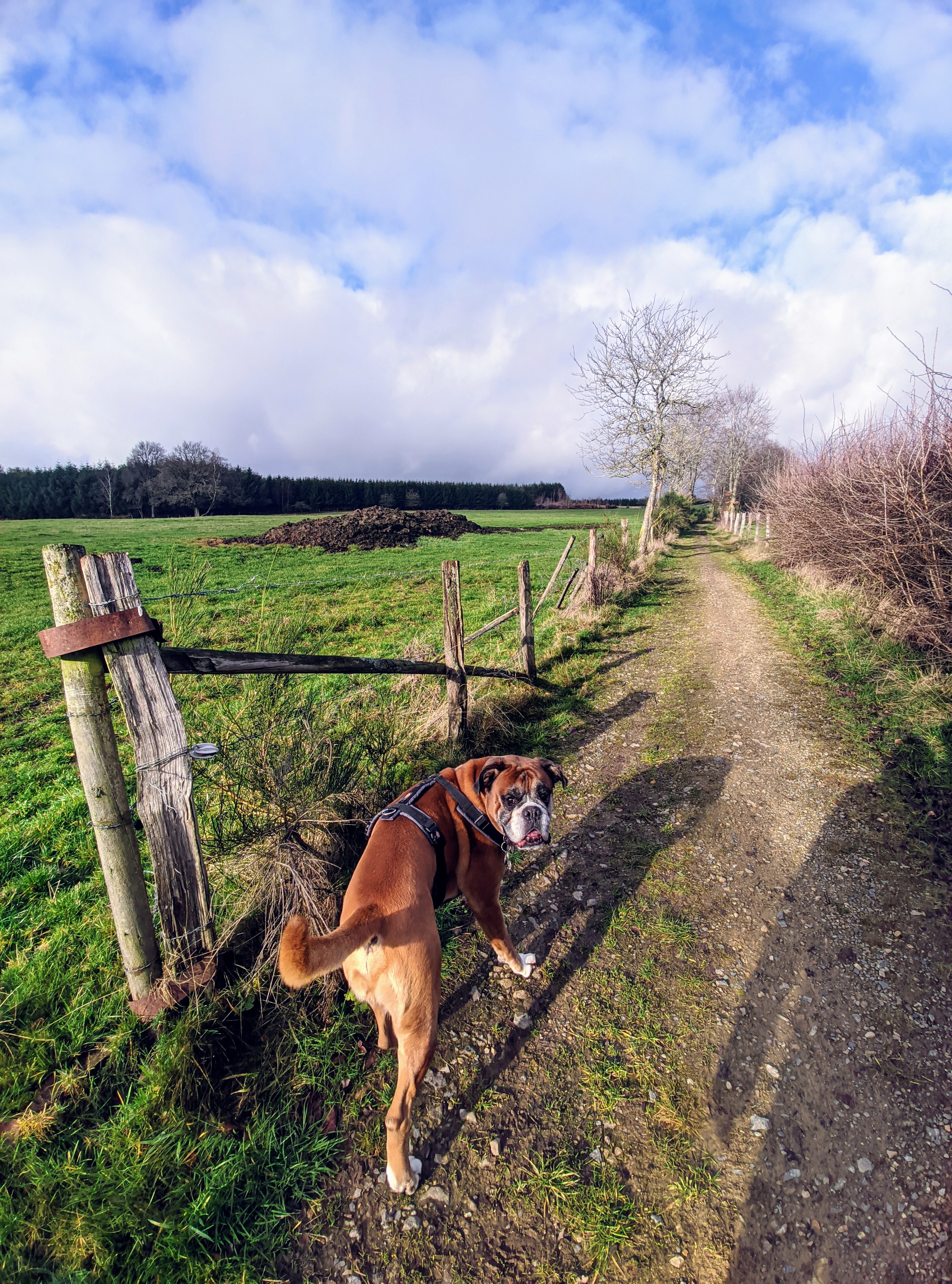 In a cabin in the mountains for a white snow-filled Christmas time. Doggy roasting herself by the fire.