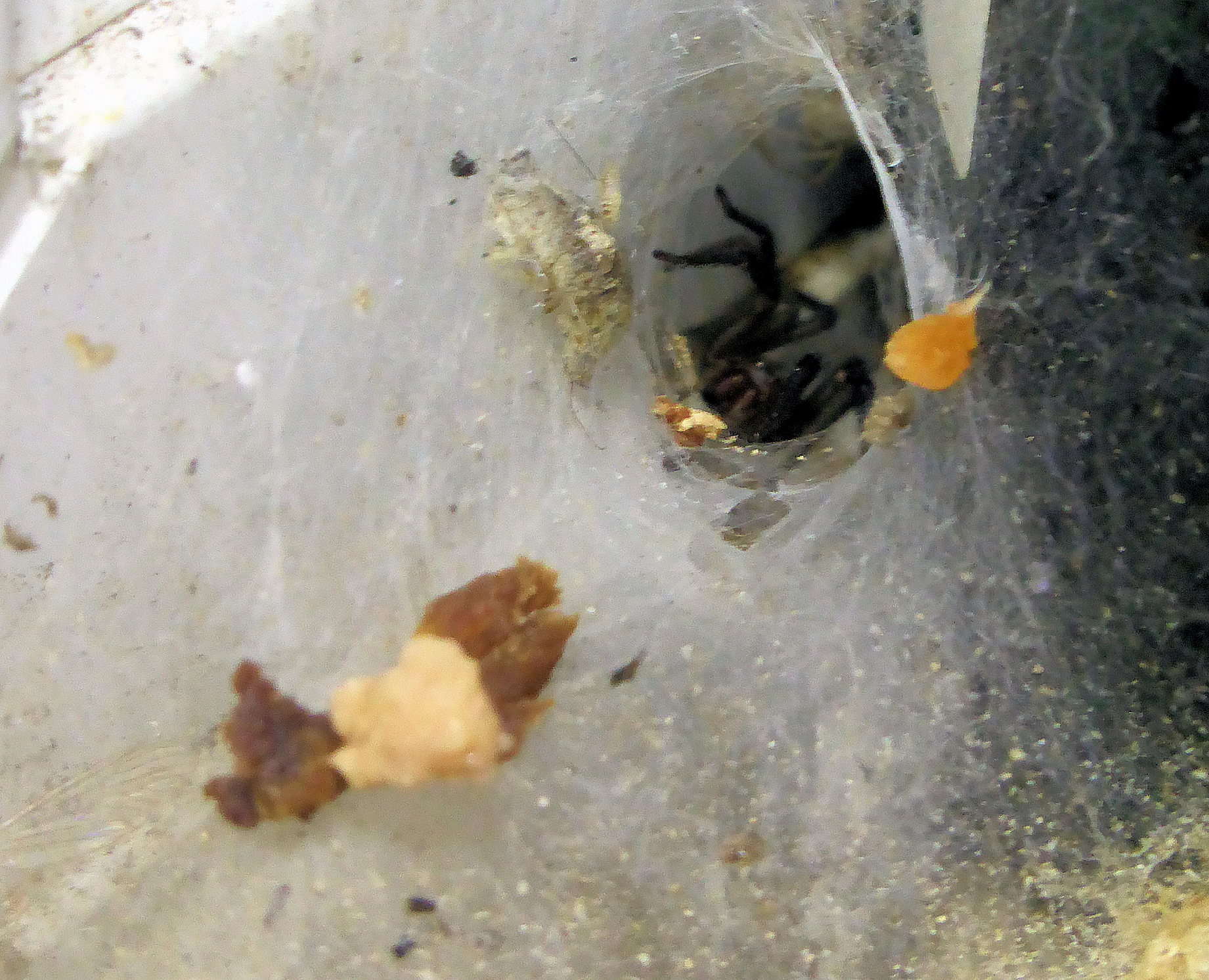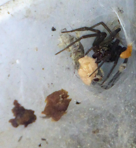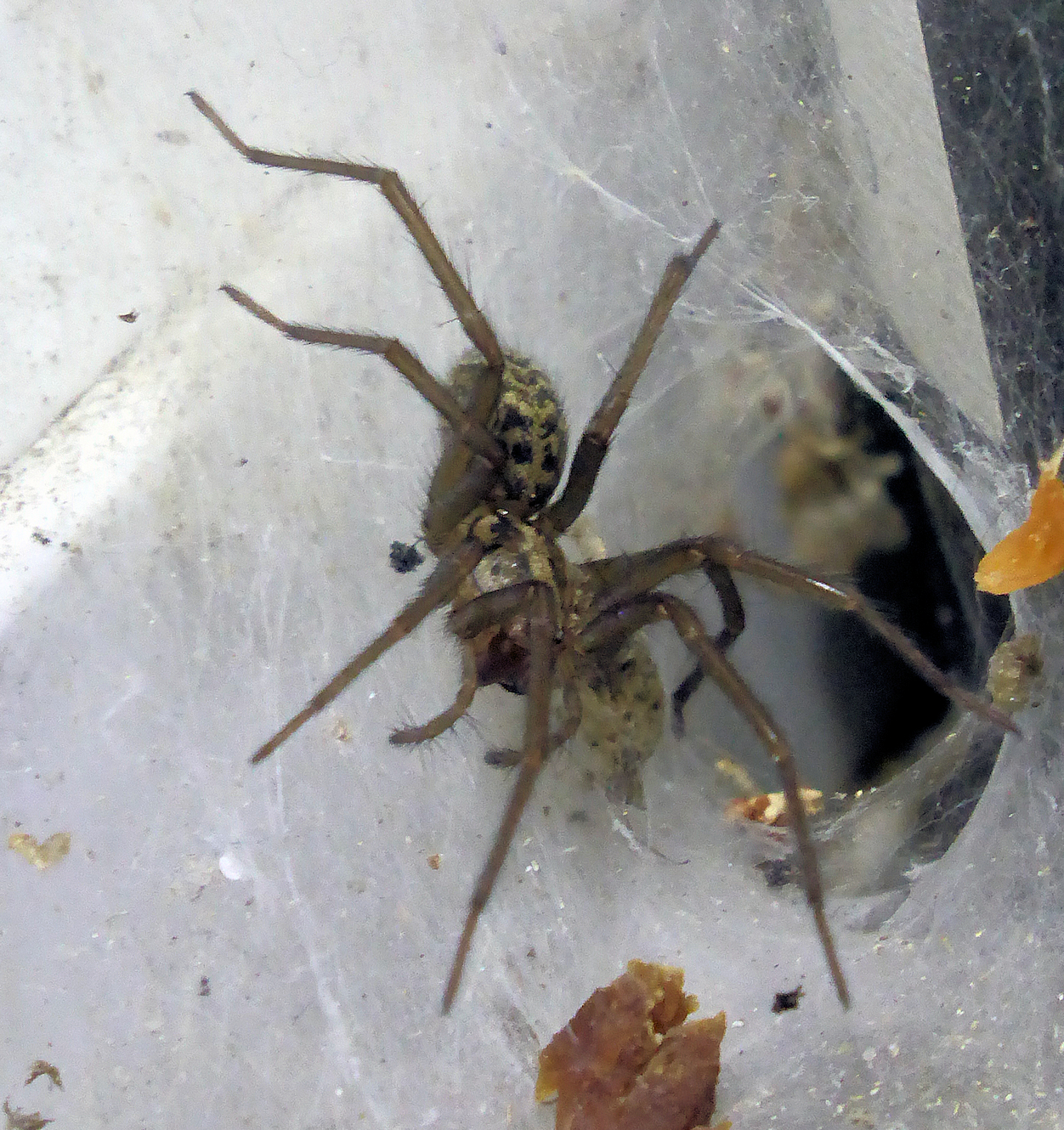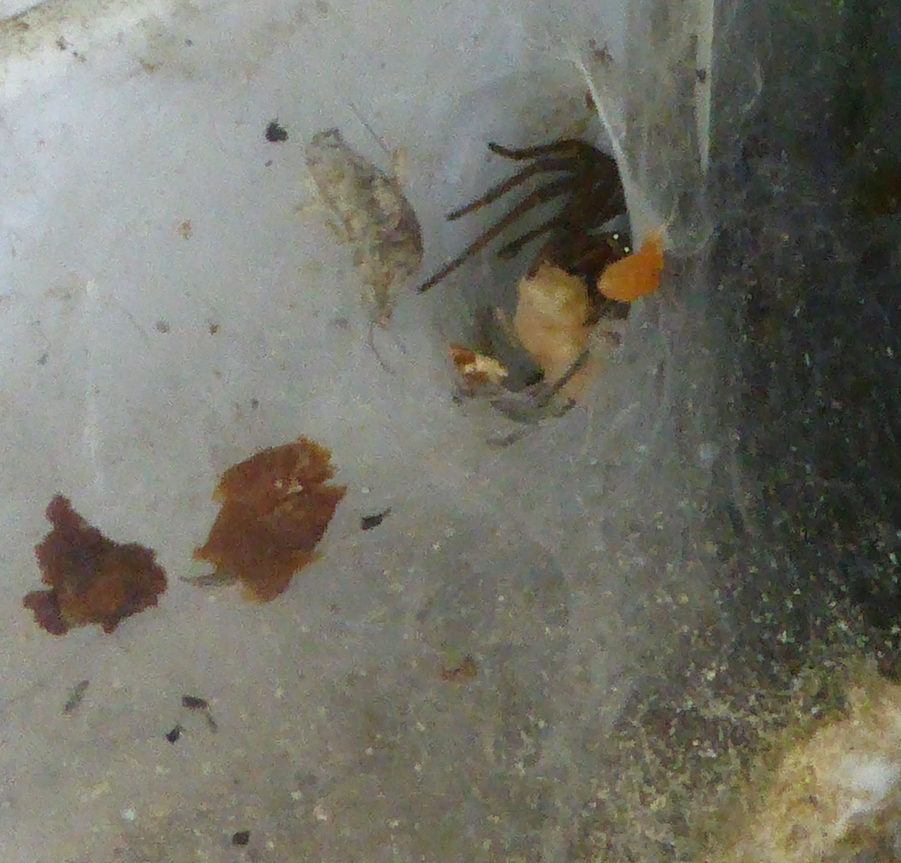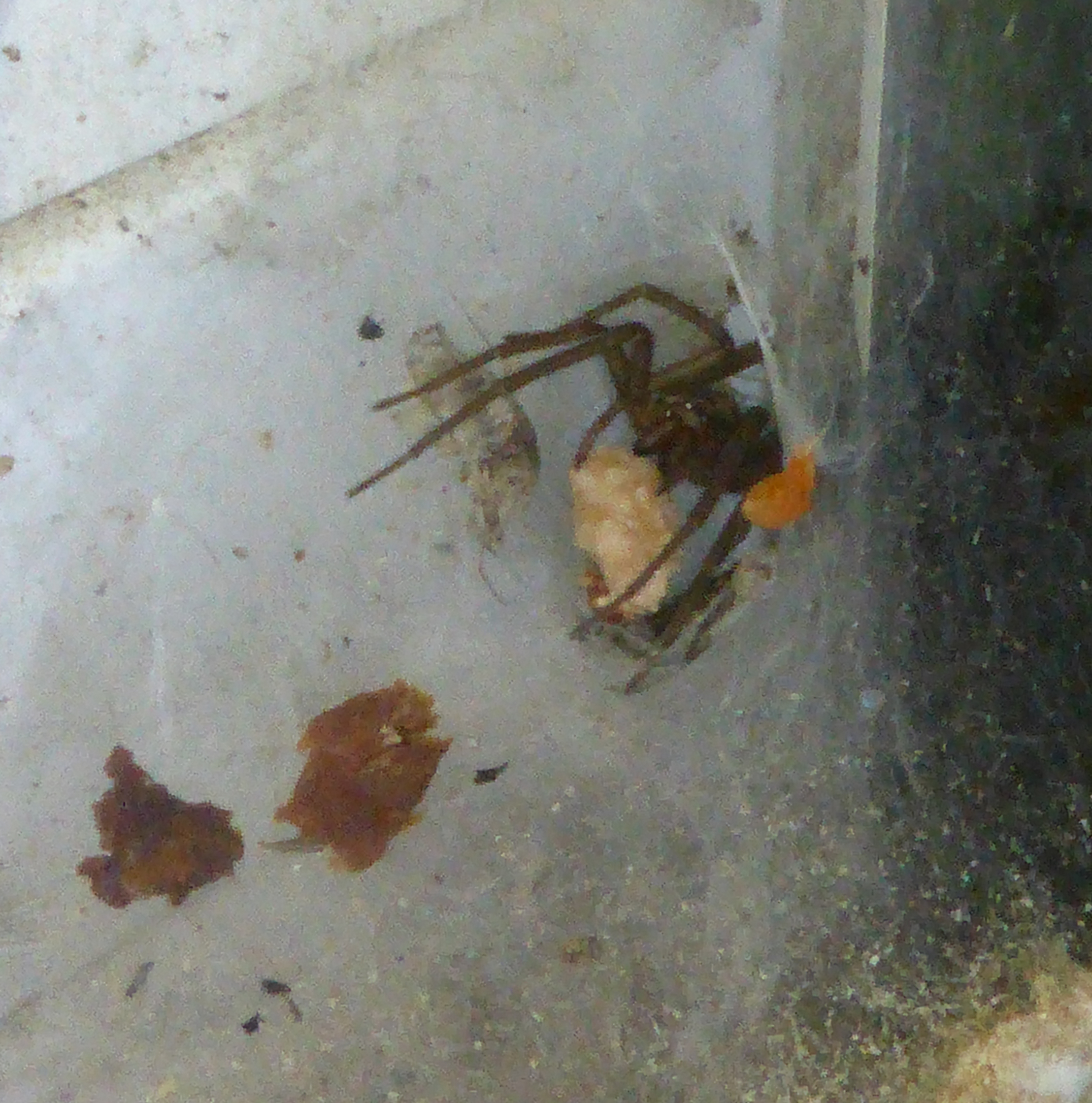 But it is cold with zero flying bugs around, so I have taken pity on this little fella. I have let him move into my old Chateau (which has seen better days). I am feeding him / her (cat food and salmon) which seems to go down well. Using tweezers to give the web an occasional clean out once a week. I have named them DQ (for damned quick). Any arachnologists able to ID it? …. Maybe the UK lockdown is finally getting to me….